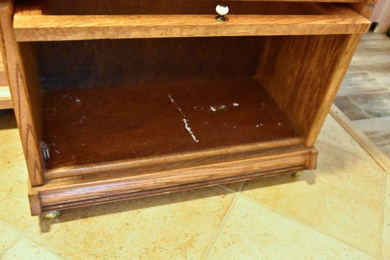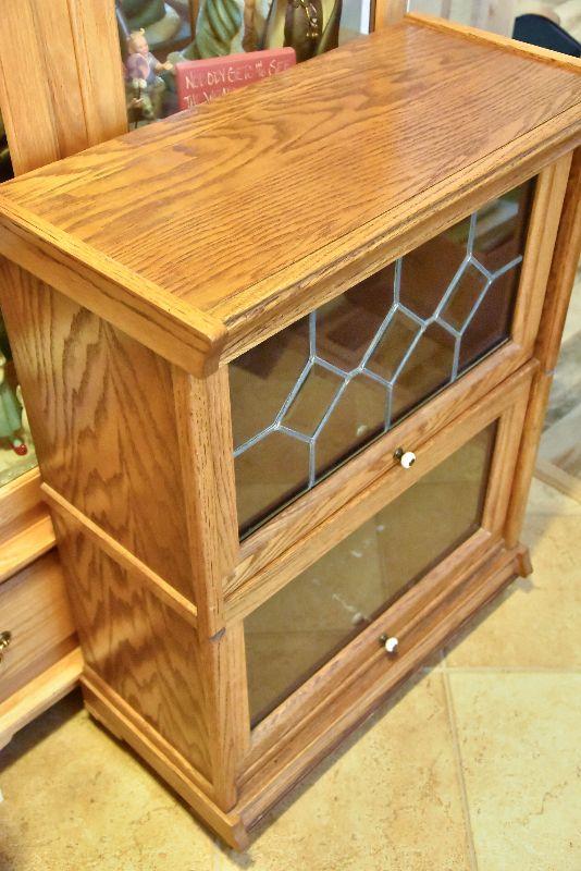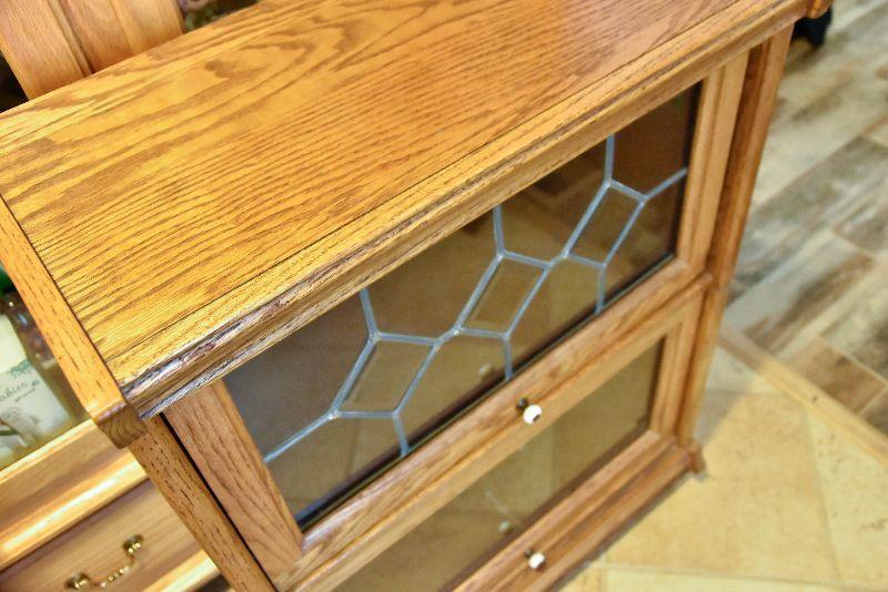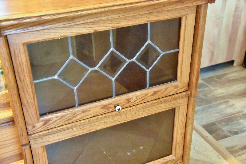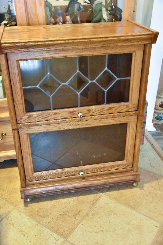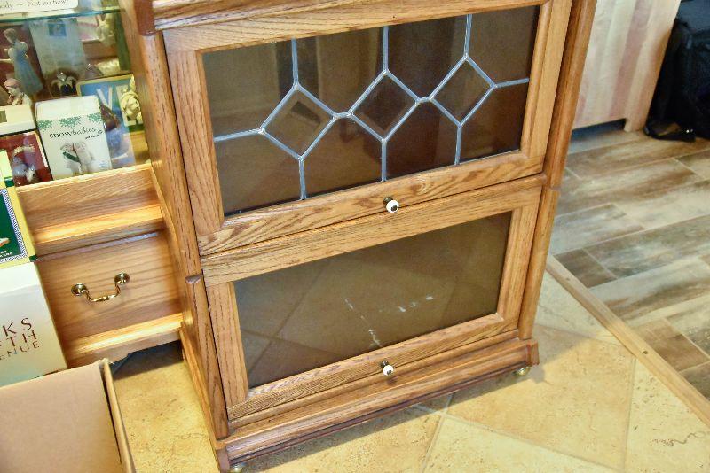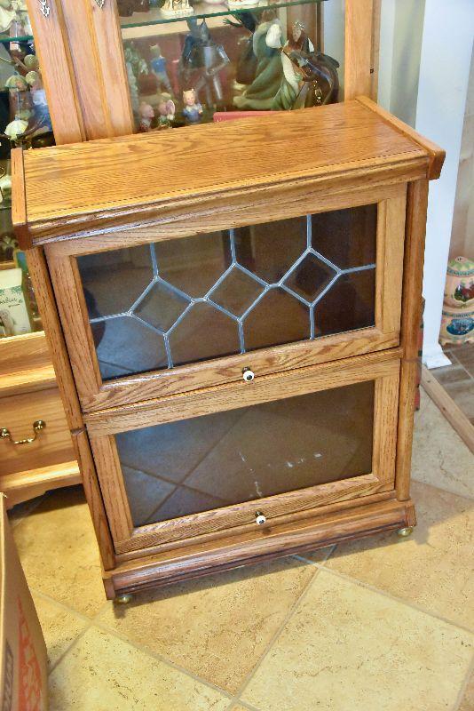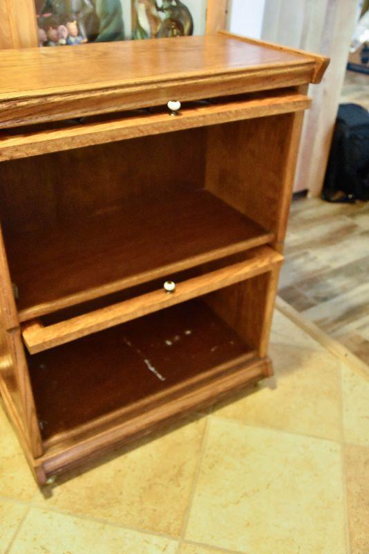 Amish created barrister-style bookshelf with sliding glass doors. This is beautifully crafted and made to last a lifetime. There is some residue on the bottom that should come up with proper cleaning. On wheels.
