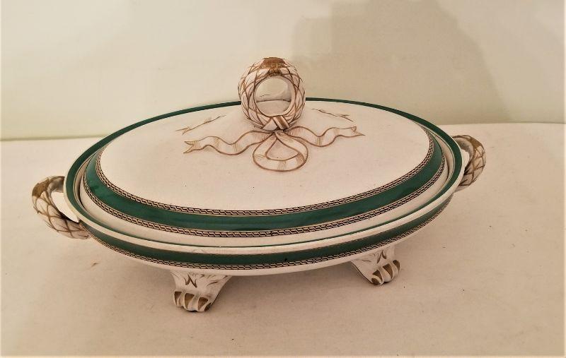 Lovely Victorian vegetable dish with lid, good antique condition, Green/gold palette. 14" across.