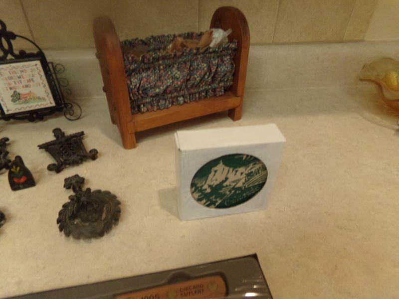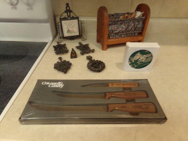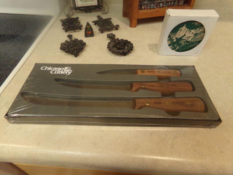 NEW CHICAGO CUTLERY KNIFE SET, COASTERS (NIB), VARIETY OF TRIVETS, NAPKIN HOLDER