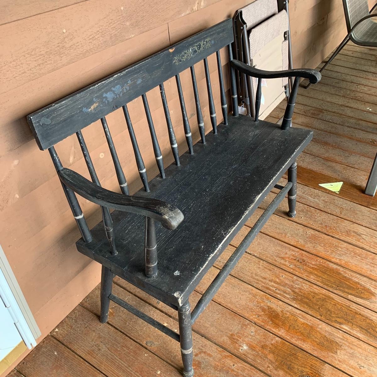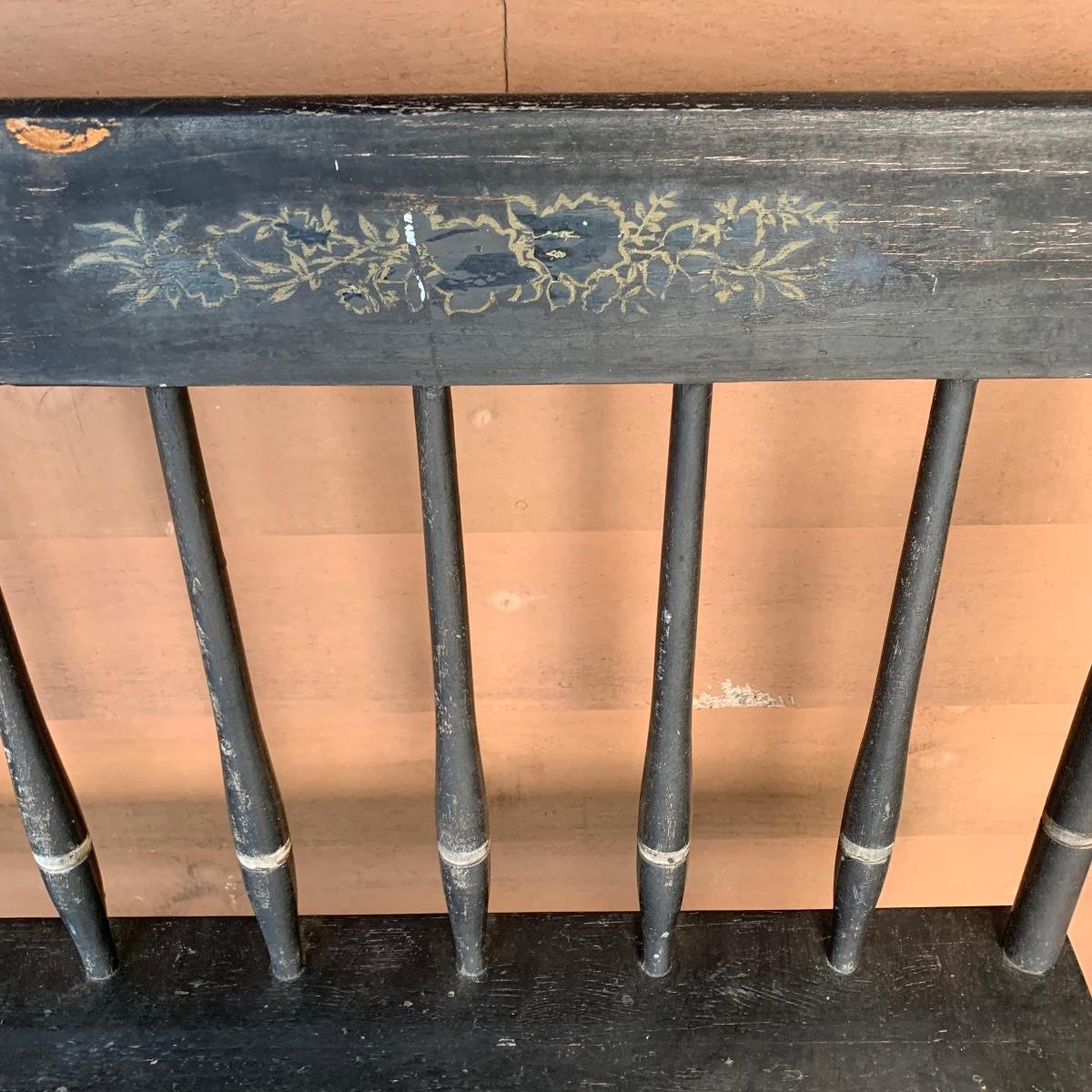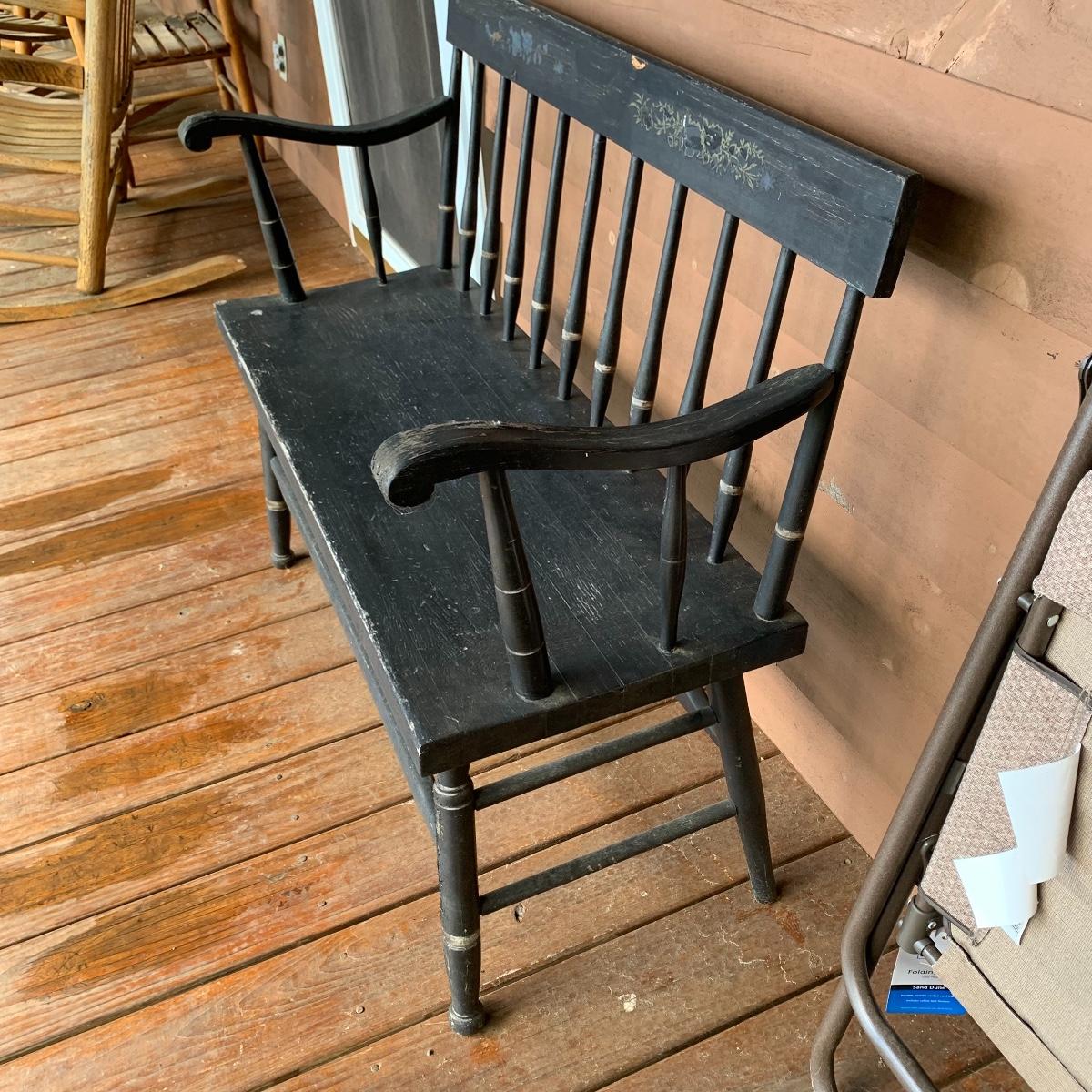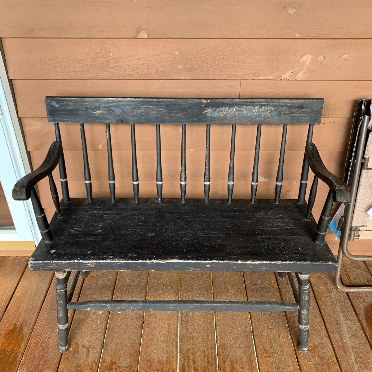 Add a touch of historic charm with this classic colonial style bench. This piece features turned spindles, curved armrests, and matte black paint. On the top of the back rest is the remnants of a gold, floral design (see pics). This bench measures 39” wide X 15” deep X 38” tall. There is some chipping paint, but other then that, this piece of furniture is in good condition.