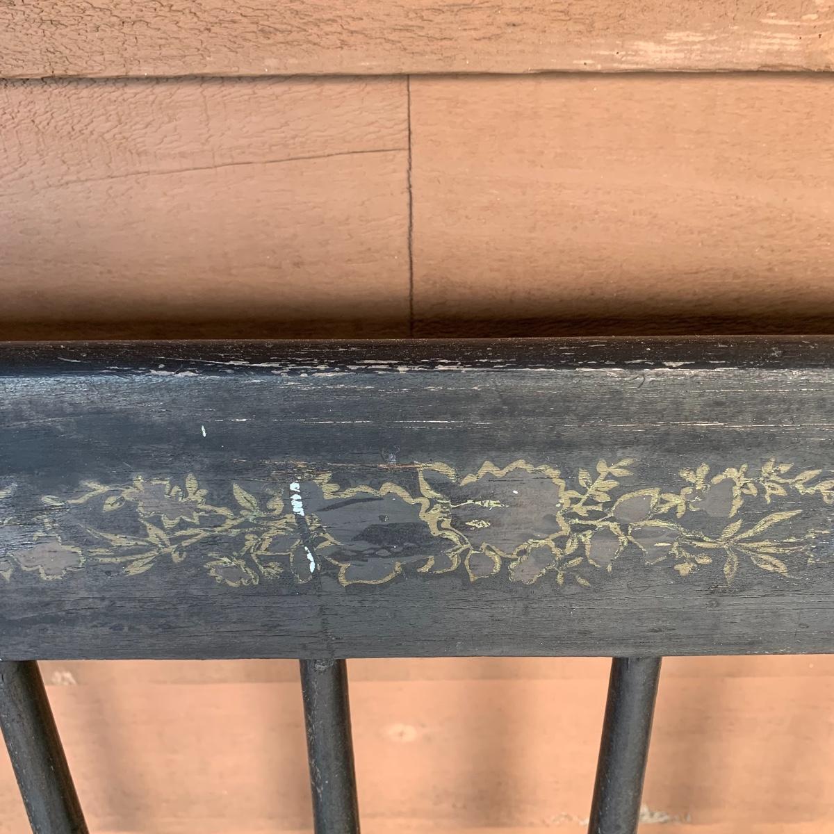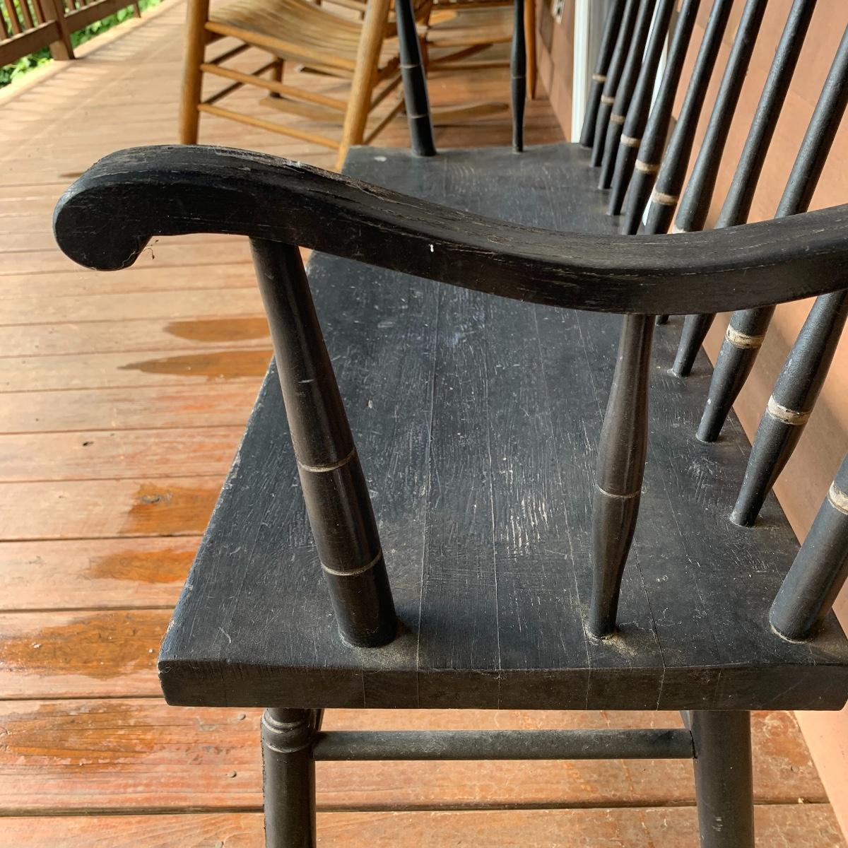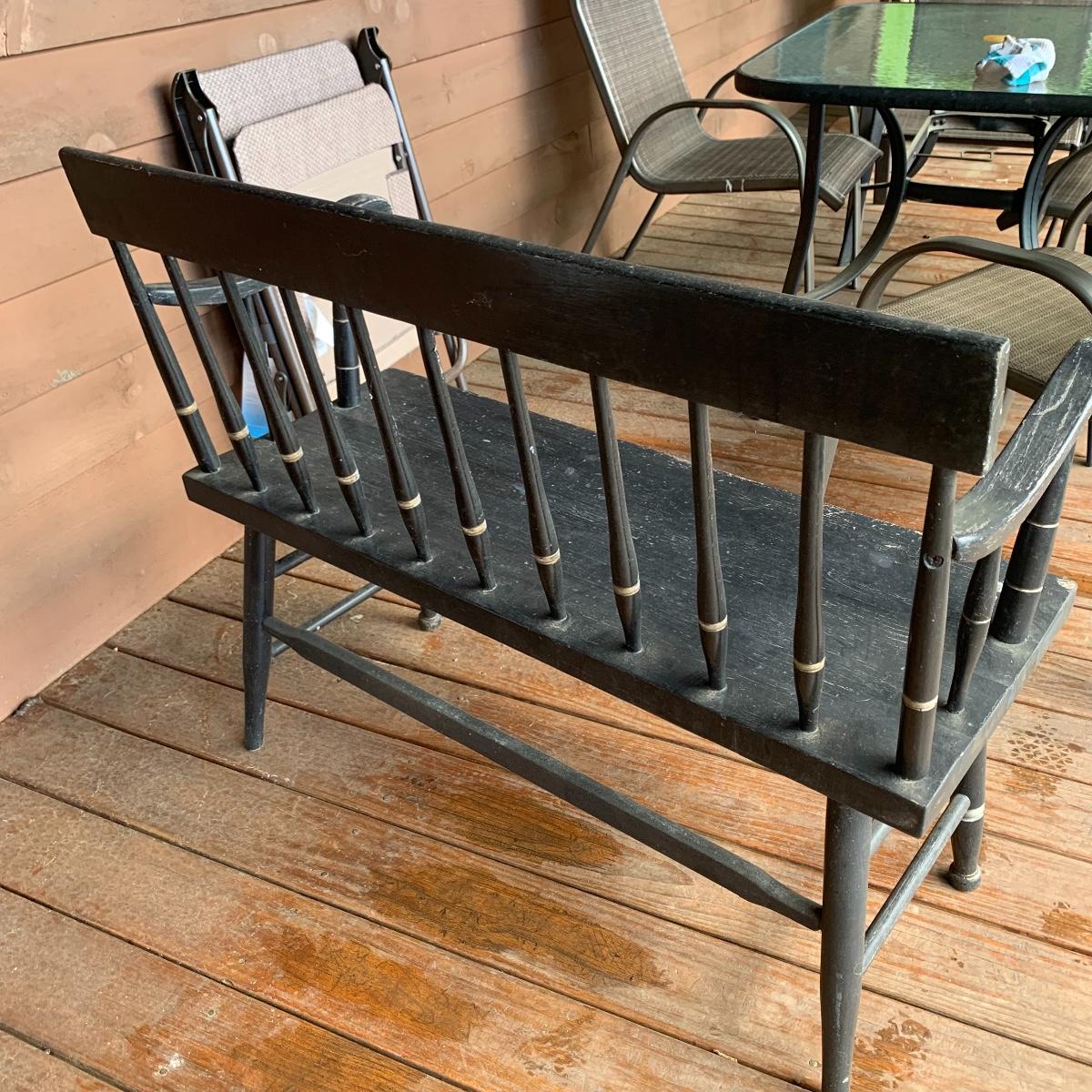 Add a touch of historic charm with this classic colonial style bench. This piece features turned spindles, curved armrests, and matte black paint. On the top of the back rest is the remnants of a gold, floral design (see pics). This bench measures 39” wide X 15” deep X 38” tall. There is some chipping paint, but other then that, this piece of furniture is in good condition.
