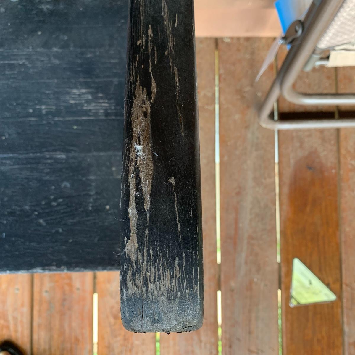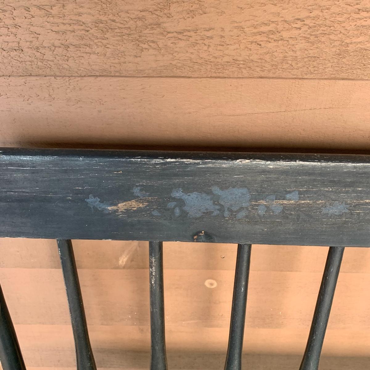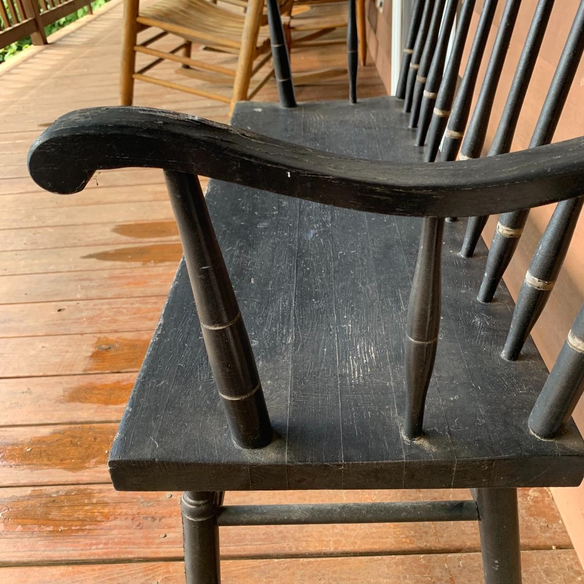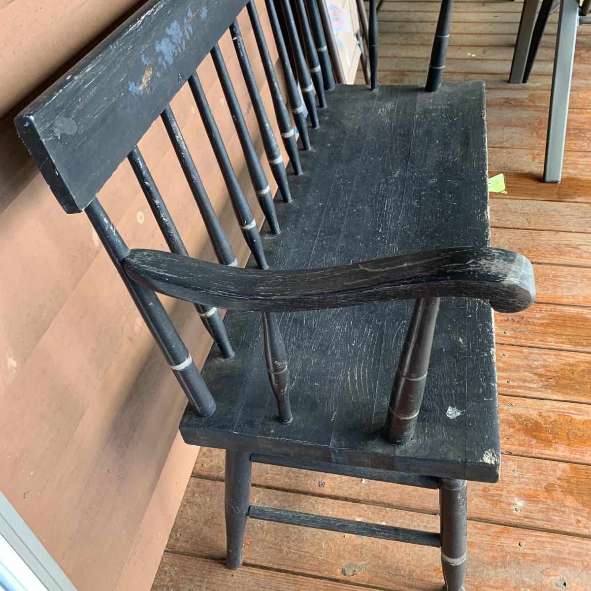 Add a touch of historic charm with this classic colonial style bench. This piece features turned spindles, curved armrests, and matte black paint. On the top of the back rest is the remnants of a gold, floral design (see pics). This bench measures 39” wide X 15” deep X 38” tall. There is some chipping paint, but other then that, this piece of furniture is in good condition.