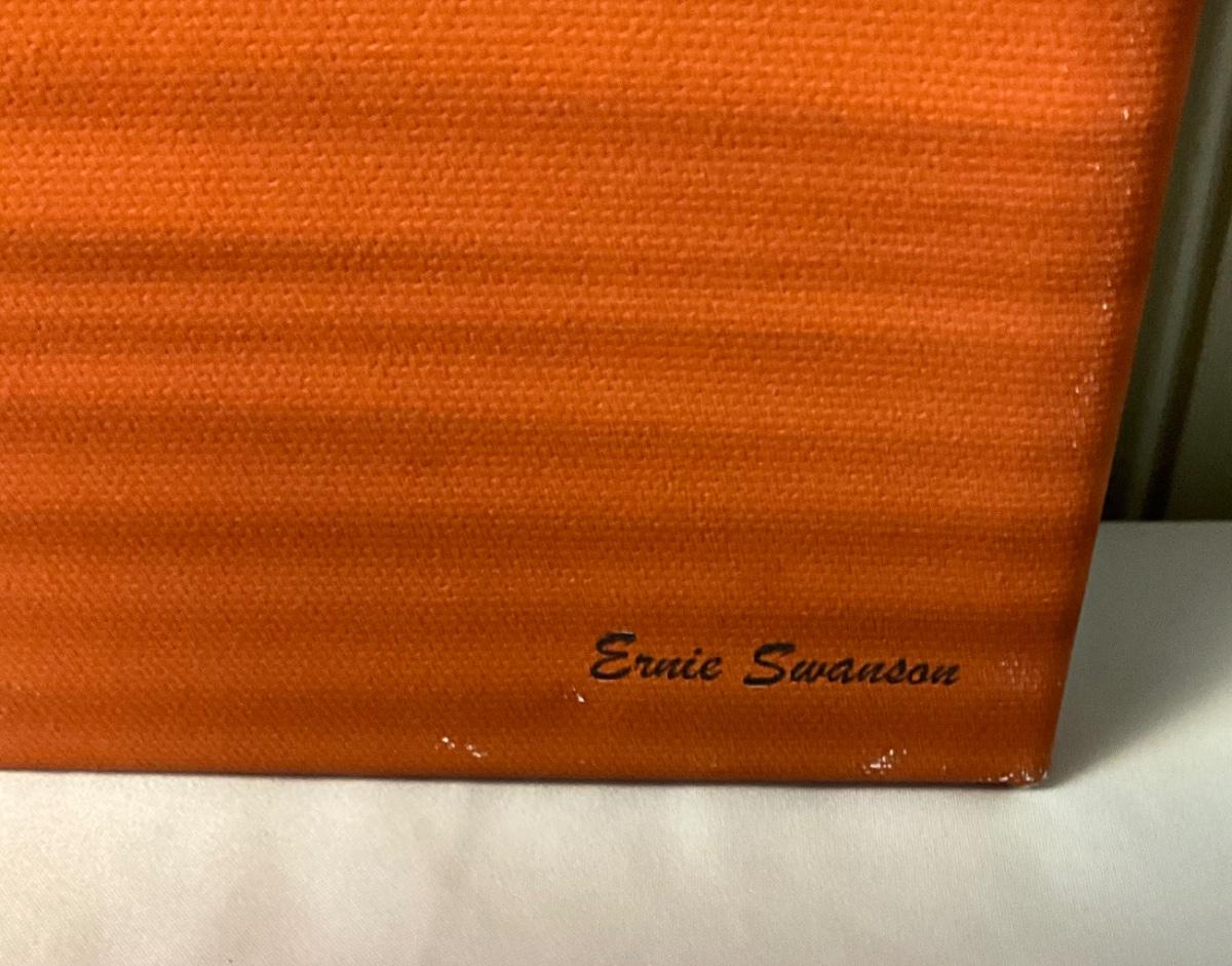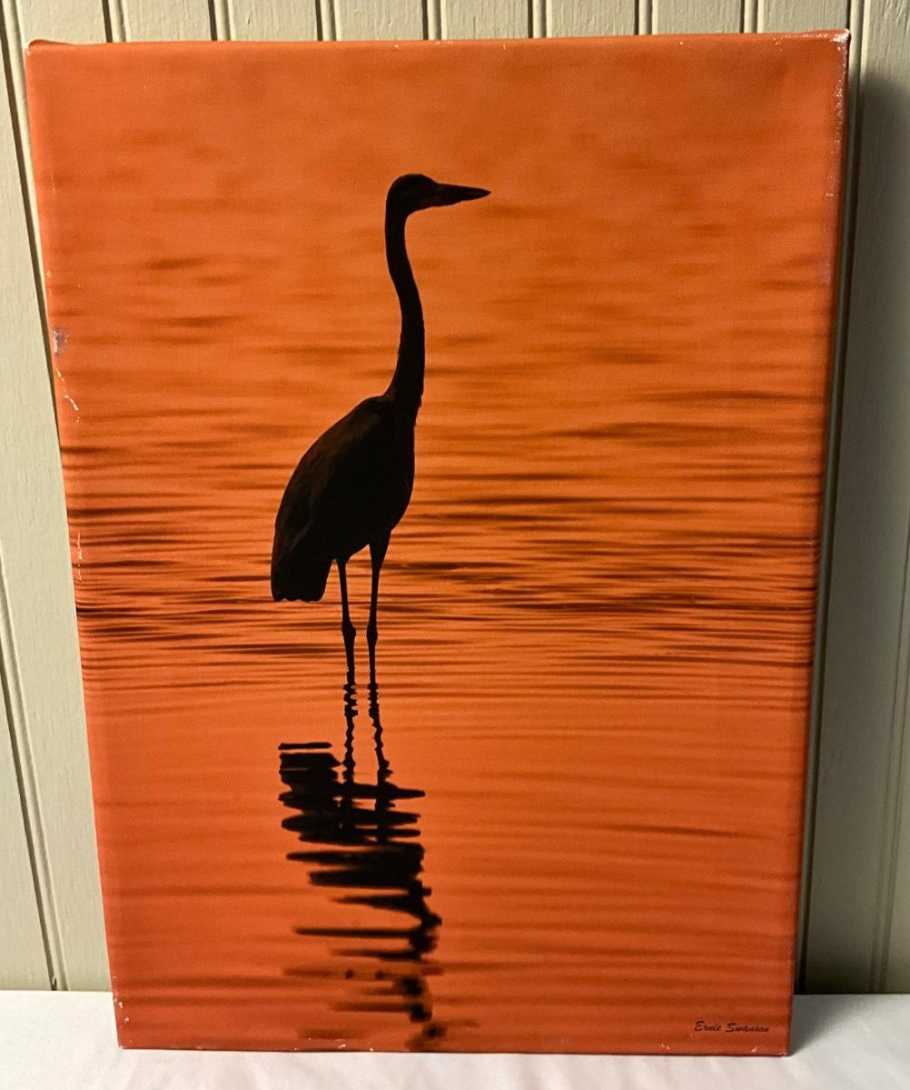 Heron At Sunset photograph on canvas stamped Ernie Swanson. Measures 17 inches tall and 12 inches wide
