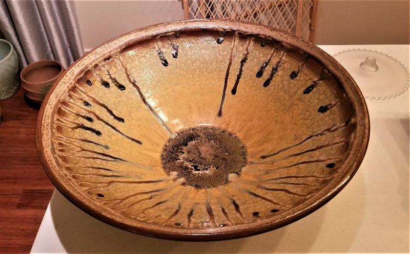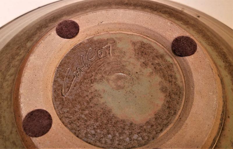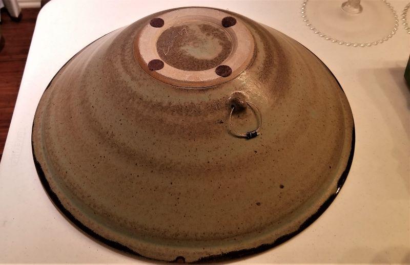 This very attractive studio pottery bowl had an indistinguishable signature on the reverse - also a metal loop for displaying. Measures a generous 18.5" across. Southwest look. Good condition.