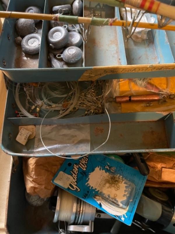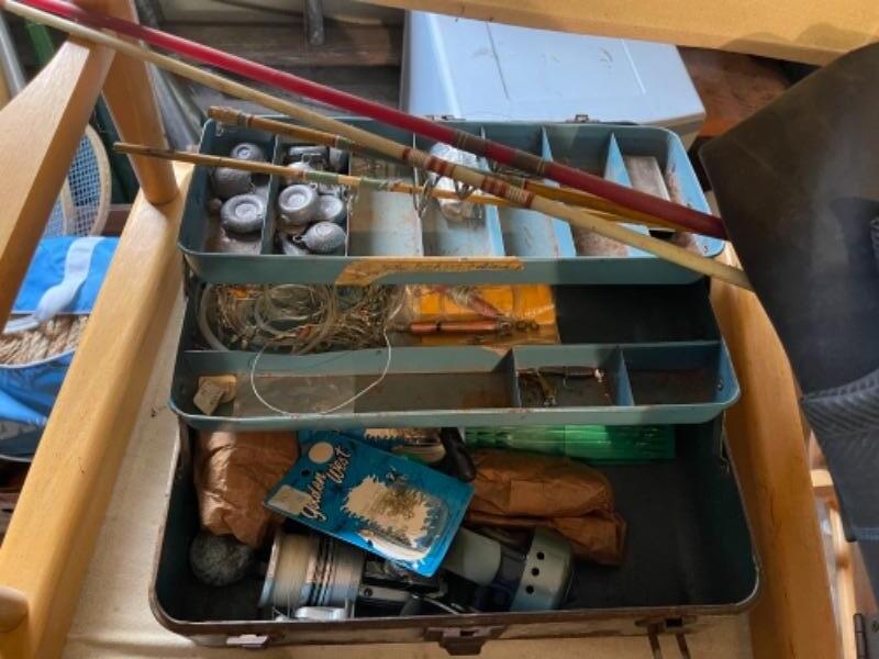 Lot 171. Lot of fishing gear, poles, inner tubes, director chairs, folding shovel, etc.--$30
