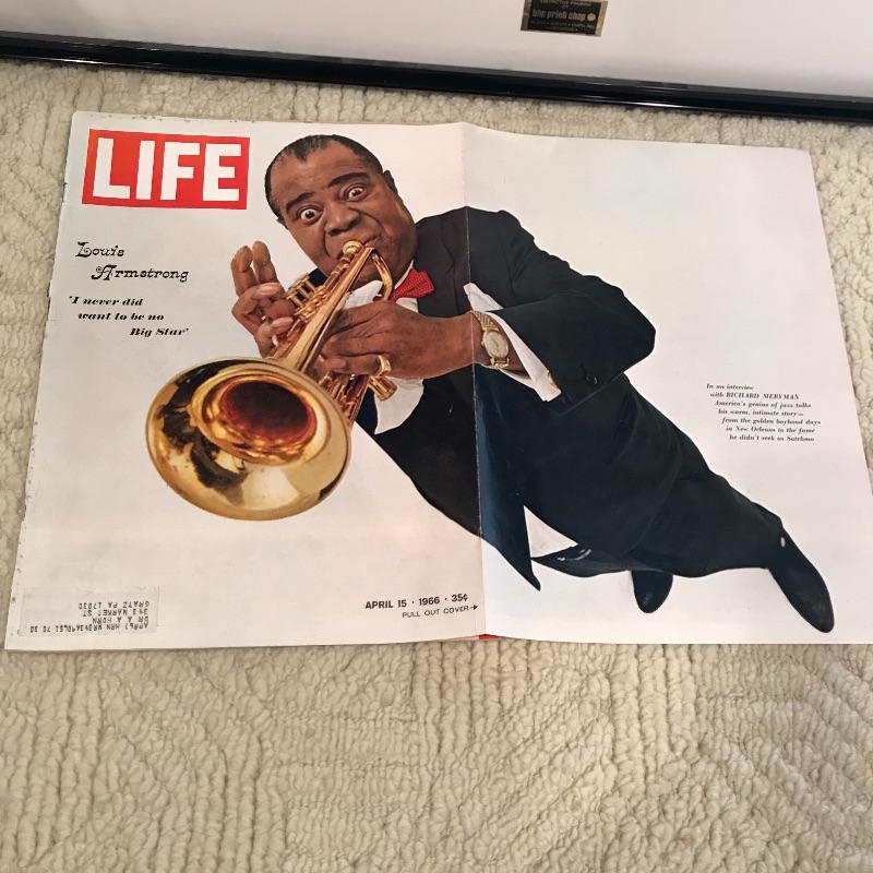 Legendary artist Louis Armstrong lives on in this collection! Fourteen albums, mostly kept in manufacturer’s protective sleeve and although not professionally graded, appear to be in great shape. Effanbee doll is approximately 16” tall with stand. Instrument on statue is in two pieces, but appears to be easily attached. Lot also includes April 1966 issue of Life Magazine featuring the legend. It’s still in one piece, but cover is becoming loose. Last but not least, a large impressive 35.25” x 21” black and white poster complete the collection. Shipping available.