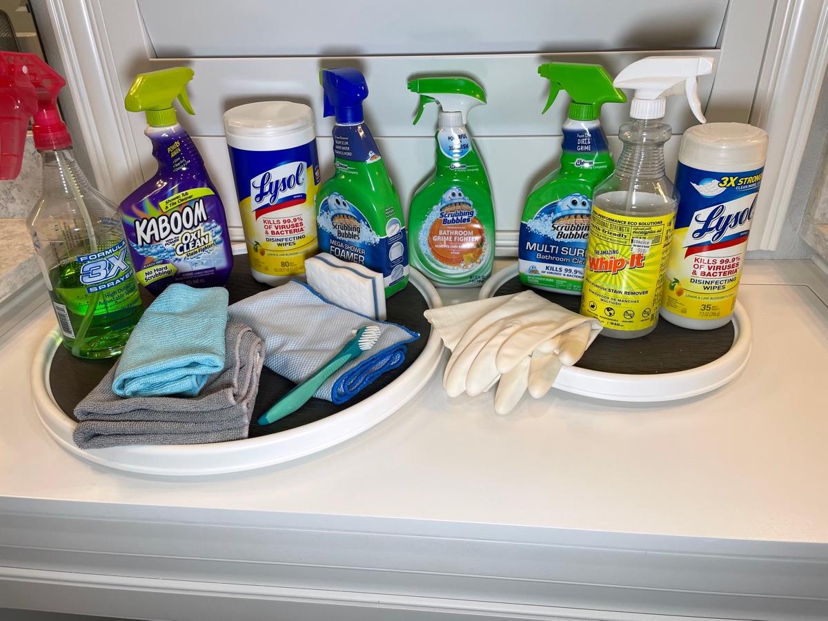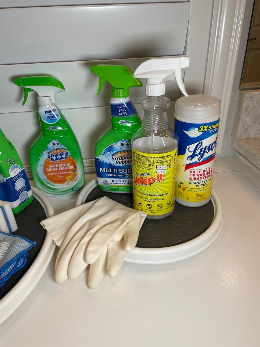 Two turntables, full bottles of lots of different cleaning products and several microfiber glass towels, plus rubber gloves