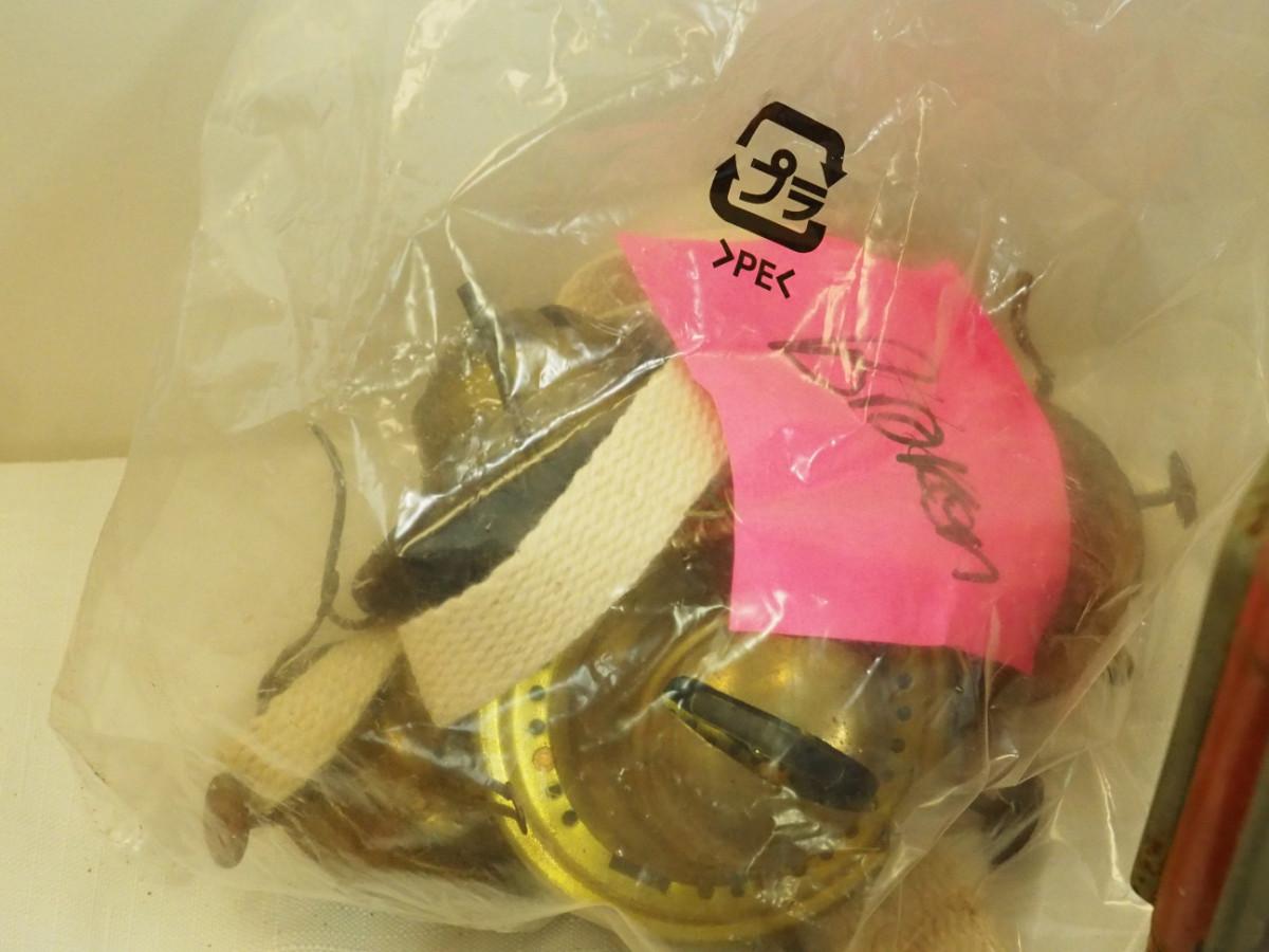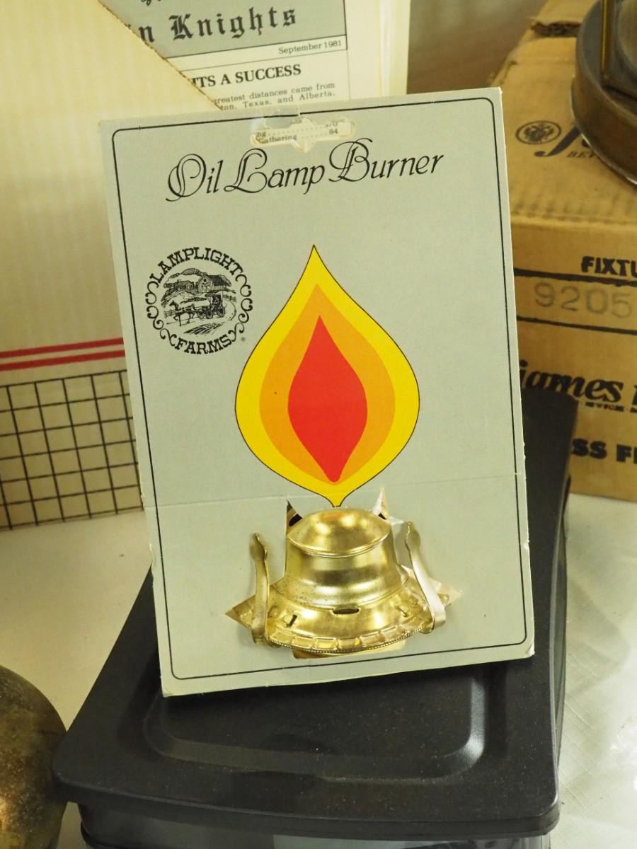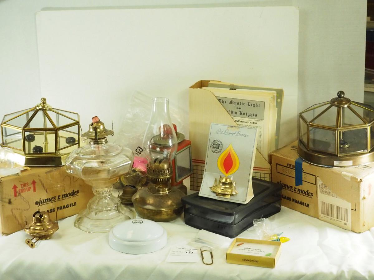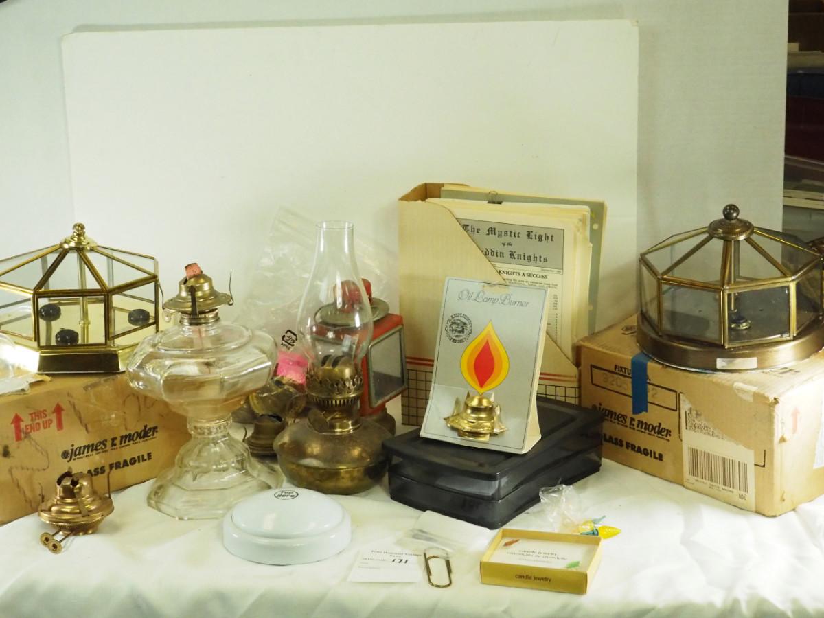 Lot 171- Oil lamps, vintage 1970 electric ceiling lights, broken flat wick burners for parts. Lantern untested, New burner, touch light, Mystic Knight Aladdin oil lamp newsletters