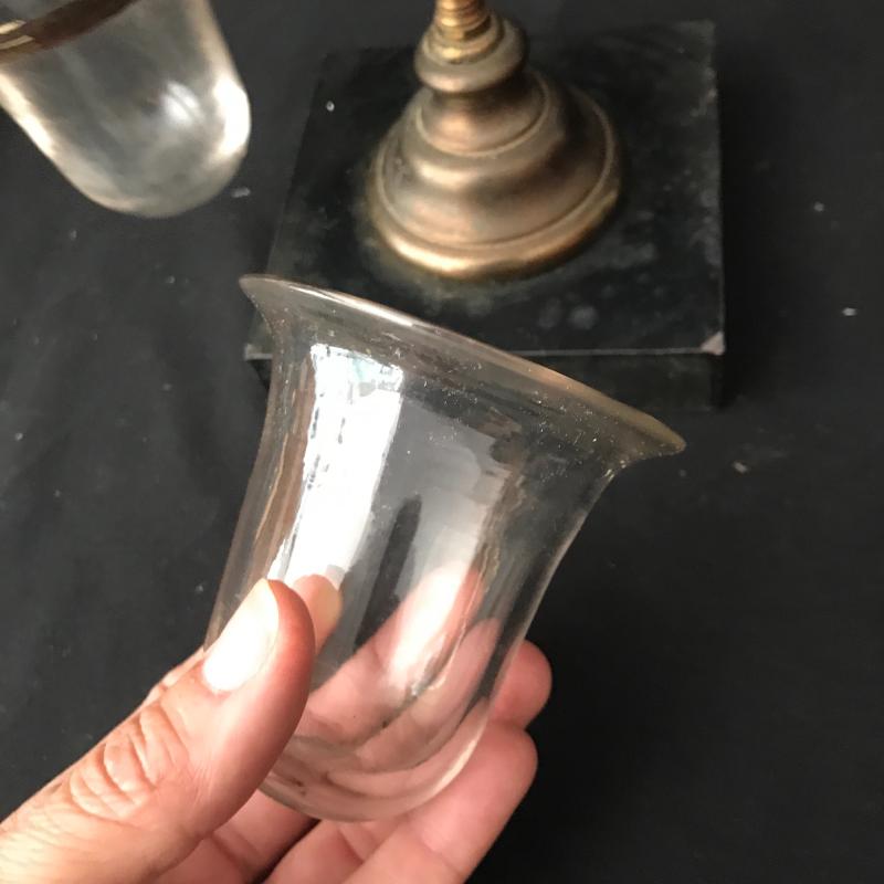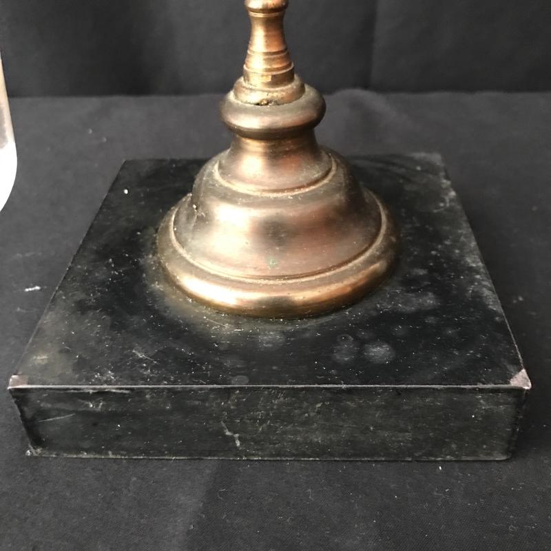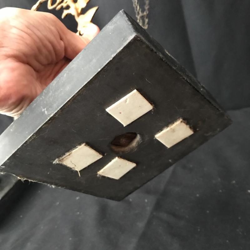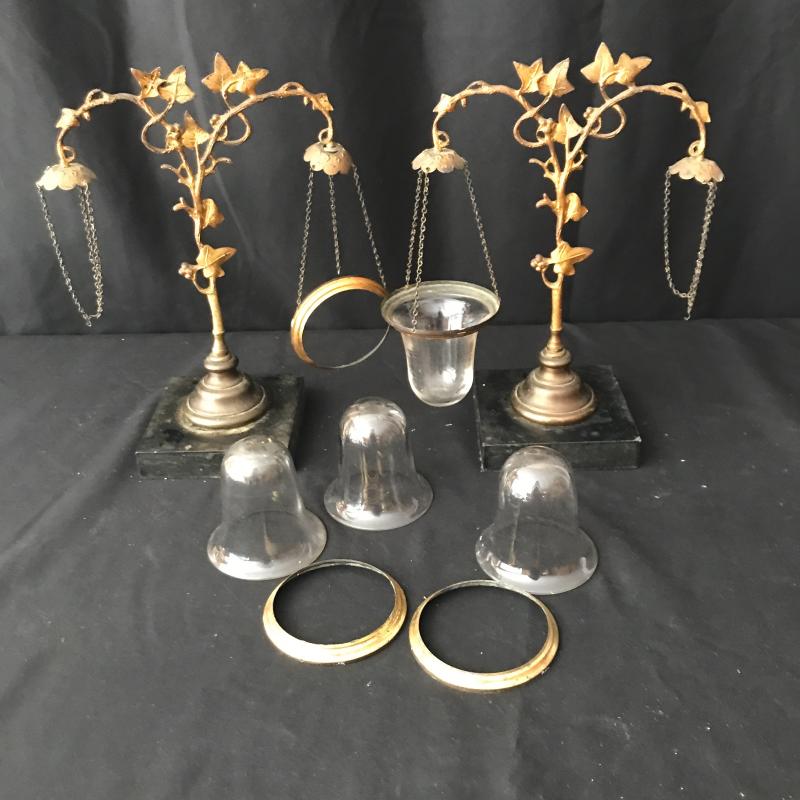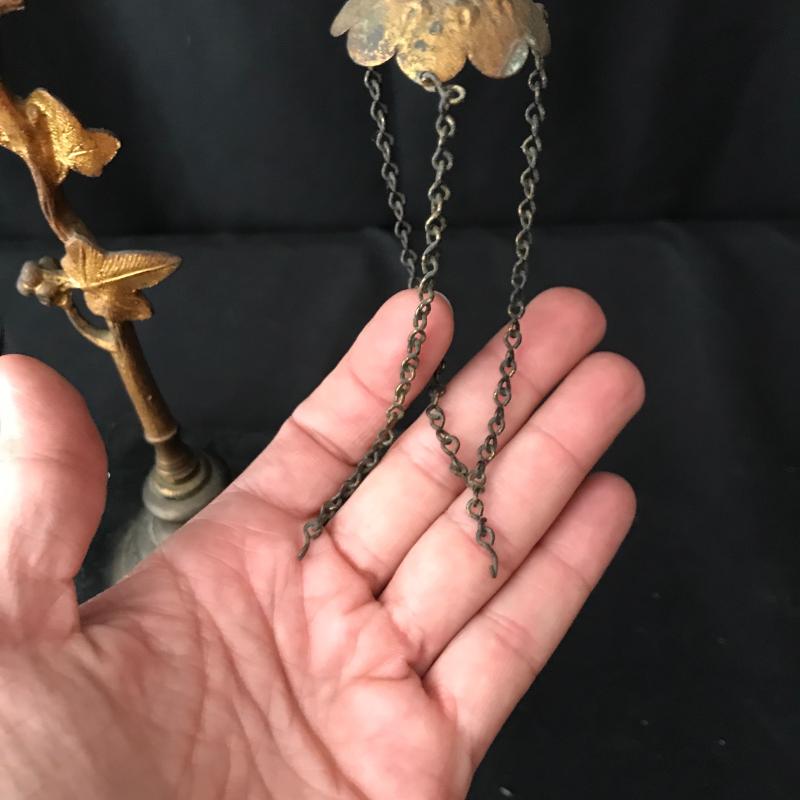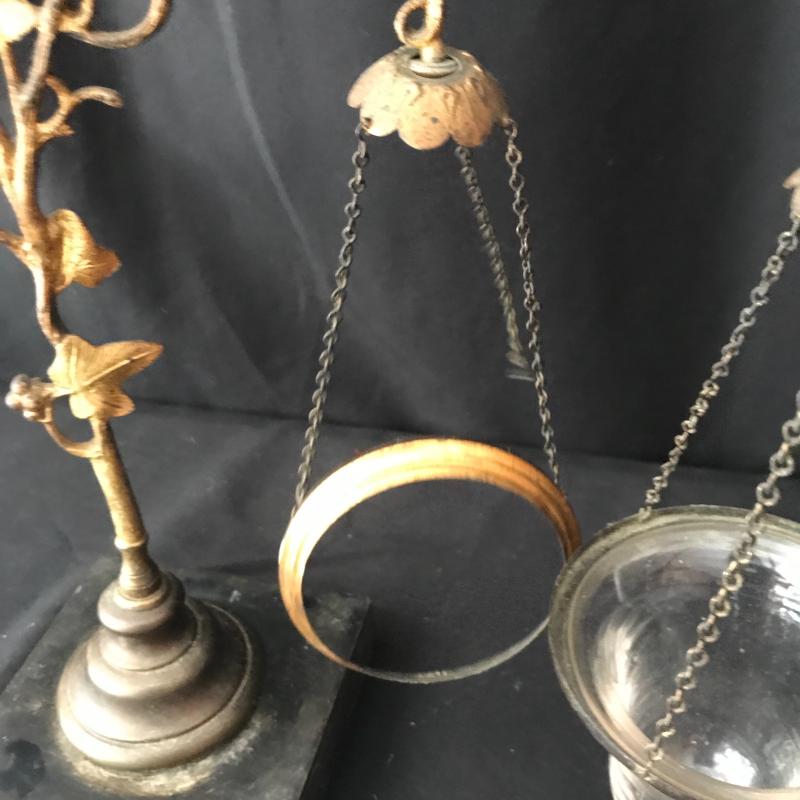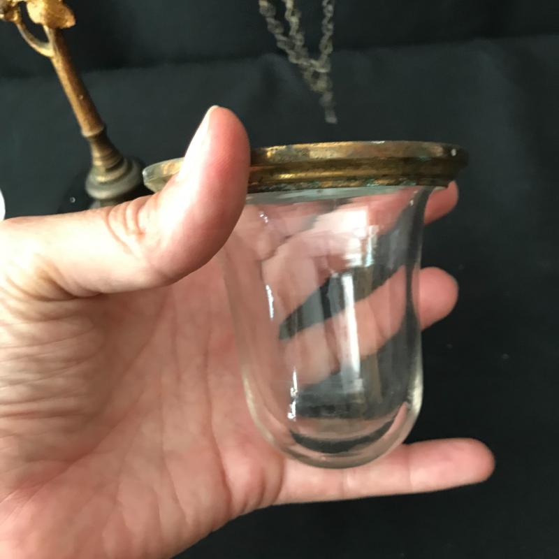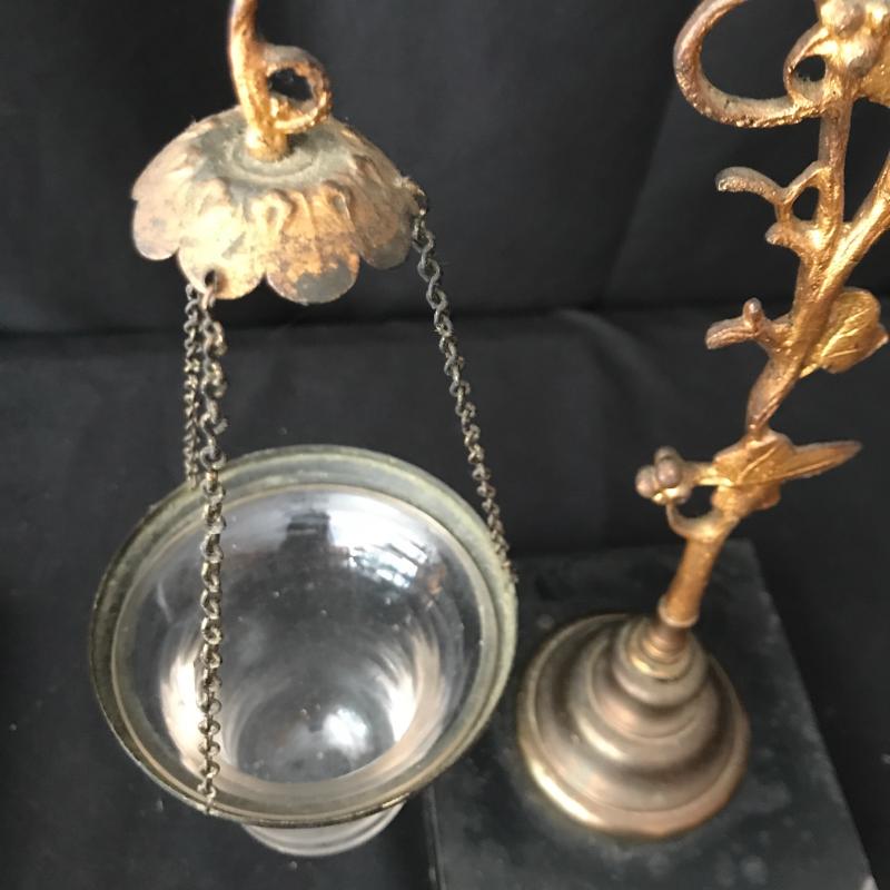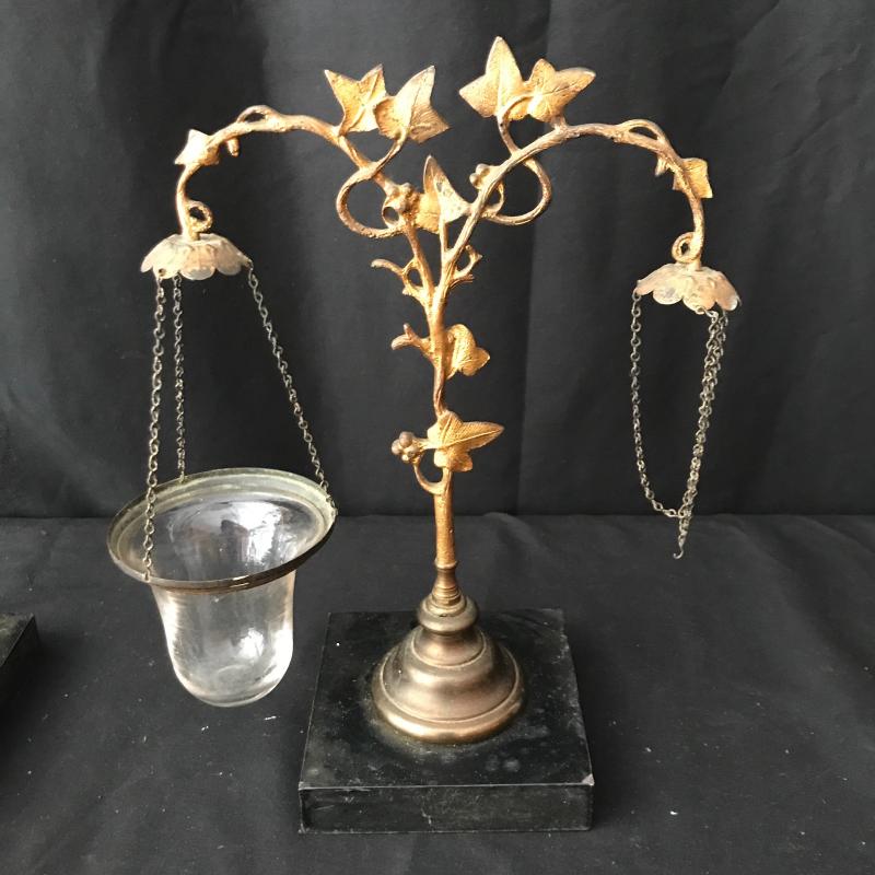 These glass candles holders hang on chains connected to a lovely orate gold piece. The chains need repair to hold the other three glass bowls. Be creative and use to hold other things. This is not something you can easily find in stores! Just needs a little love to bring this one back. 9”wide by 11.5” tall. Sits on a 4.5”square base. Shipping available