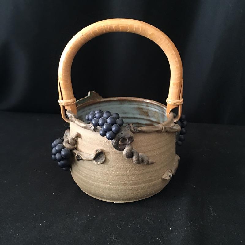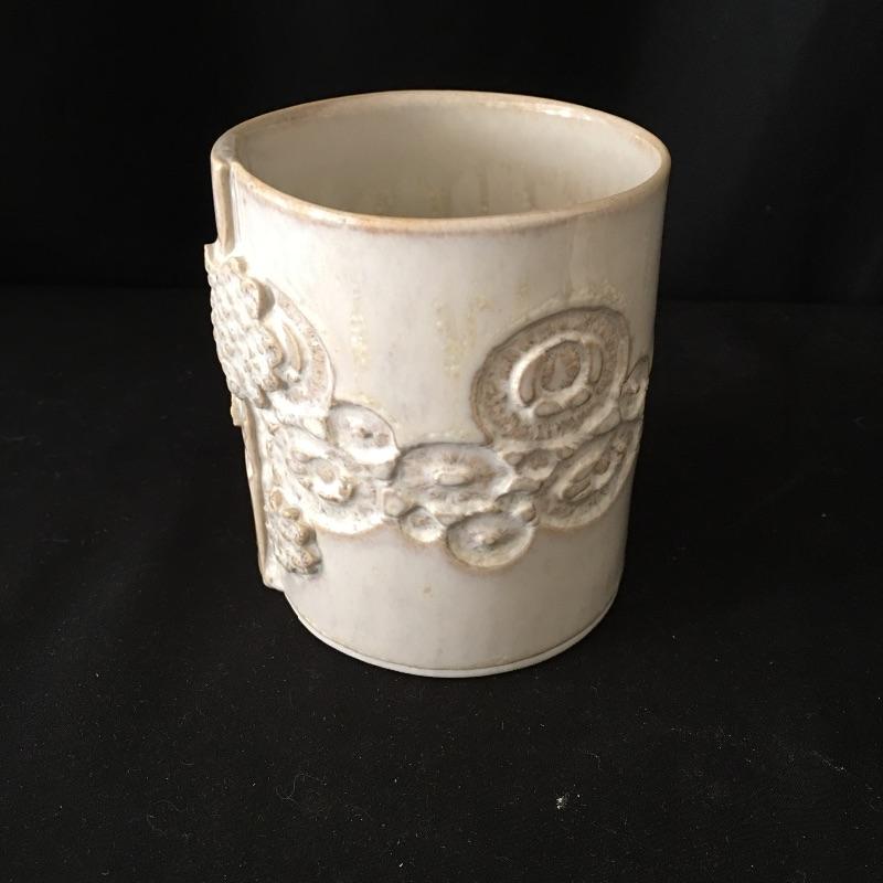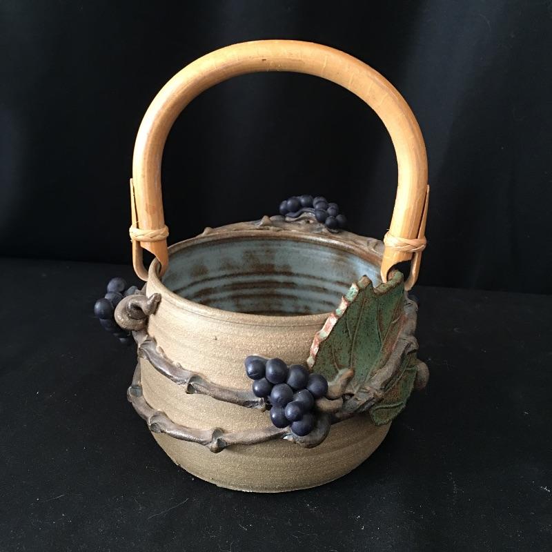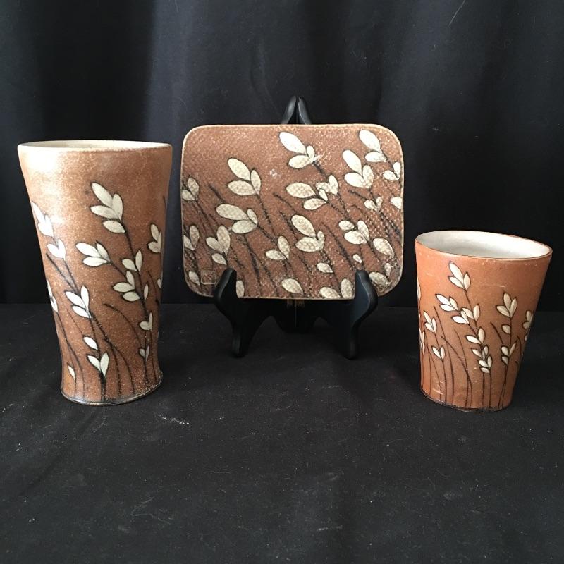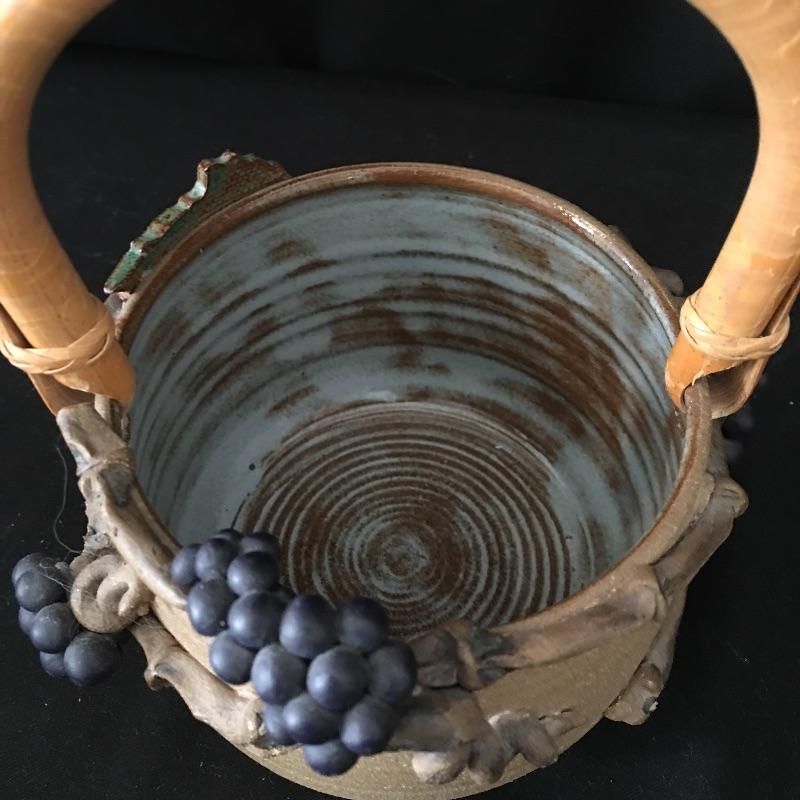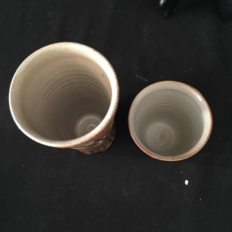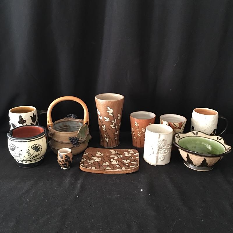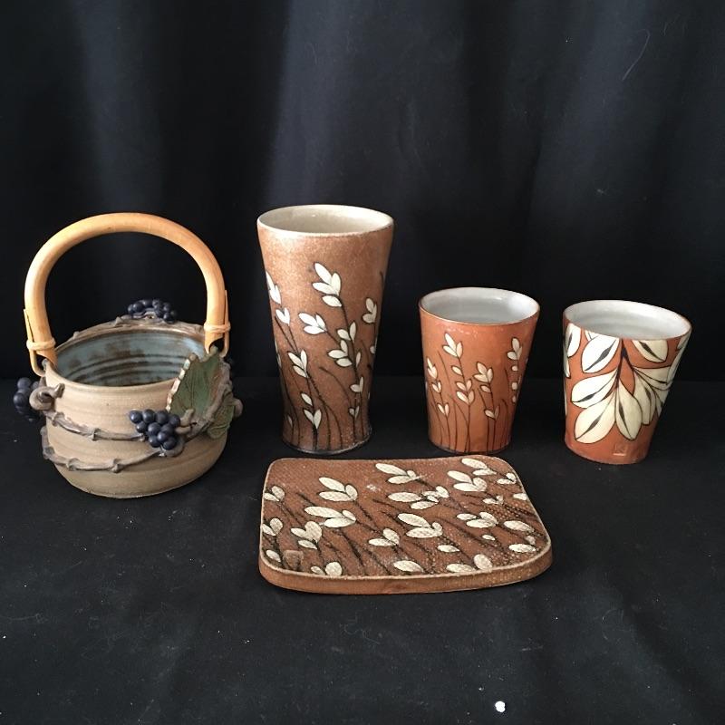 This collection of pottery includes three cups, trivet, mini vase, three mugs, bowl, basket and a cup with slots in the side. All pieces are signed, see pictures. Tallest cup measures 3.5”D x 6.5” tall.