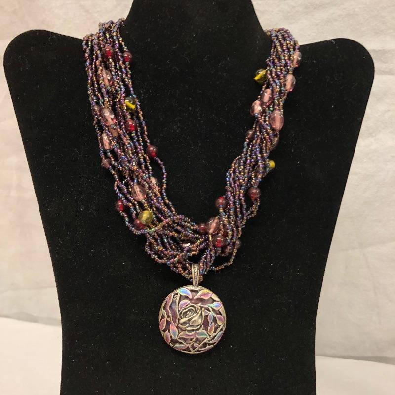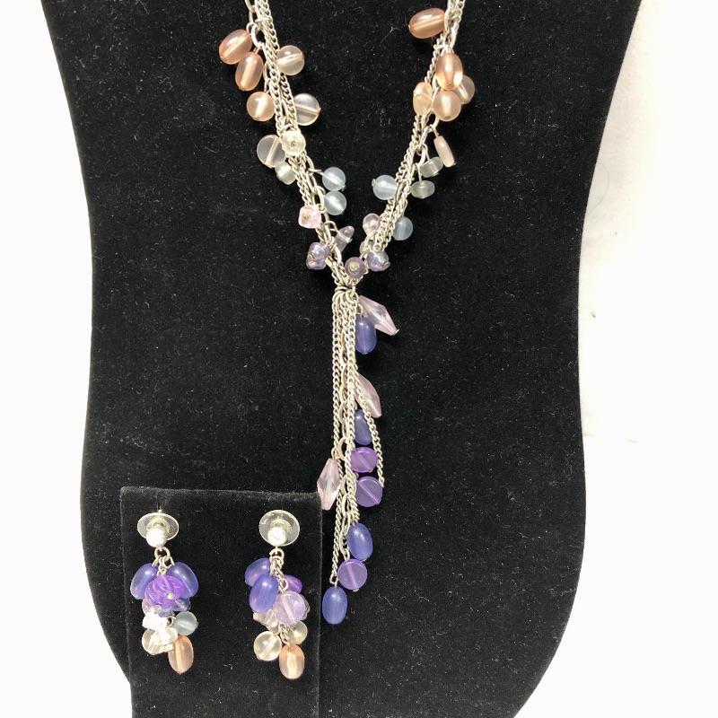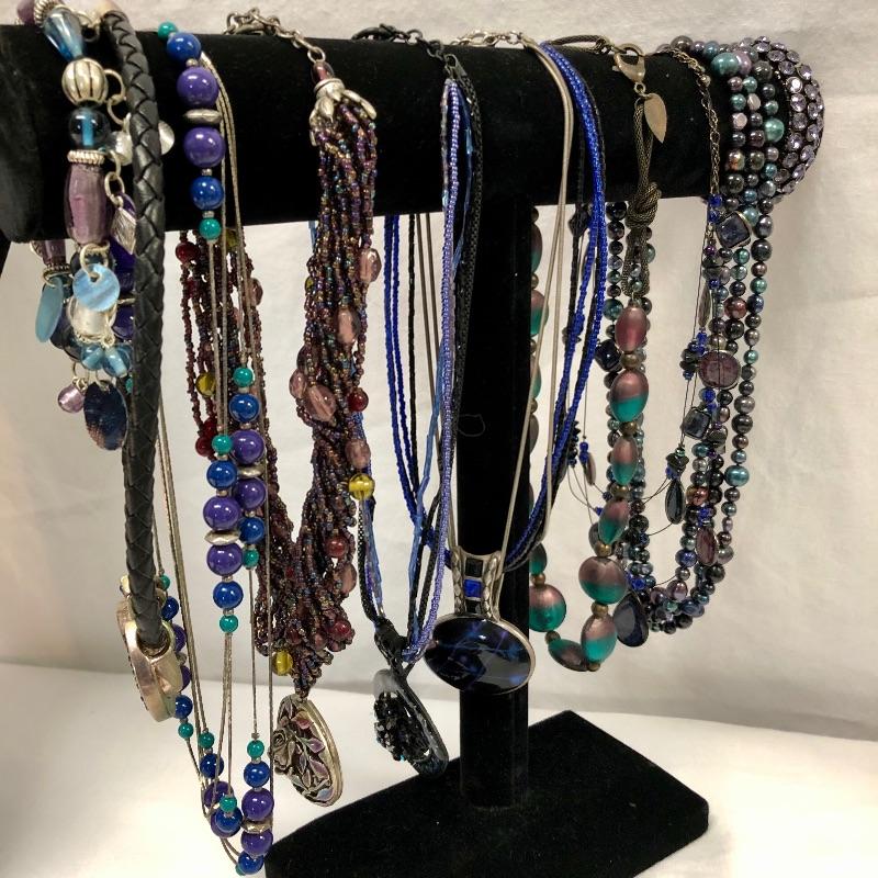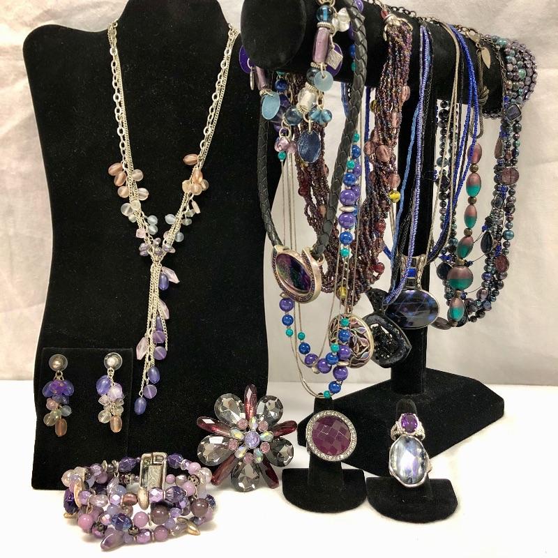 So many gorgeous options here, you will be spoilt for choice! Predominantly purple pieces with the addition of pink and many that are iridescent. Necklaces, bracelets, rings and a Chico’s brooch complete this lot.