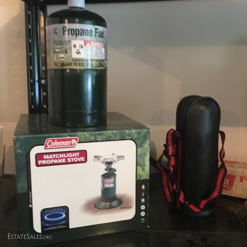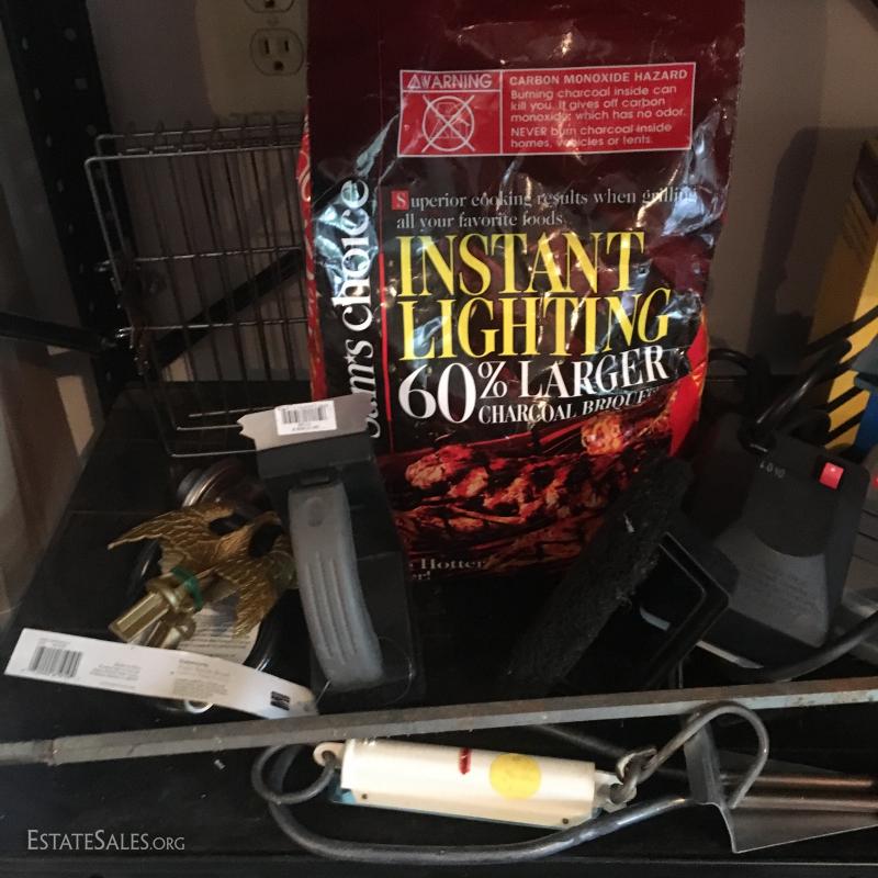 Large lot of camping and grilling out items, Coleman stand, lamp, rotisserie tool for grill along with the shelf in photograph.