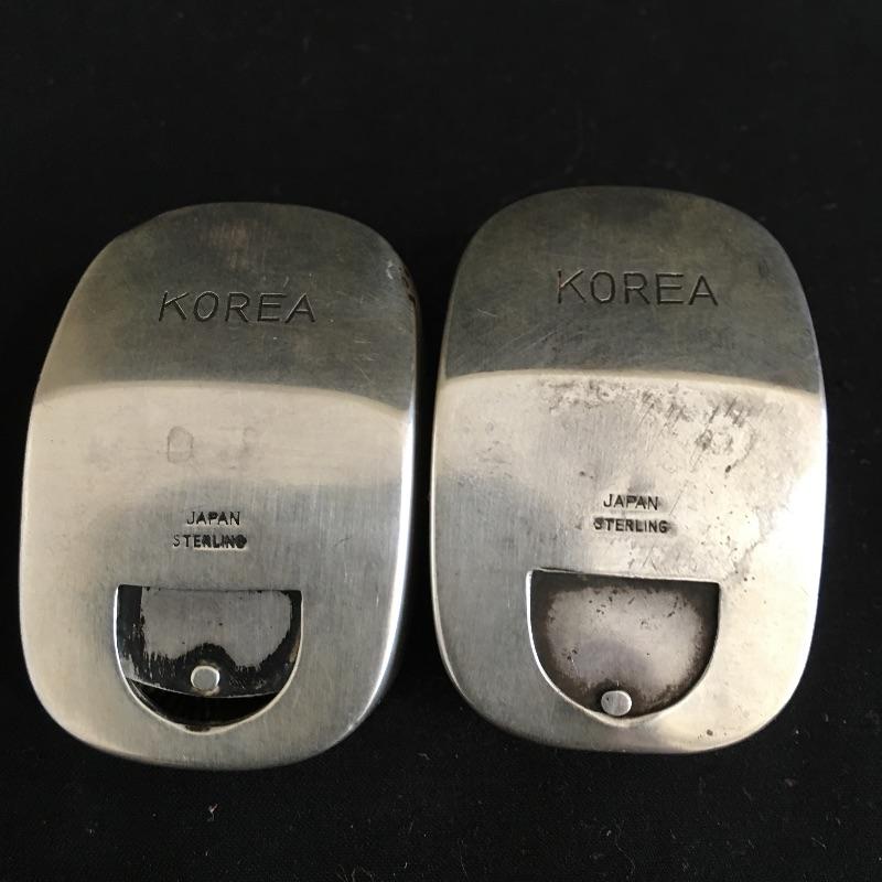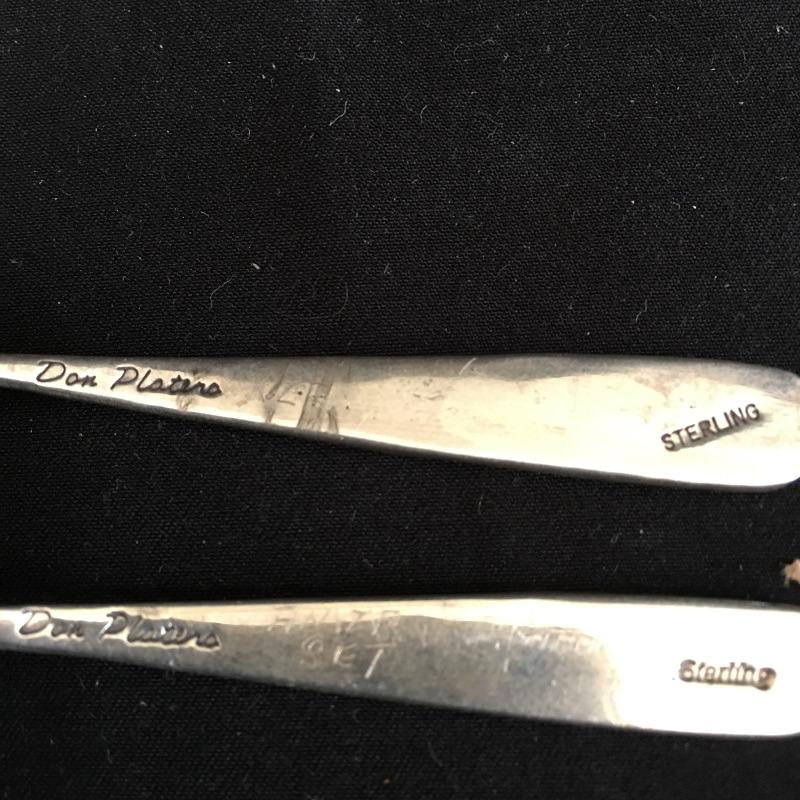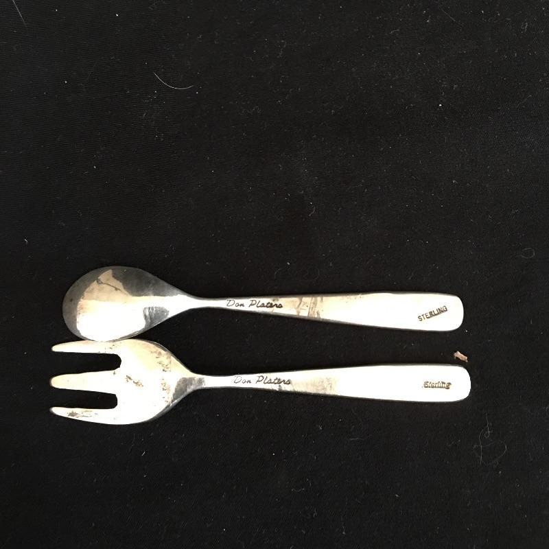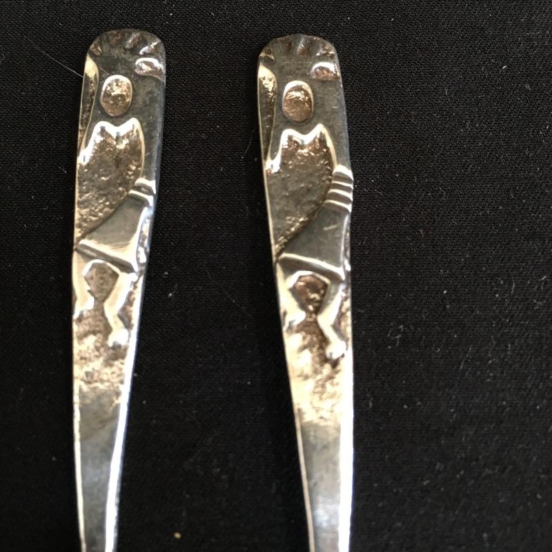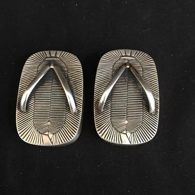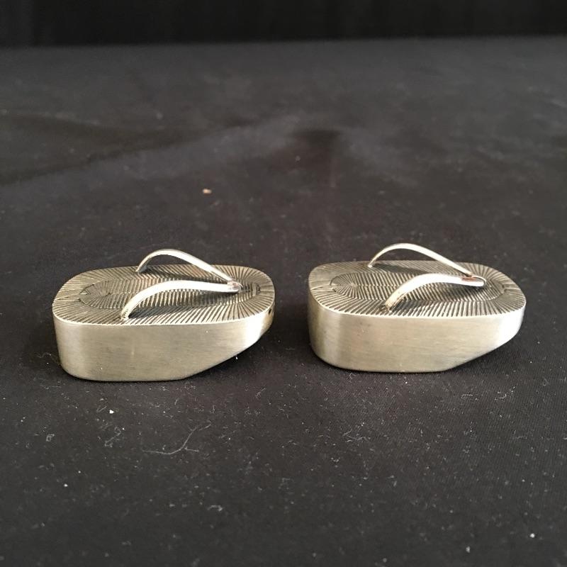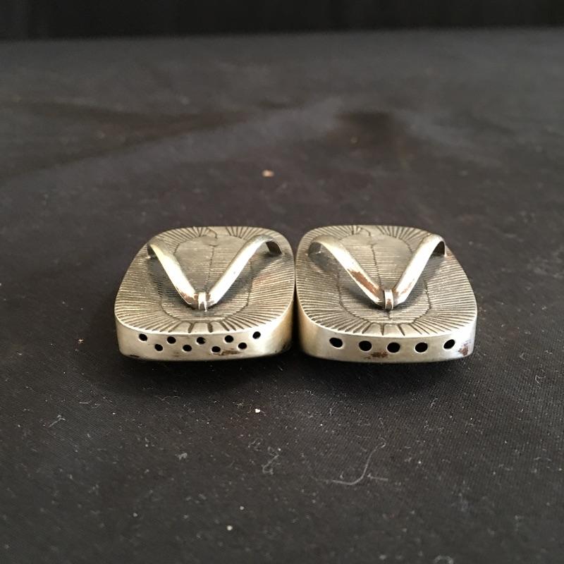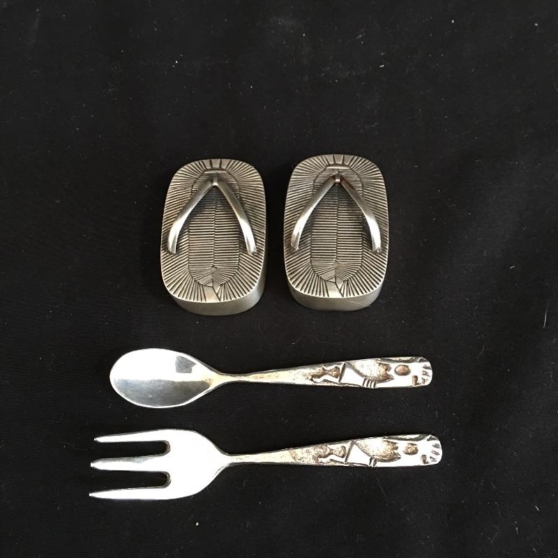 Japanese Sterling salt and pepper shakers shaped like flip flops and a Sterling demitasse spoon and appetizer fork. These flip flop shakers will make a great conversation starter. All items marked sterling. Shakers measure 1.75” x 1.25” x .75”.
