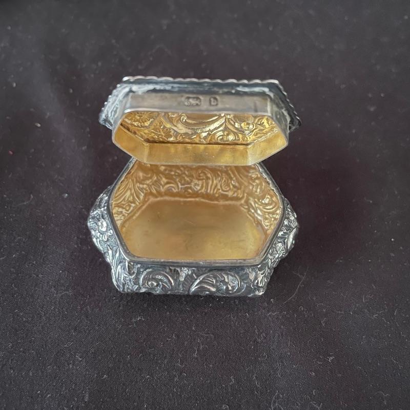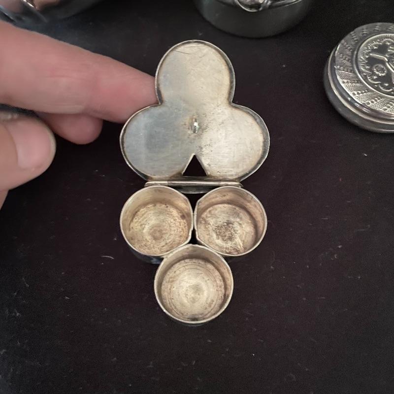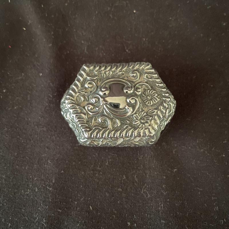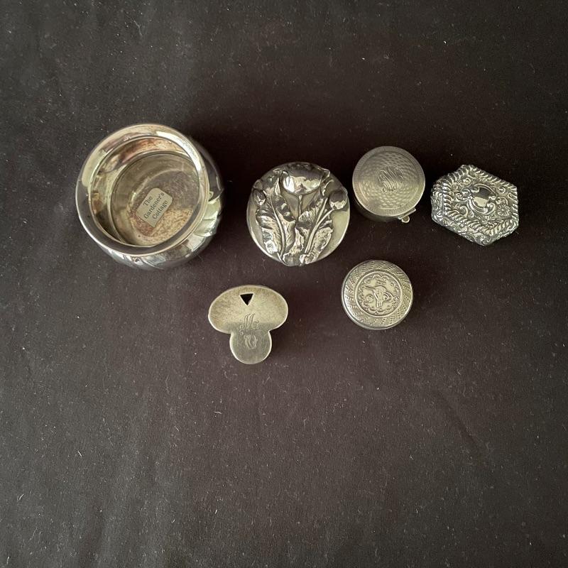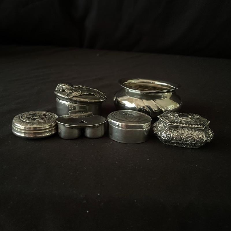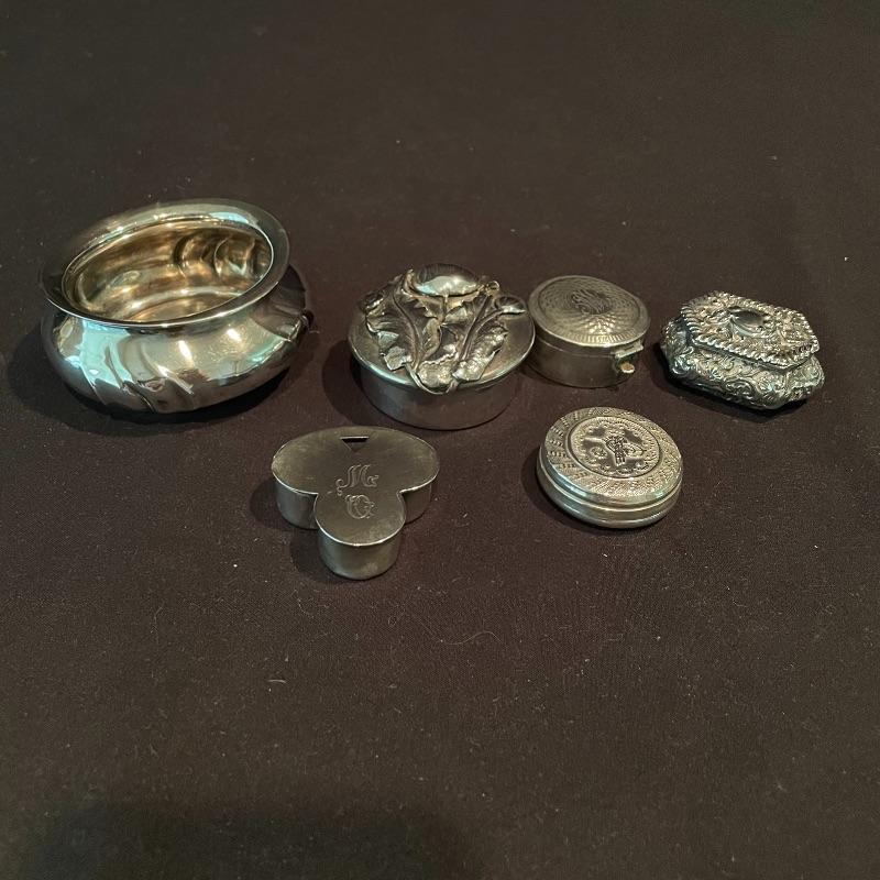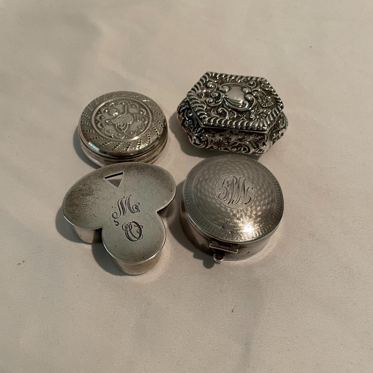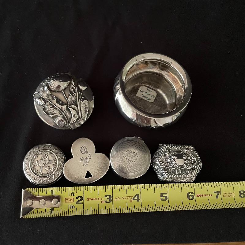 Wonderfully sweet small collection of boxes with a variety of markings. From dainty and intricate to bold and beautiful. See images to match markings with boxes. Starting bid is at or near melt value. Shipping available.