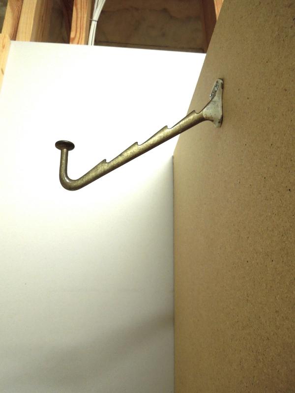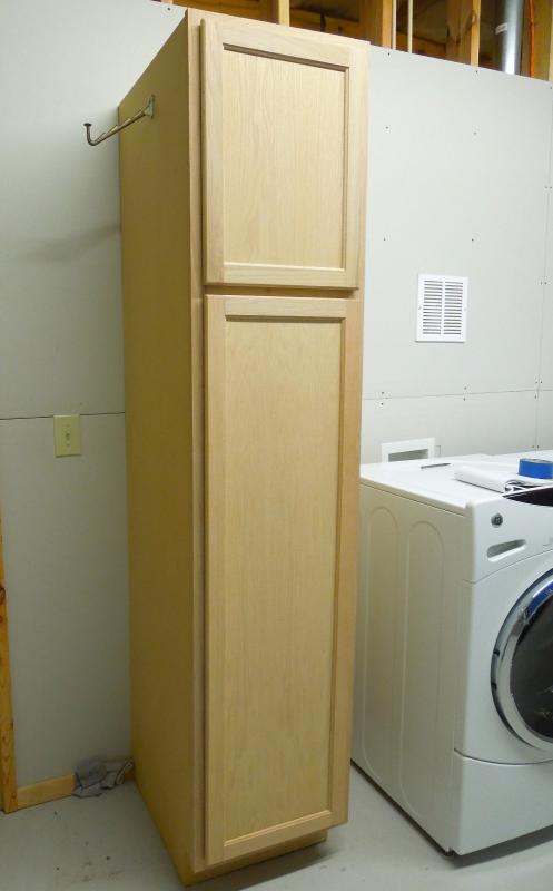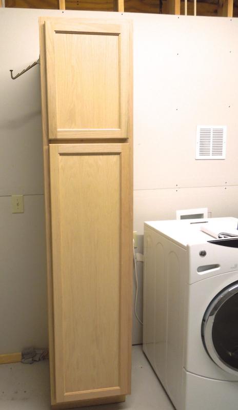 84" H x 24" D x 18" W. Unfinished, sanded blond wood front. Pressed wood sides. Brass hook for hanging laundry. Great for hiding ironing board, mops, brooms, etc,