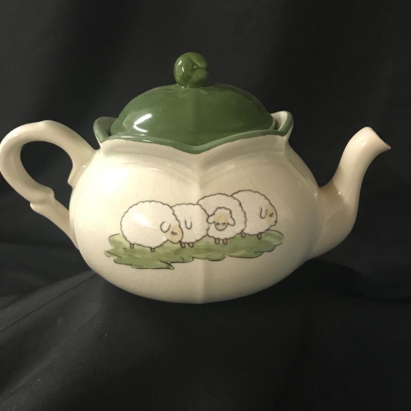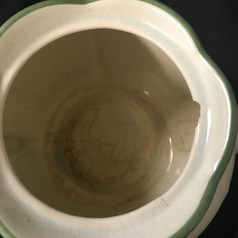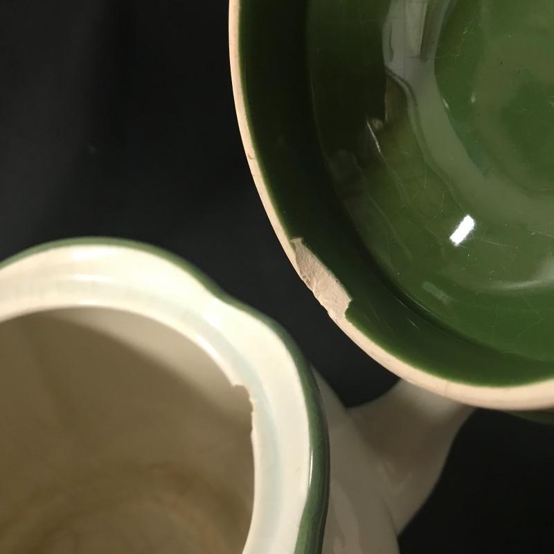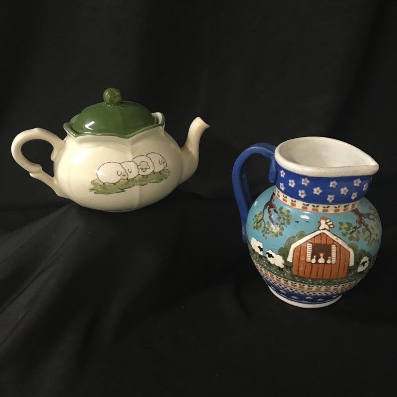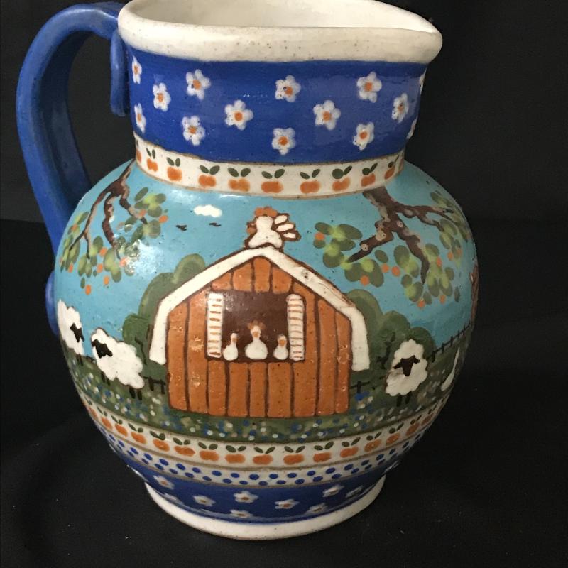 Short German-made teapot measures 10” x 7”. Has cracks and chips but is a nice display piece. Looks to be numbered. See pics. Stoneware Pitcher with folk art painting on outside. Signed and dated 1987. This lot is available for shipping or local pick up in Asheville, NC.