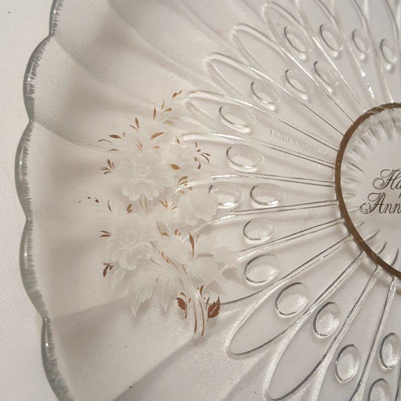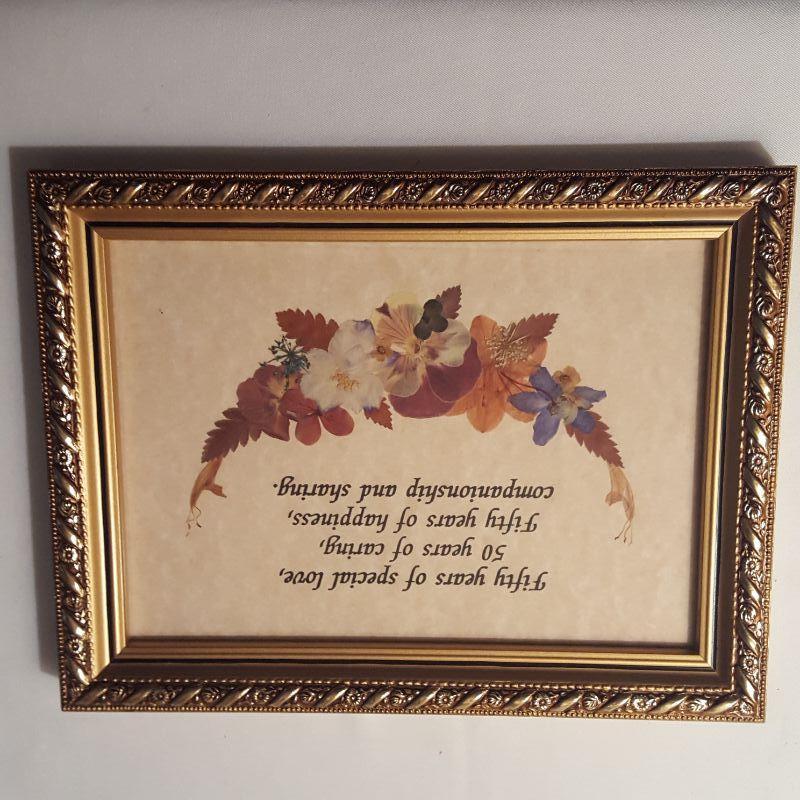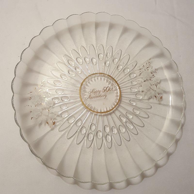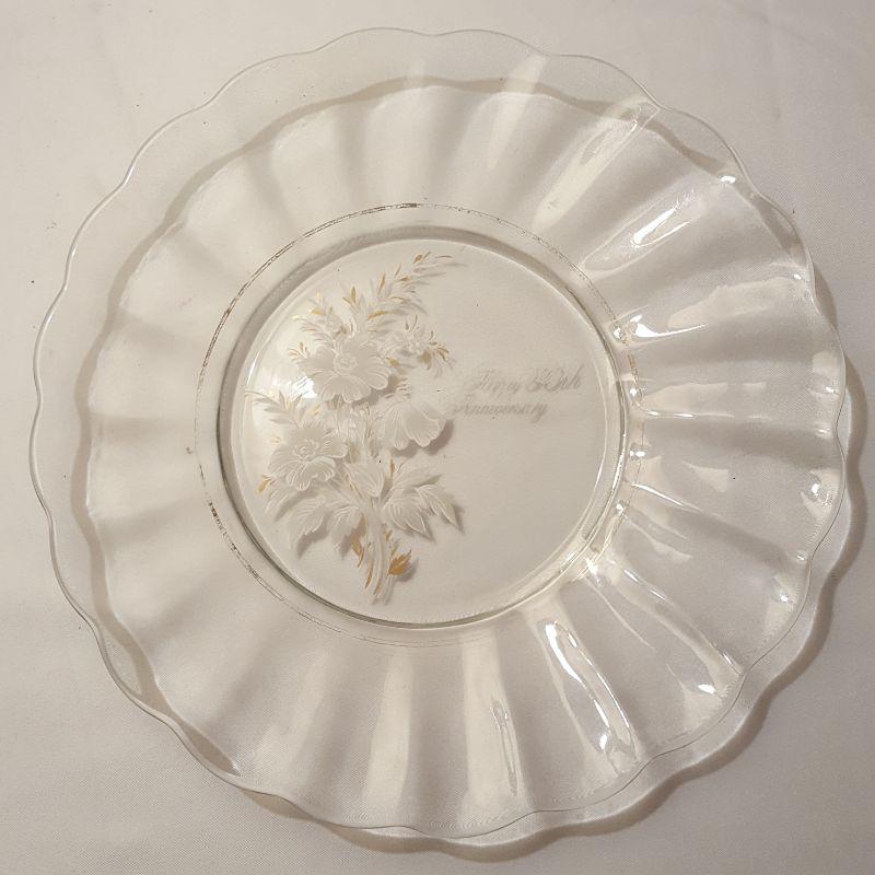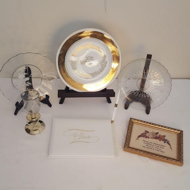 Do you know someone who is getting ready to celebrate 50 years of marriage? If so, this lot would make a great gift idea! This lot includes 3 plates (approximately 10 inches), a candle holder, a brand new guest book and a beautiful framed quote with dried flowers on it. The clear plates have some wearing on the gold rim, see pictures for details. The candle holder also has some wear on the bottom stem.