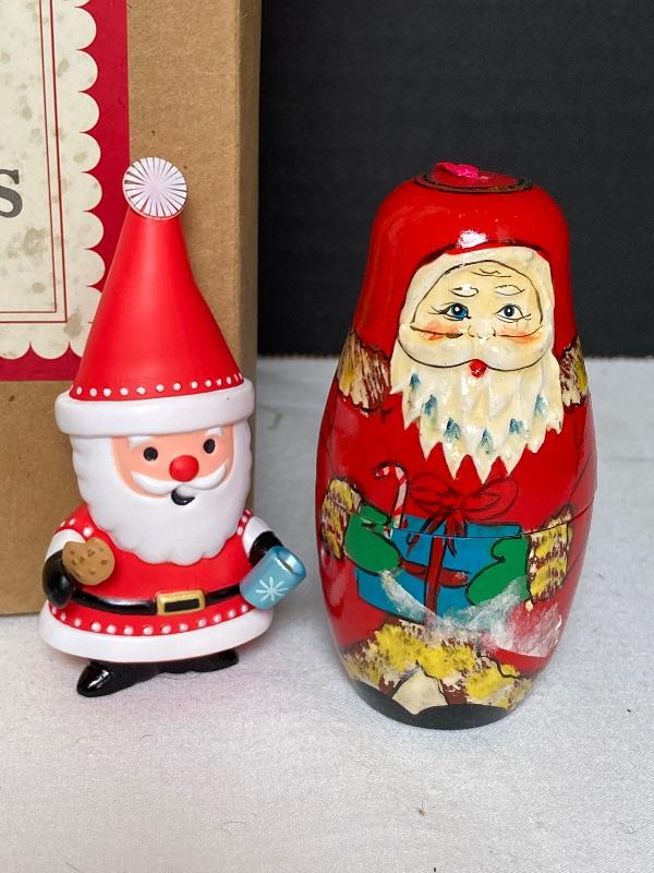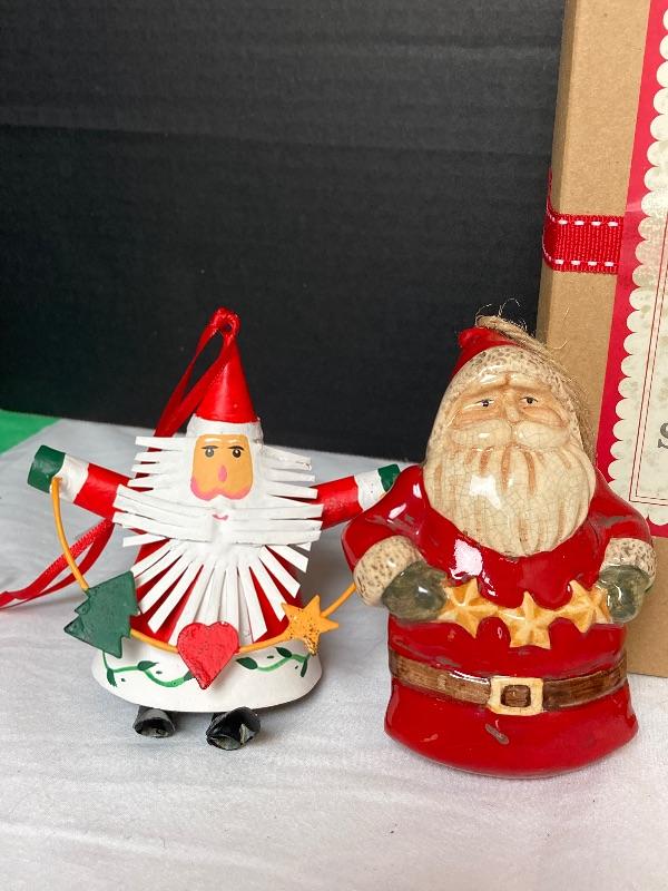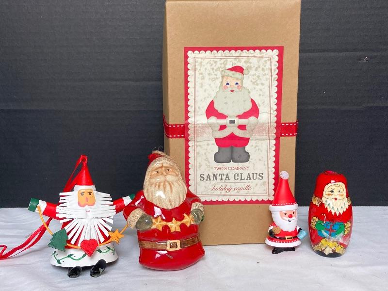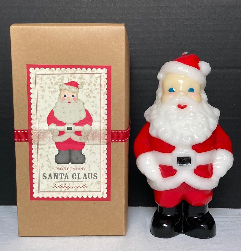 Two’s Company Santa candle measures 9” tall and comes with four small ornaments