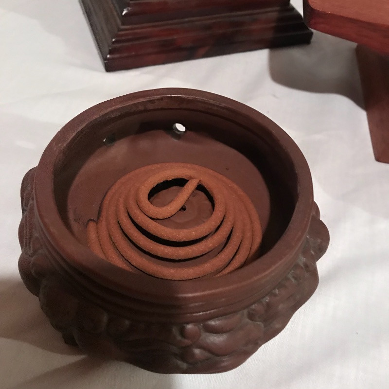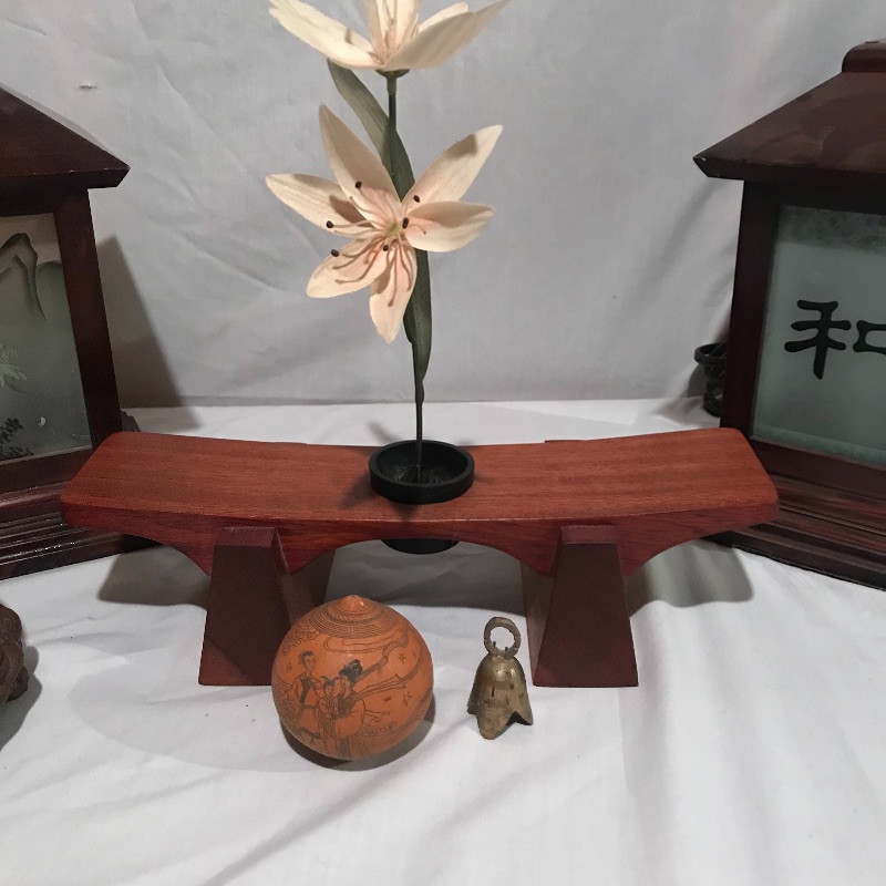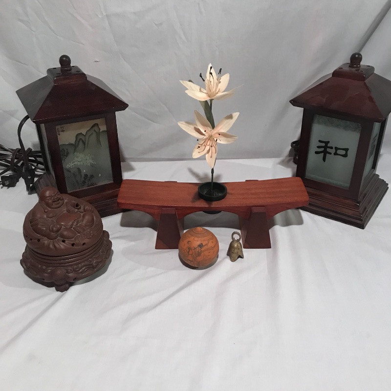 Two small gazebo lamps and sweet ikebana floral stand, japanes gourd rattle, small bell and Buddha incense burner. Lamps work and stand 10” tall. Local pick up only.