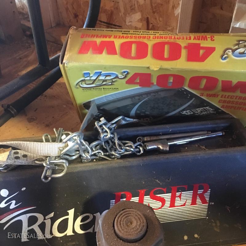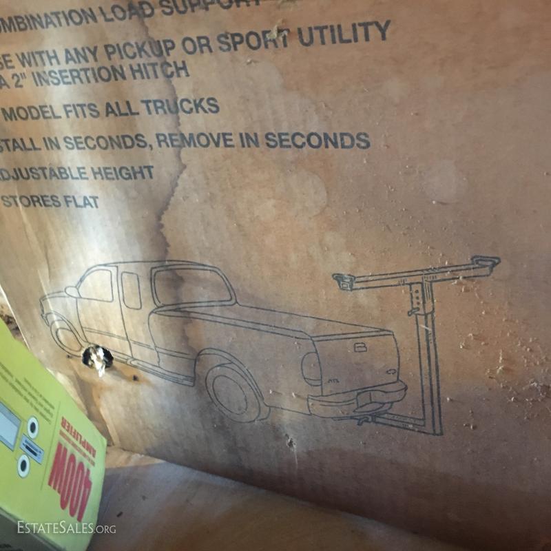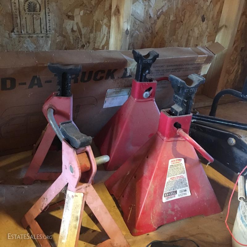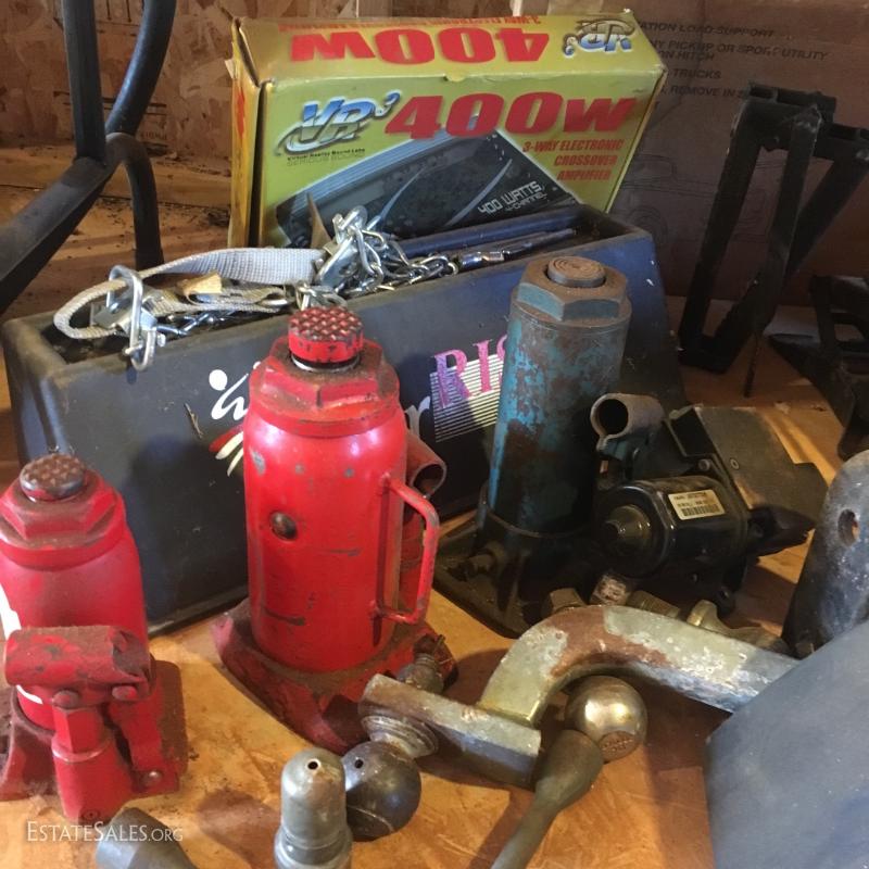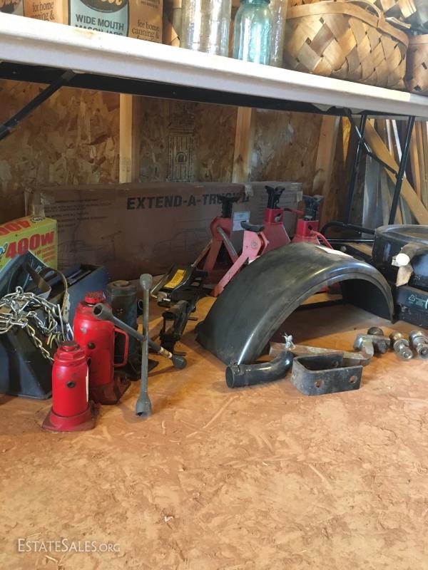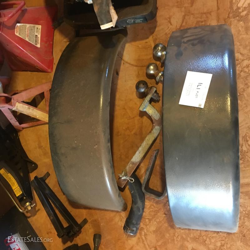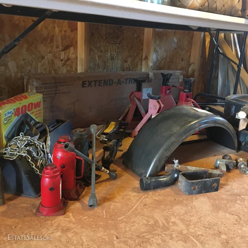 Set of two 5 ton jack stands and another smaller pair (cannot confirm weight capacity). New in box “Extend a truck” hitch adaptor, several ball hitches, two trailer fenders (new condition), plastic oil pans, Craftsman 5000lb. Service Jack and 3 hydrolic jack stands and much more. Local pick up only in Columbus, NC.