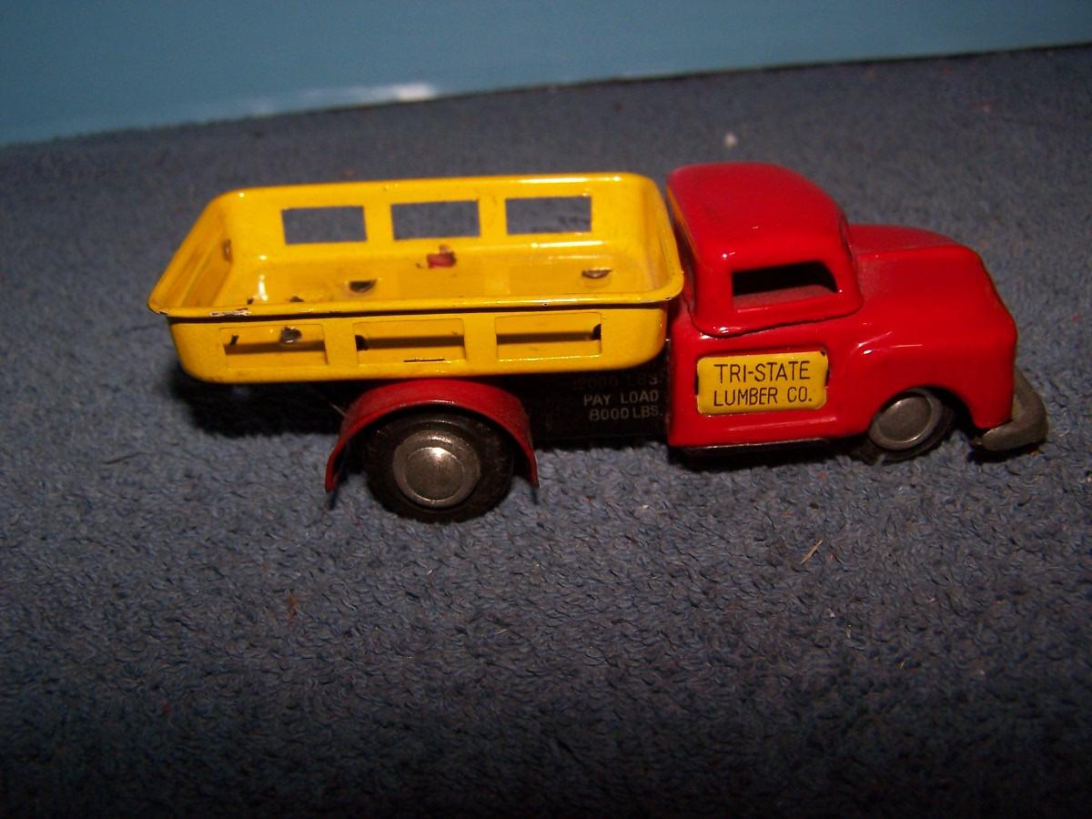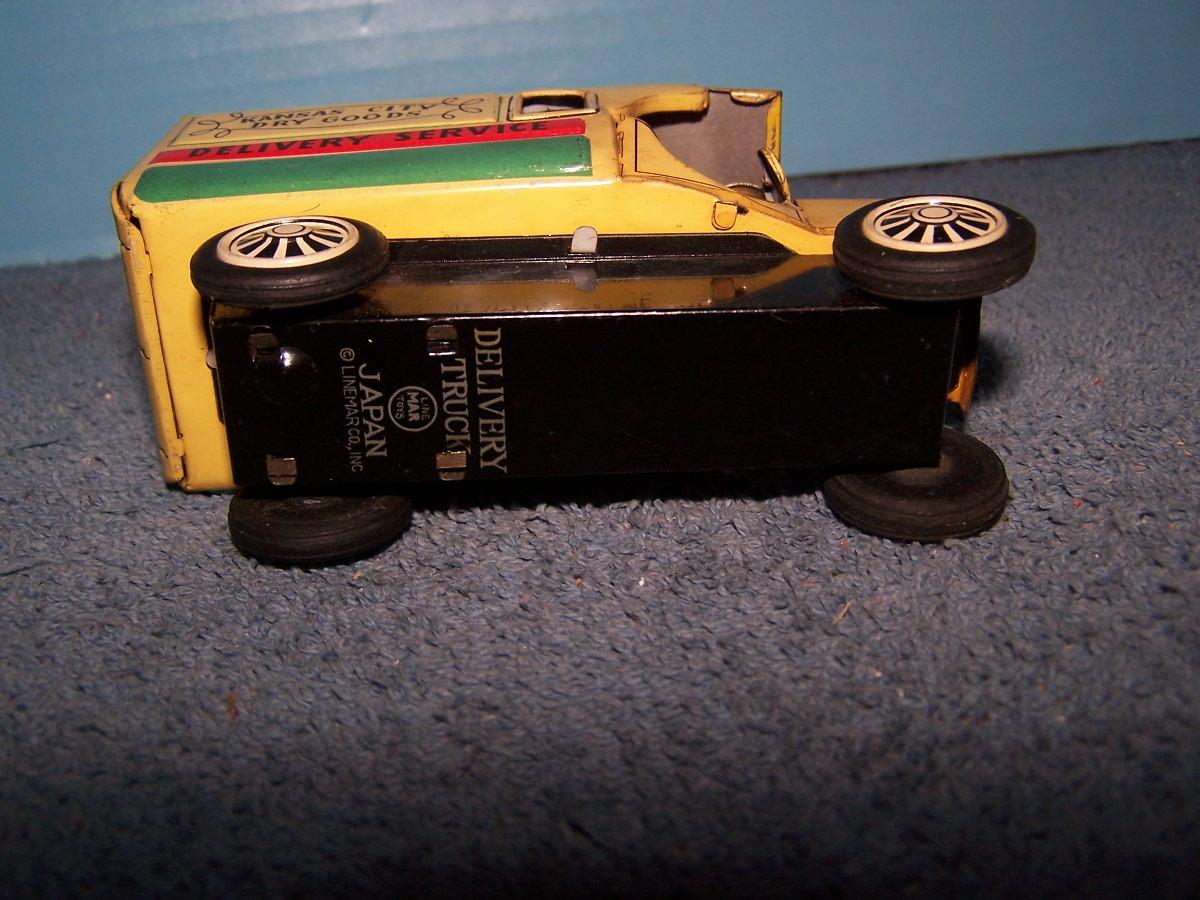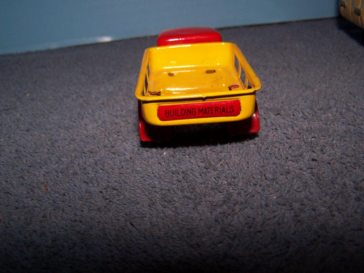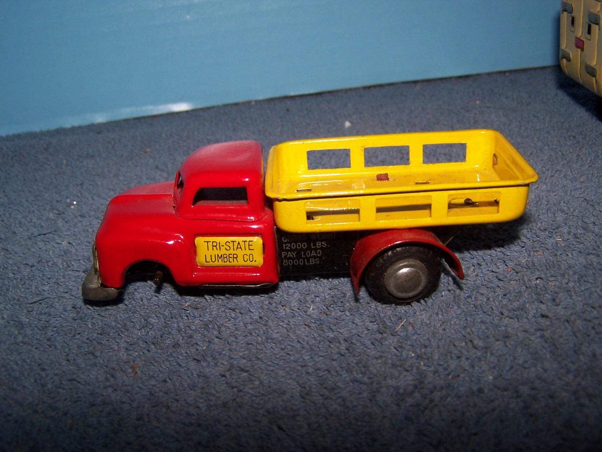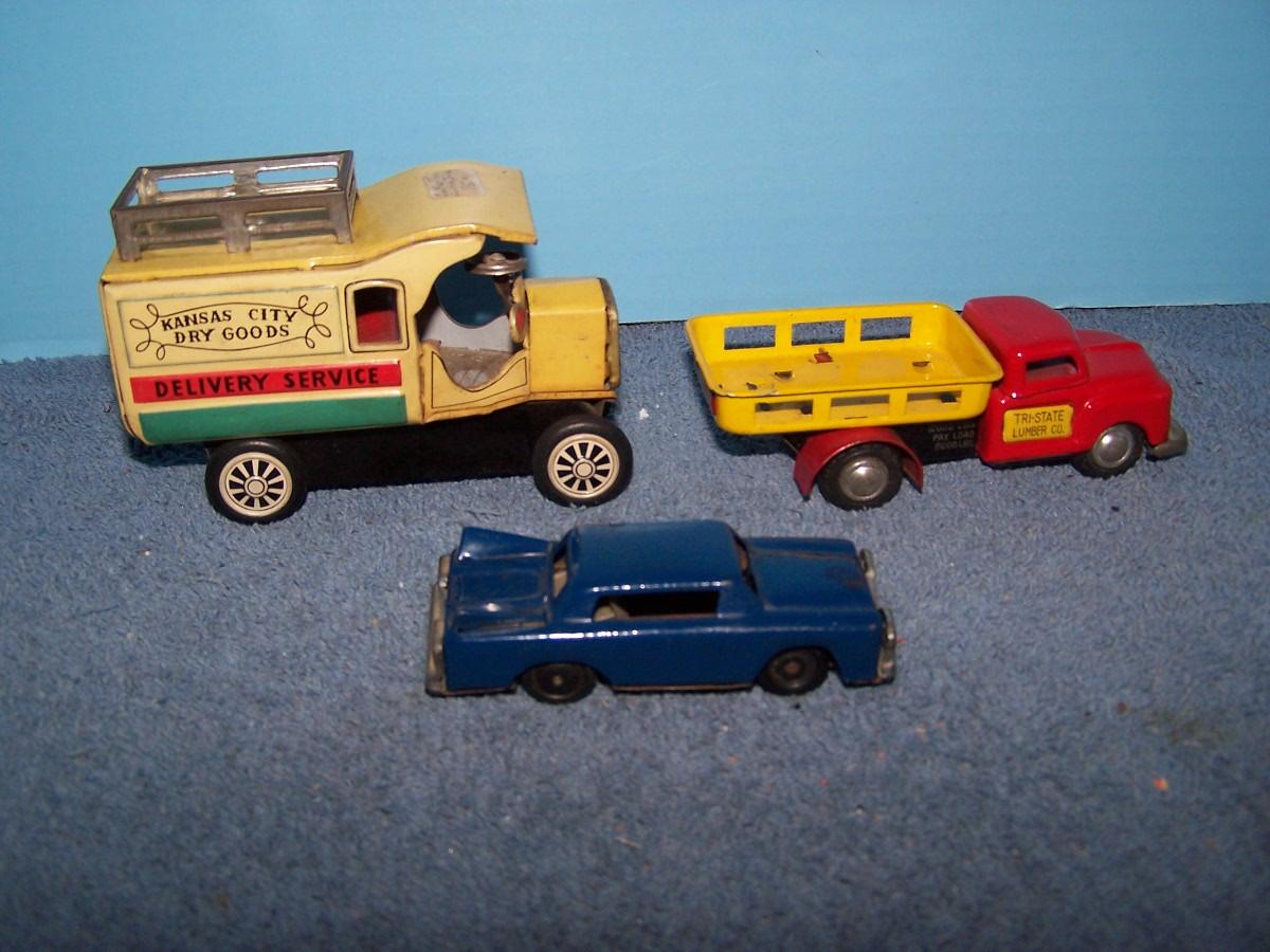 THESE ARE GREAT VINTAGE TIN LITHO VEHICLES!!! FRICTION WORKS.. 2 TRUCKS ARE 4 1/2'' LONG.. 1 TRUCK IS MISSING A TIRE.. ALL TOYS HAVE BEEN PLAYED WITH..