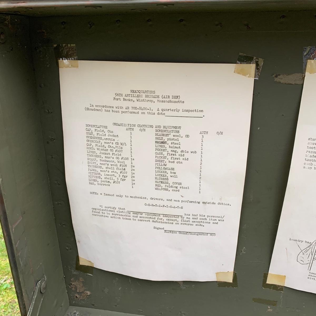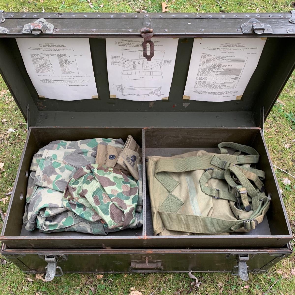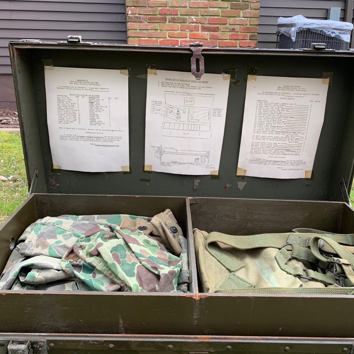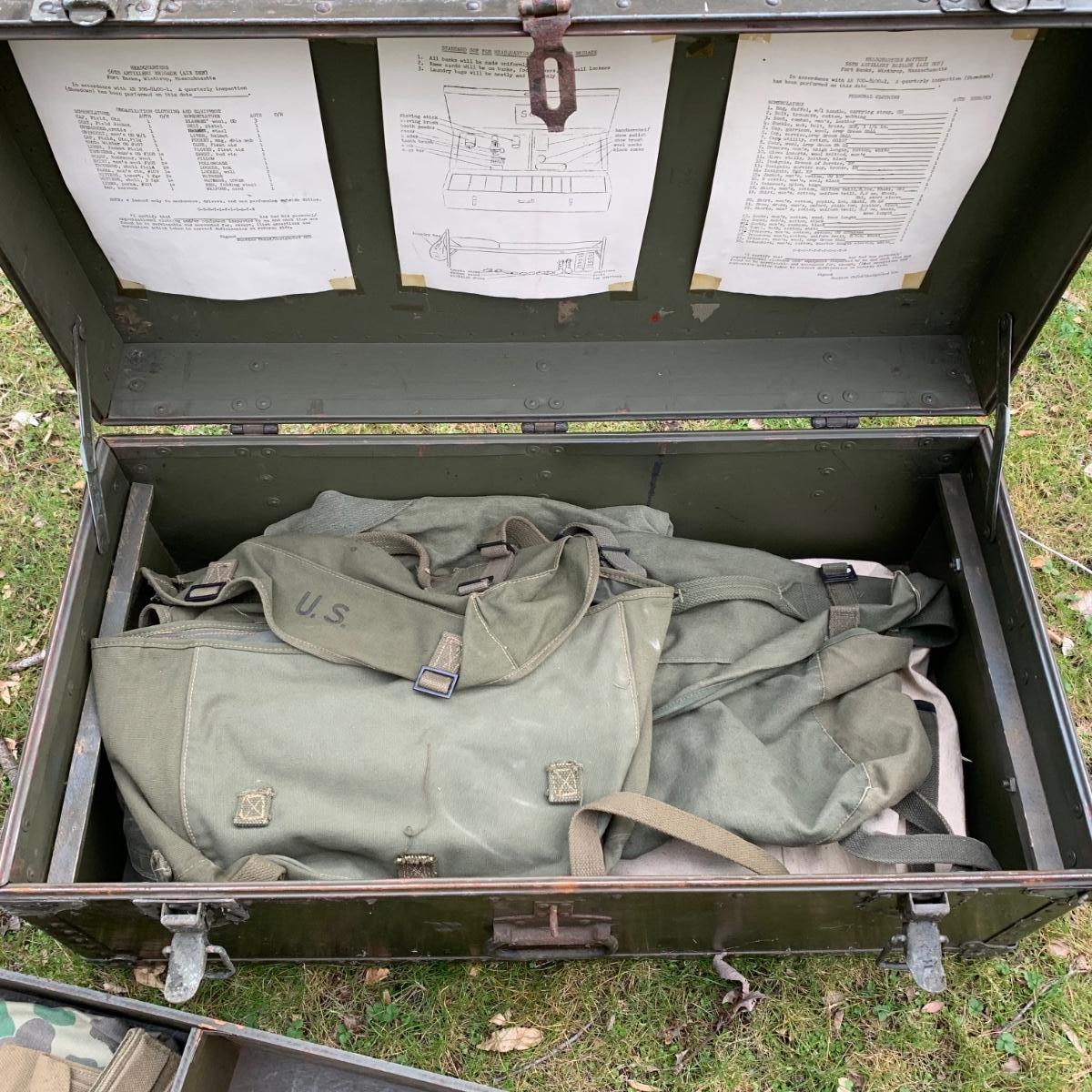 One footlocker of unsorted military items. Footlocker measures 32 x 16 x 13 inches.
