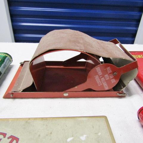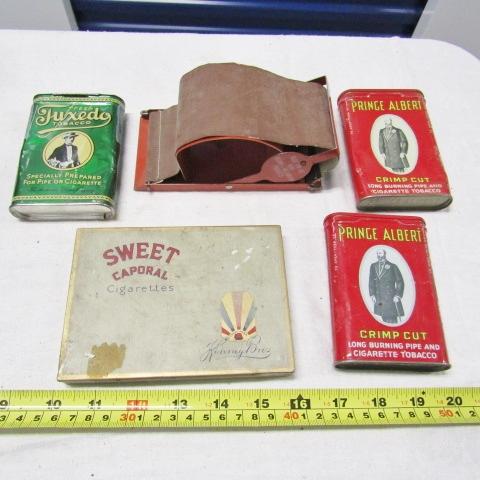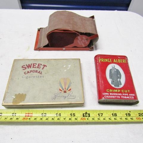 CIGARETTE ROLLER, TABACCO AND CIGAR TINS (SOME DENTS TO TINS)
