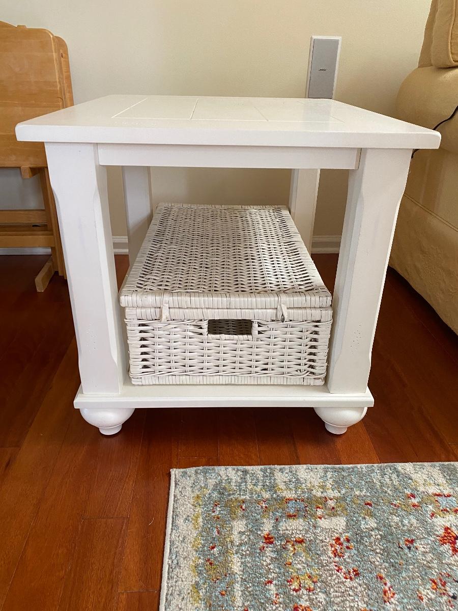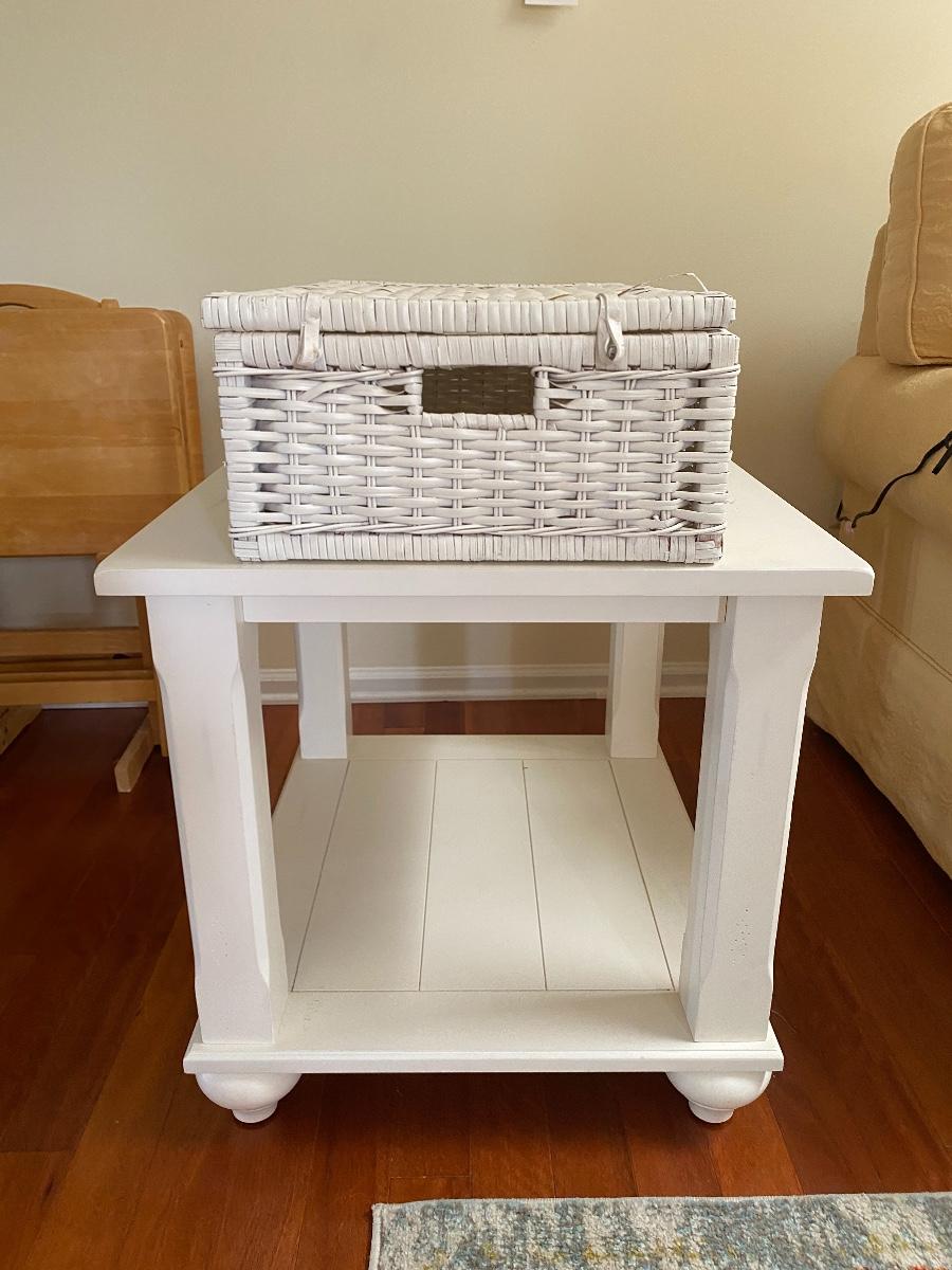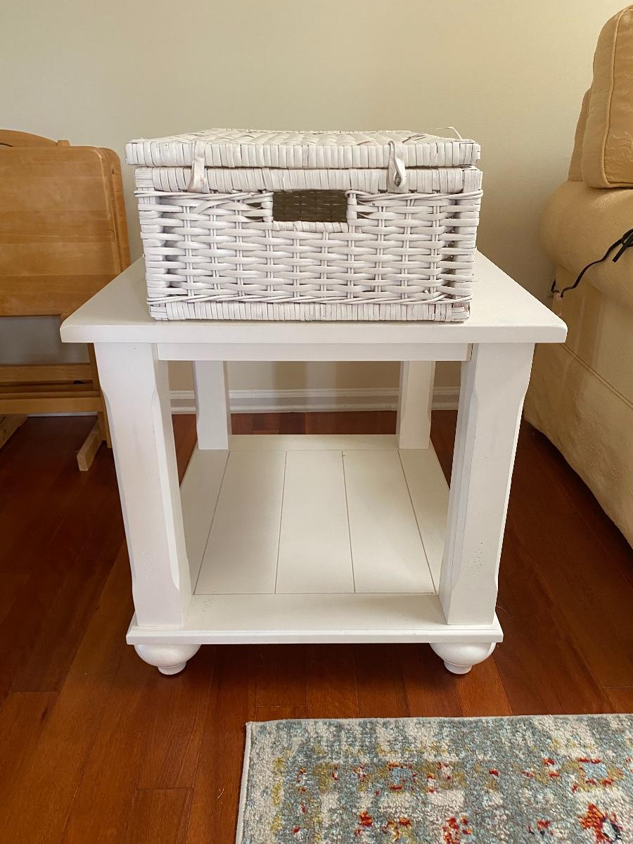 23x27x23 inches tall. This shabby chic/beachy end table is perfect in any room and comes with a coordinating storage basket on the bottom shelf. Light wear. Please see all pictures as they are the best representation of the items in the lot, the condition of the lot, and will show measurements if taken. If purchasing furniture you must be able to move yourself with your own help, and truck. This is located on the first floor.