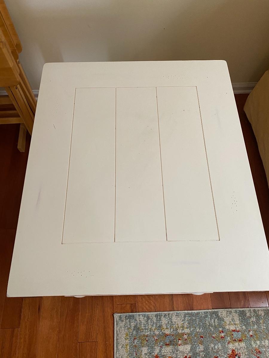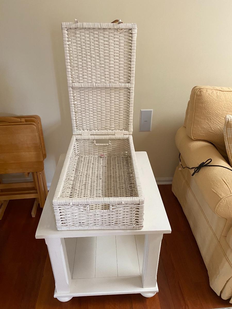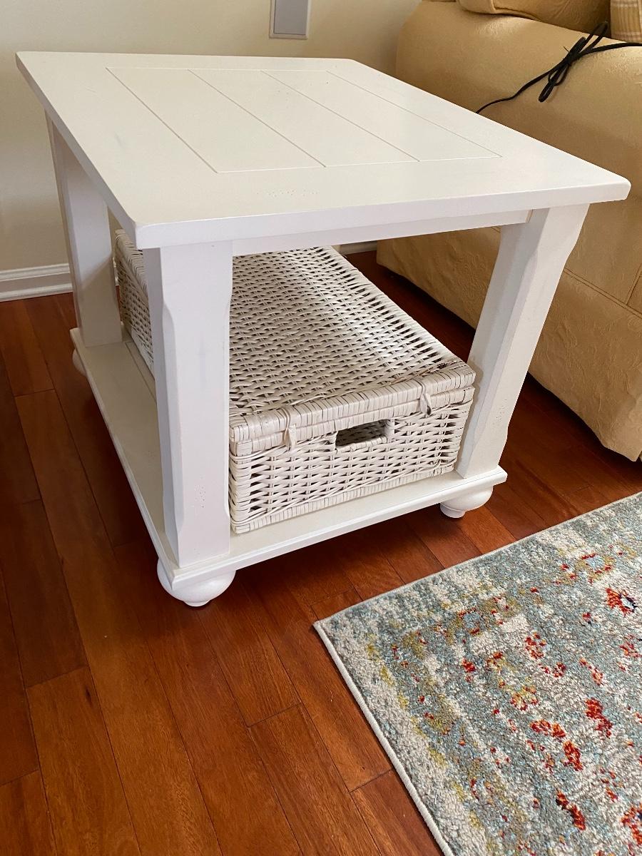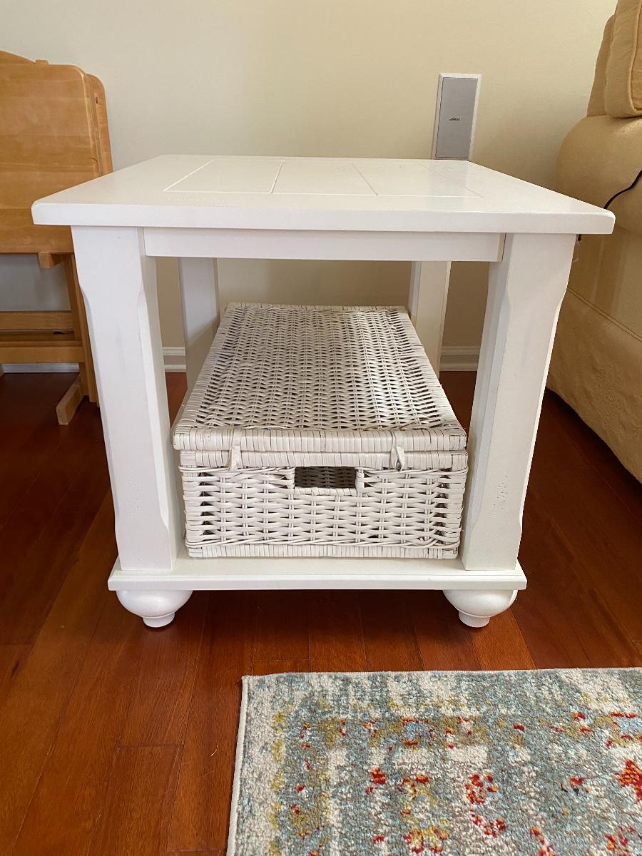 23x27x23 inches tall. This shabby chic/beachy end table is perfect in any room and comes with a coordinating storage basket on the bottom shelf. Light wear. Please see all pictures as they are the best representation of the items in the lot, the condition of the lot, and will show measurements if taken. If purchasing furniture you must be able to move yourself with your own help, and truck. This is located on the first floor.