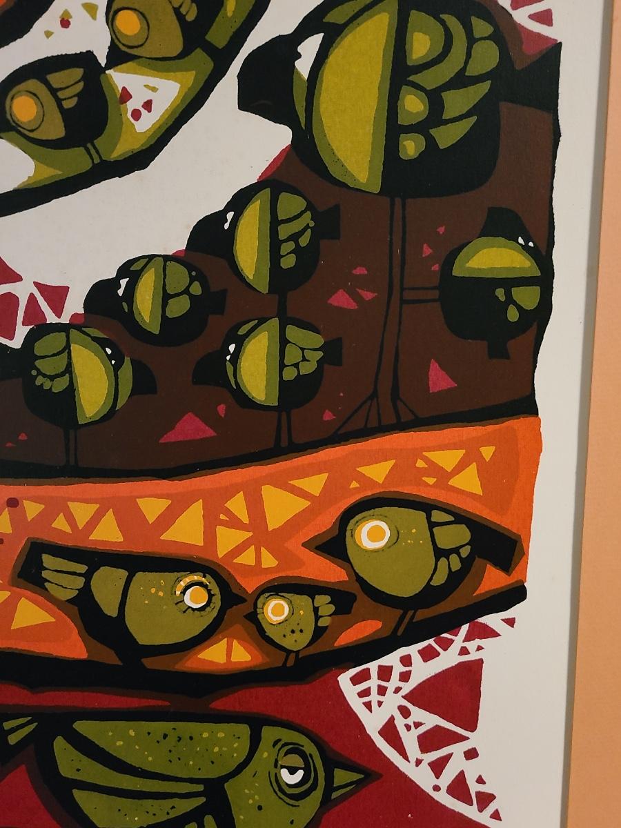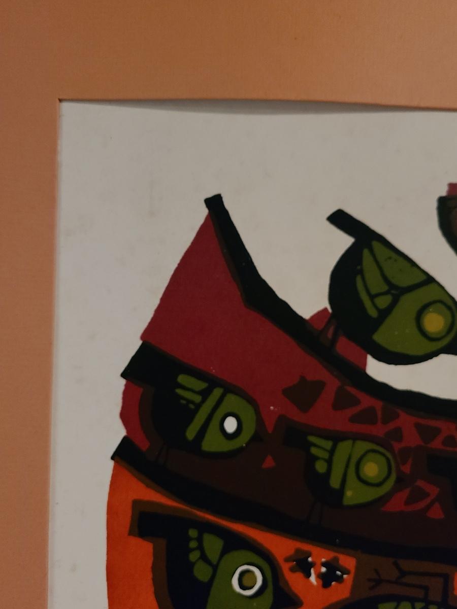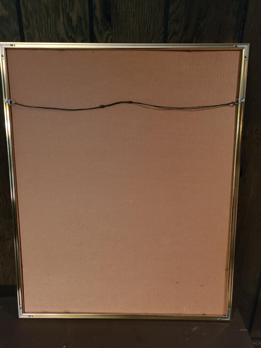 This piece pops with color and is so fun. It has artist on the tree trunk, and the title is "Bird Tree" and is numbered 164/500. This needs to be re-framed and does show some wear. Over the years, the glass frame broke and never was replaced, so there is light, very light discoloring on a couple of the white parts of the artwork. The gold frame is flimsy as well. This would look amazing re-framed in black or white. Shown on two different backgrounds to show the colors, and the versatility of this artwork! Please see all pictures as they are the best representation of the items. The pictures show condition, measurements if taken, and what is included in the lot. Due to the large amount that we photograph and the time frame, we are not always able to take measurements. All items unless noted, are pre-owned and have been used. If you purchased furniture, you must bring help. We do not allow one person to carry large furniture out on their own. Bring help, tools and a truck for the safety of our client’s homes, and your personal safety. Company policy. Thank you.