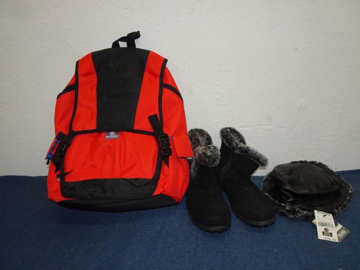 BACK PACK, BOOTS AND HAT