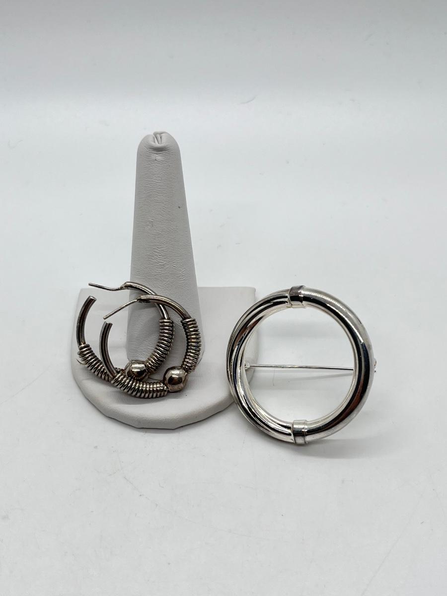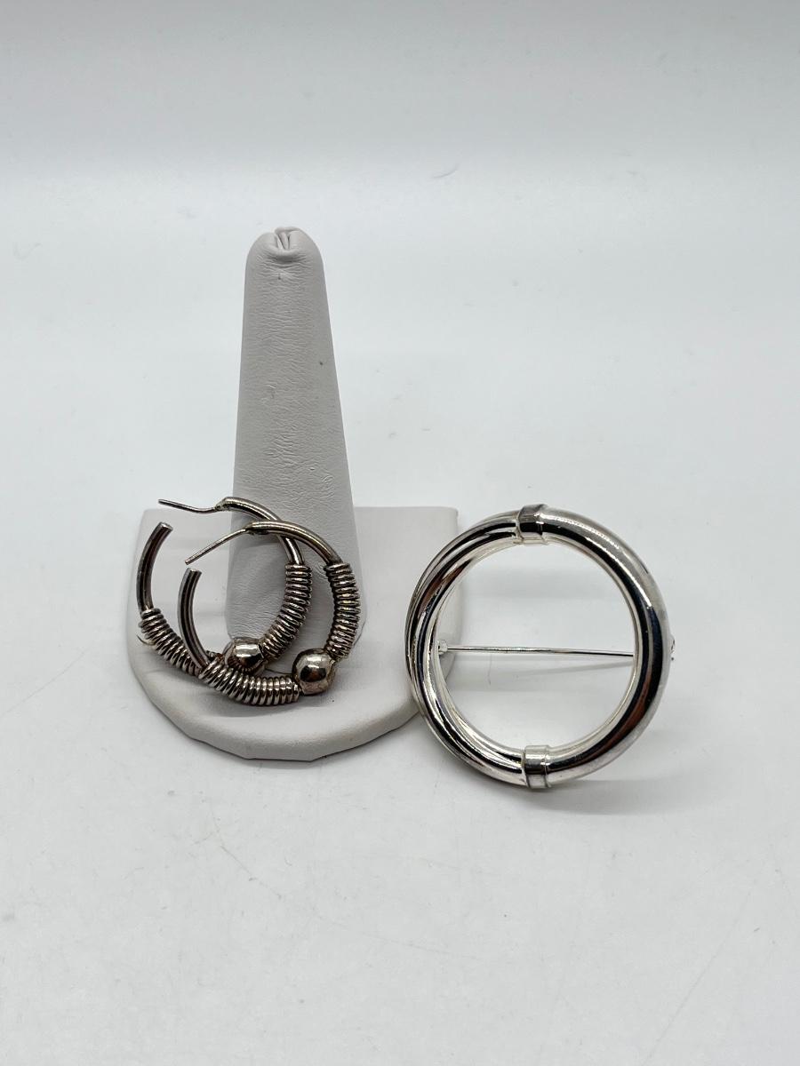 LOT 172: Sterling Silver 925 "CI"  Brooch + Vintage Pierced Silver Earrings