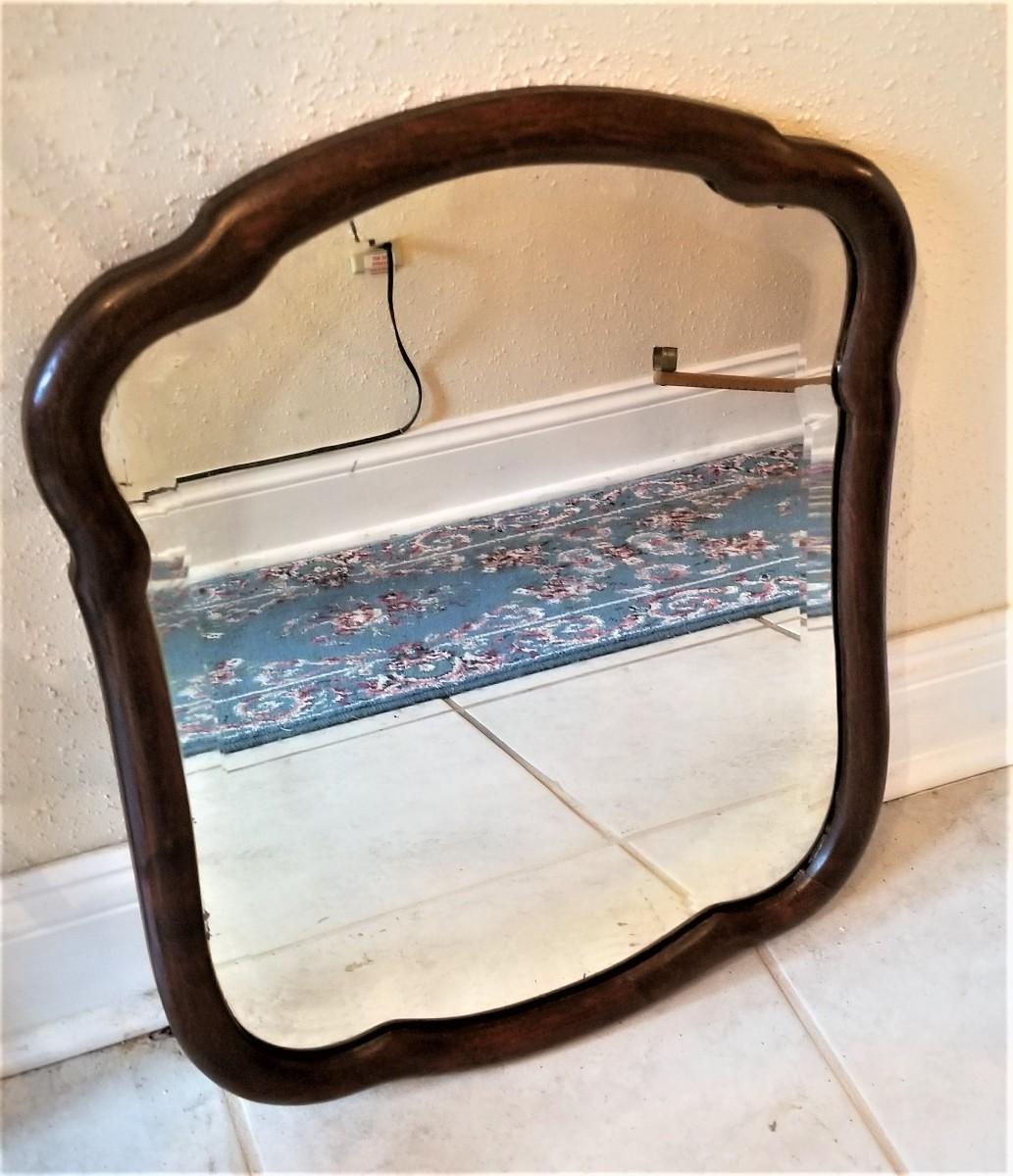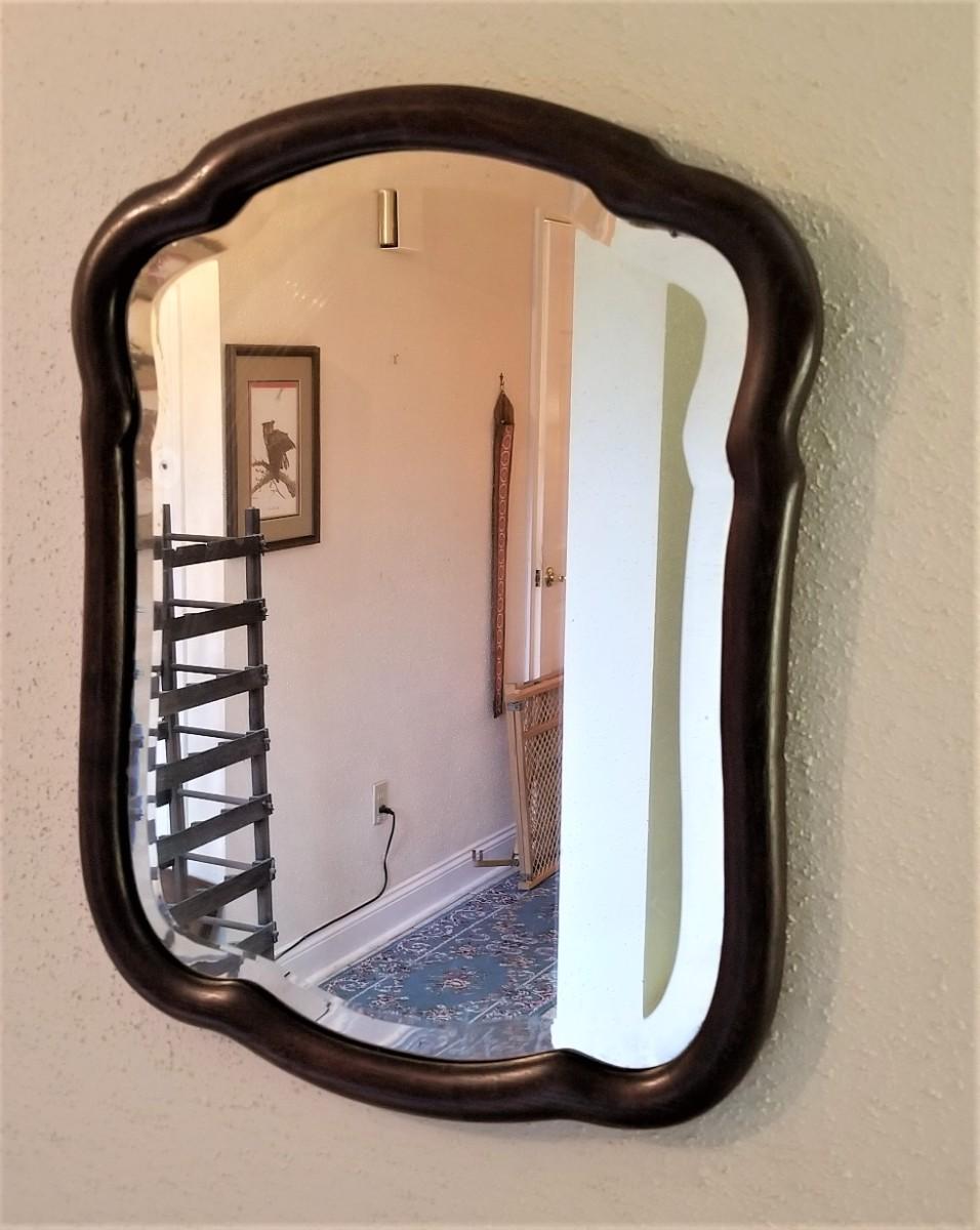 Nice antique beveled glass wall mirror with wooden frame - HEAVY. Measures 17.25" across, 22" tall. Vintage condition.