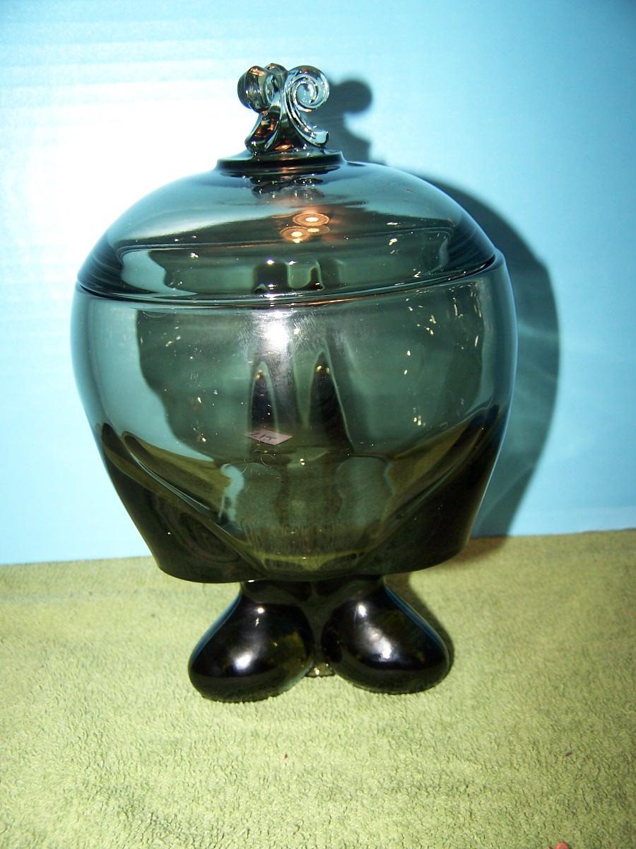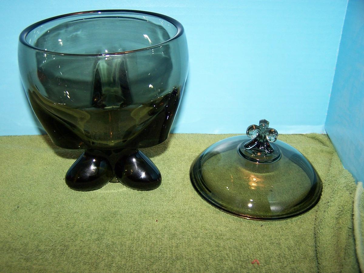 THIS IS A BEAUTIFUL MID-CENTURY VIKING ART GLASS CANDY DISH!!! UNMARKED... IT IS SMOKEY GRAY... IT IS 8 1/2'' TALL... SLIGHT WEAR...