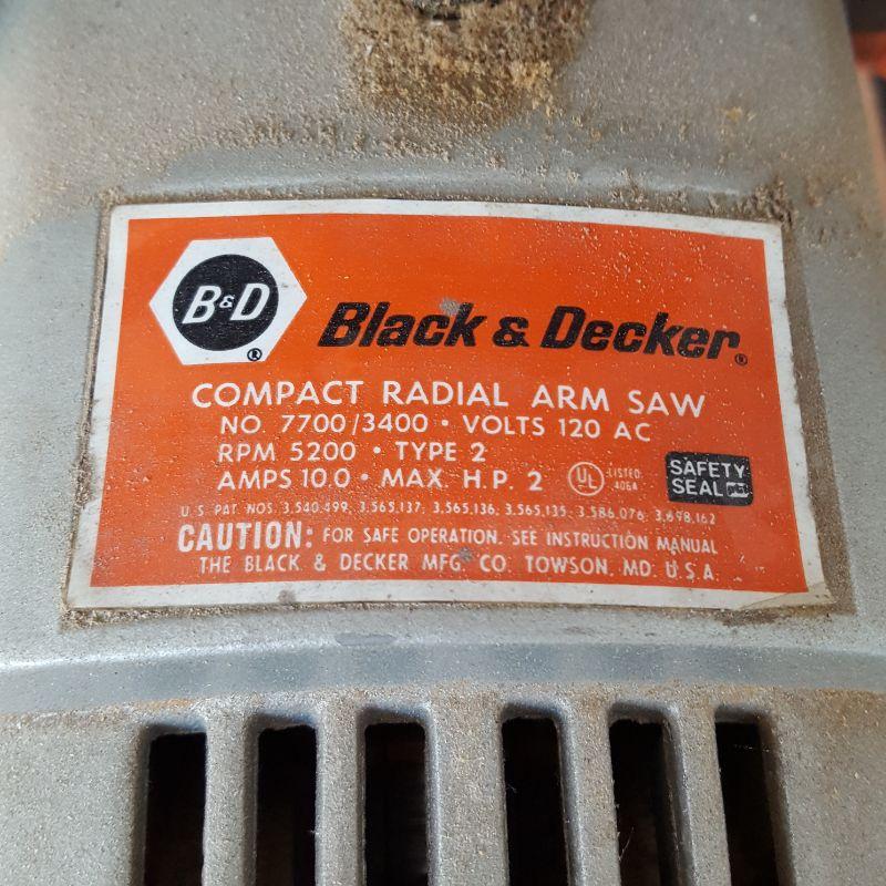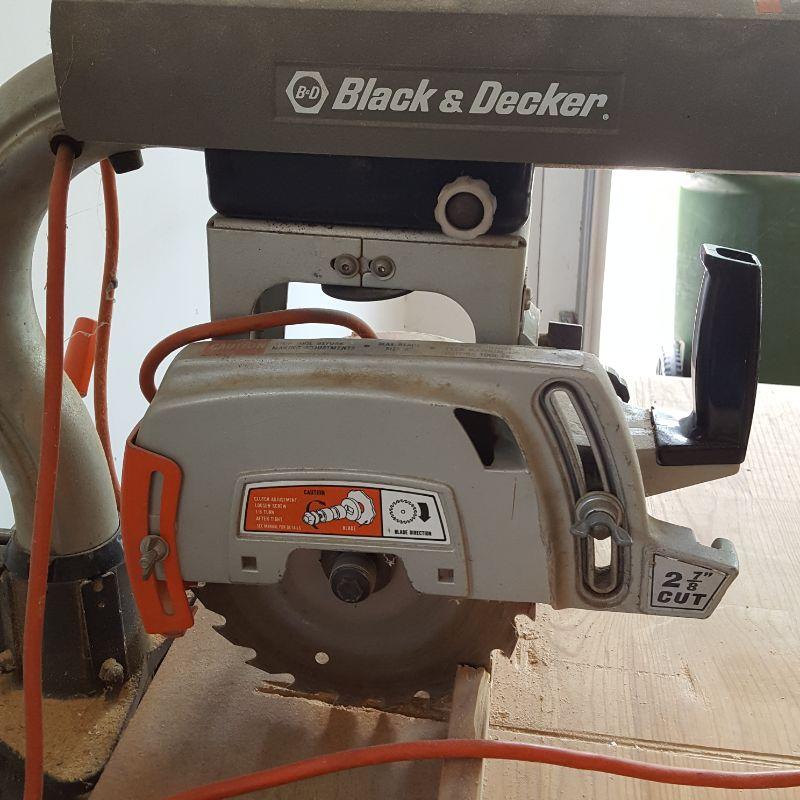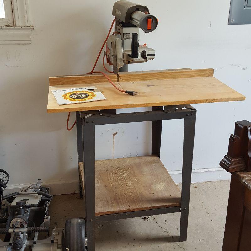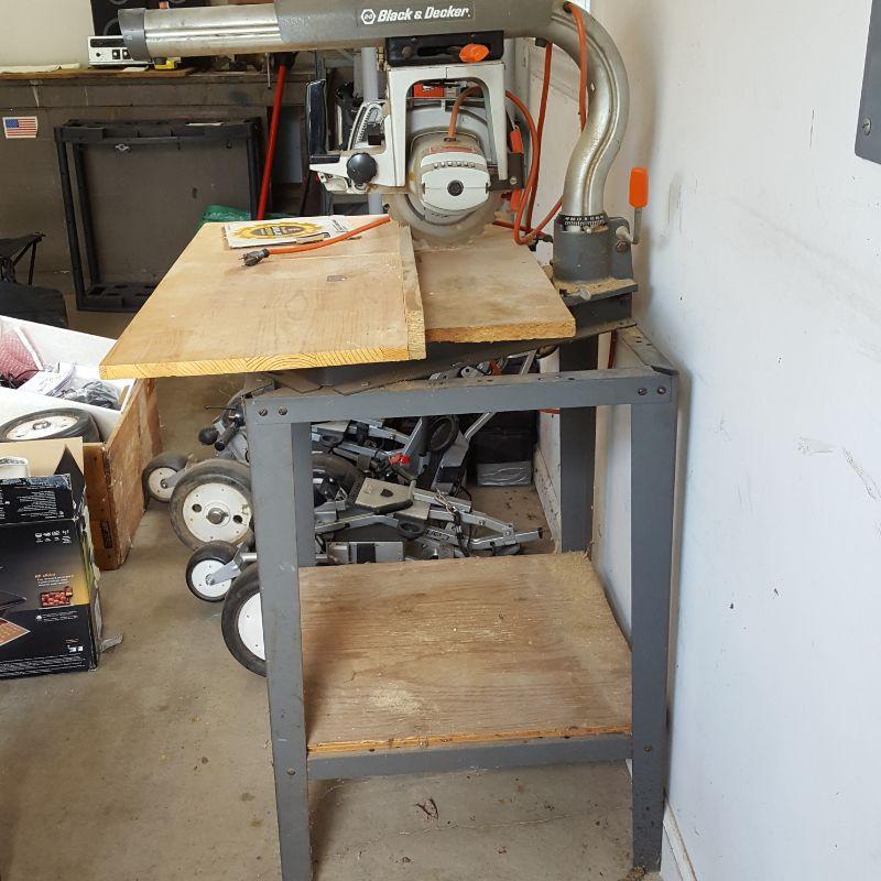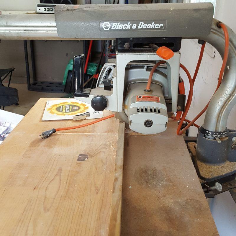 You can start that wood project now. Black and Decker Radial Arm Saw can get the job done. Model number and details included in the pictures. Lot comes with one saw blade and stand. The stand/saw table measures 35.5x29x50 inches. Local pick up only.