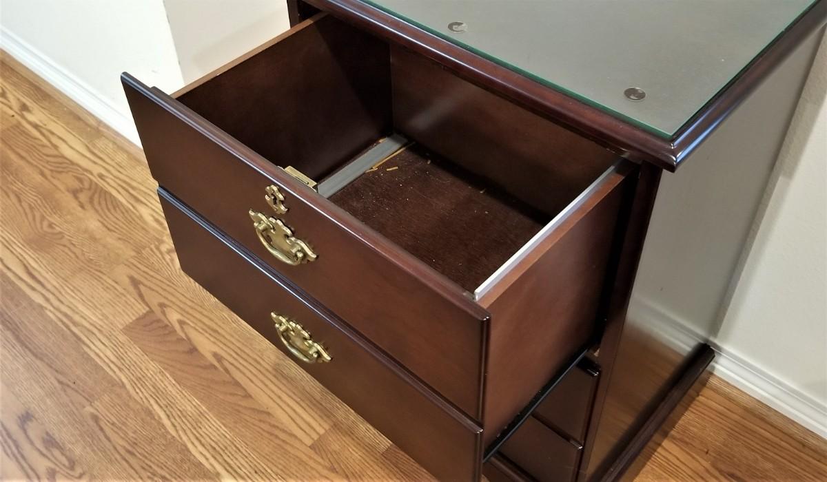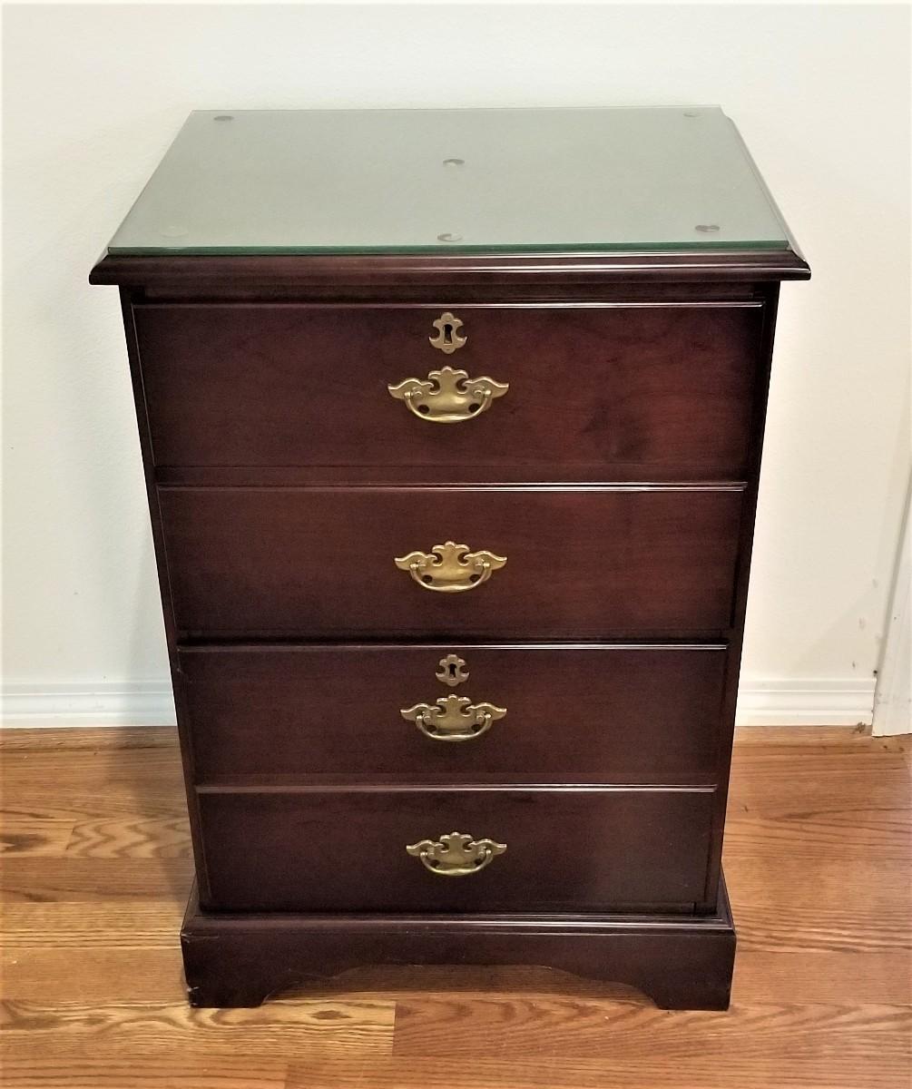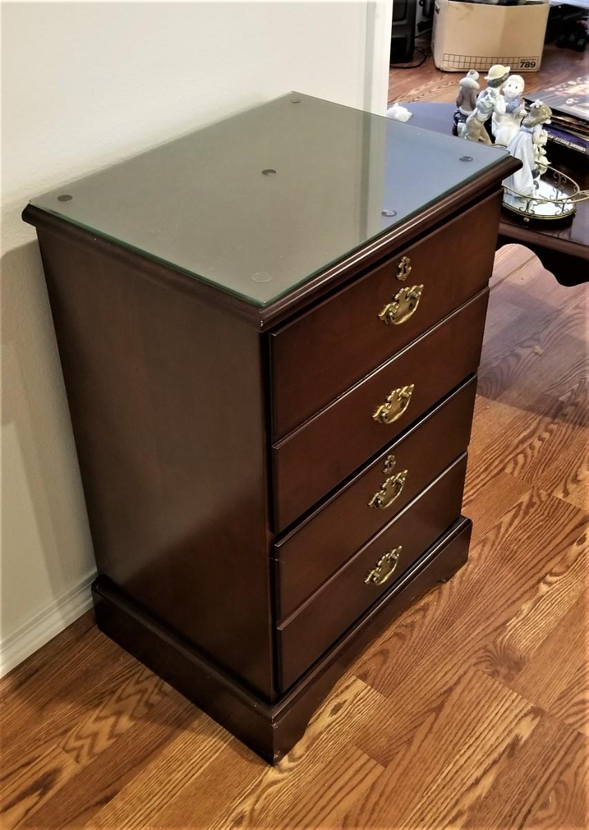 Who said file cabinets had to be ugly? Bombay Company two drawer, legal sized file cabinet. Glass top cut to fit. 20" across, 15" deep, 29.5" tall. Gently used condition.