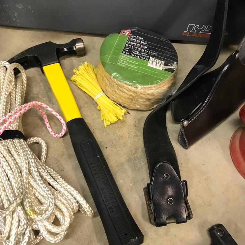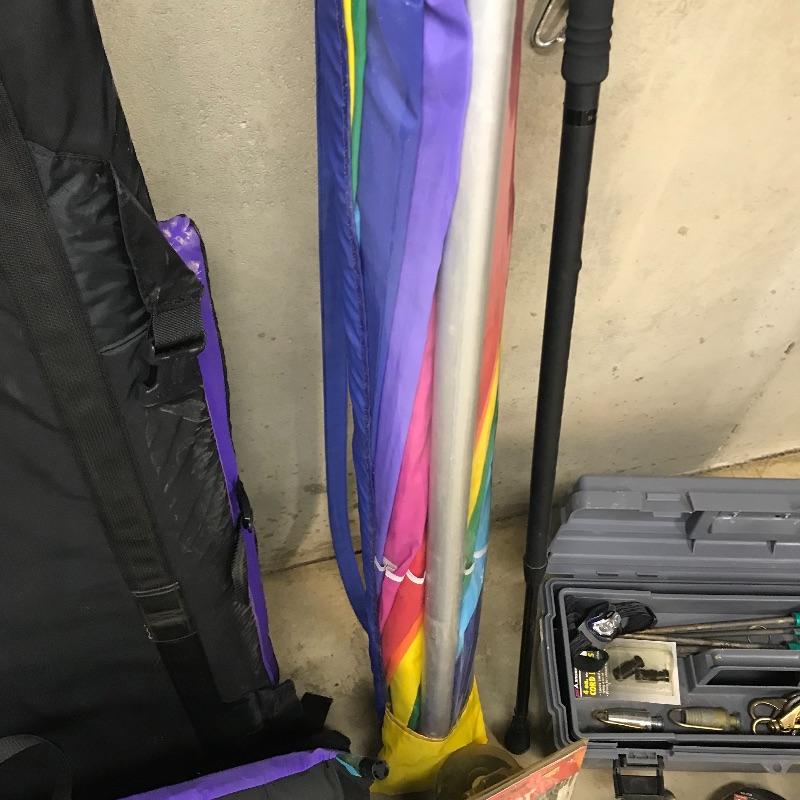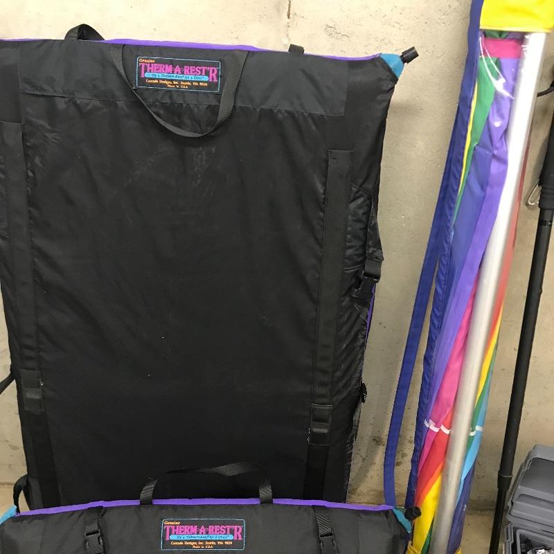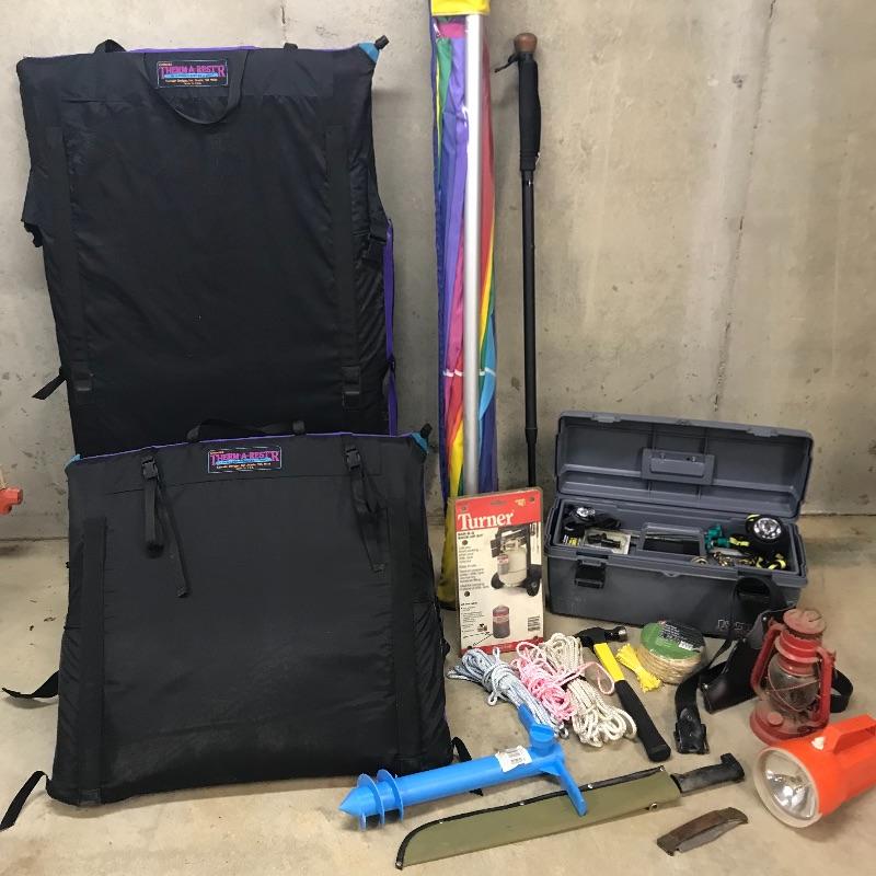 This large lot of camping gear contains many essentials you won’t want to be stuck without, such as Therma-a-Rest sleeping pads that can also be used as camp chairs, large beach umbrella with anchor, rope, hammer, supply box, head lamps, lantern, machete, walking cane, gun holster and more. See pics. Local pickup only.