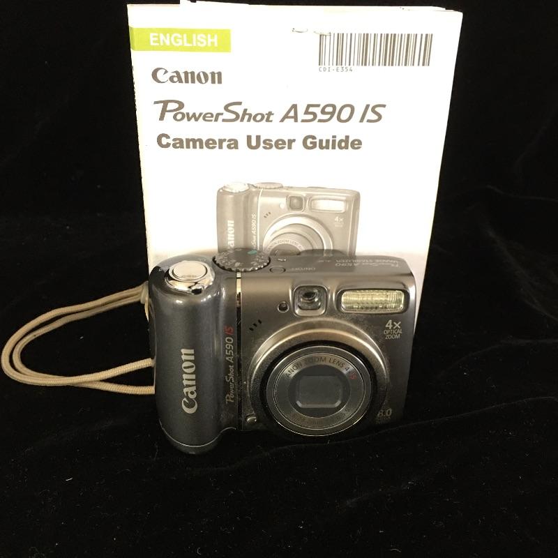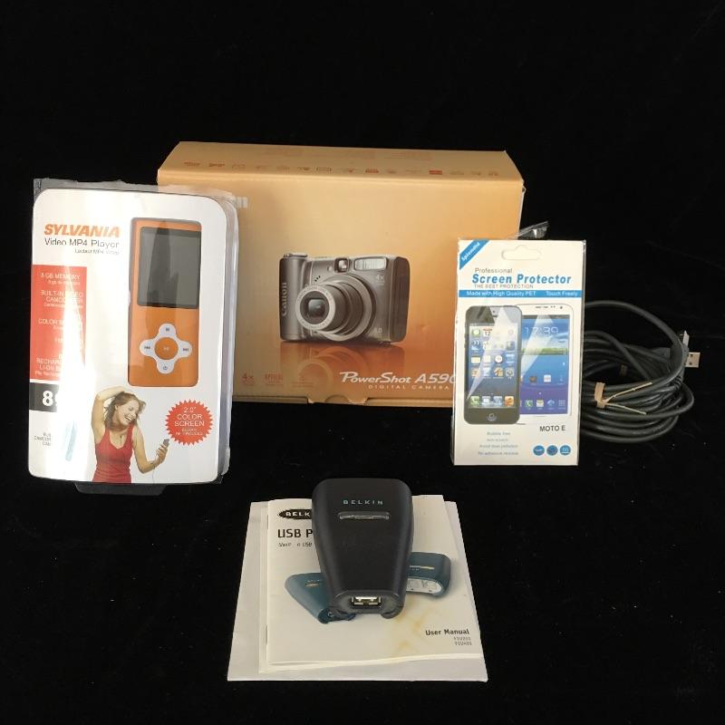 Lot includes Canon Powershot A590IS digital camera, Sylvania MP4 player, Belmont peripheral switch and two printer cables. We were not able to test items, although they appear in good condition.