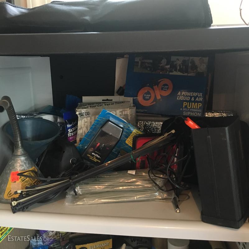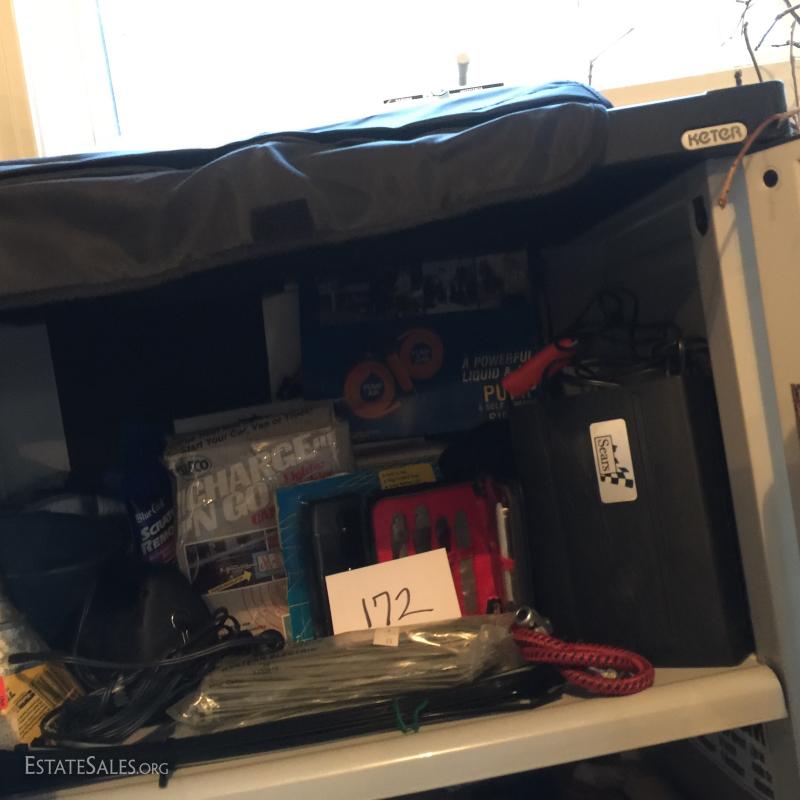 Large lot of car/automobile items to include air pump and a Keter plastic storage cabinet shelf .