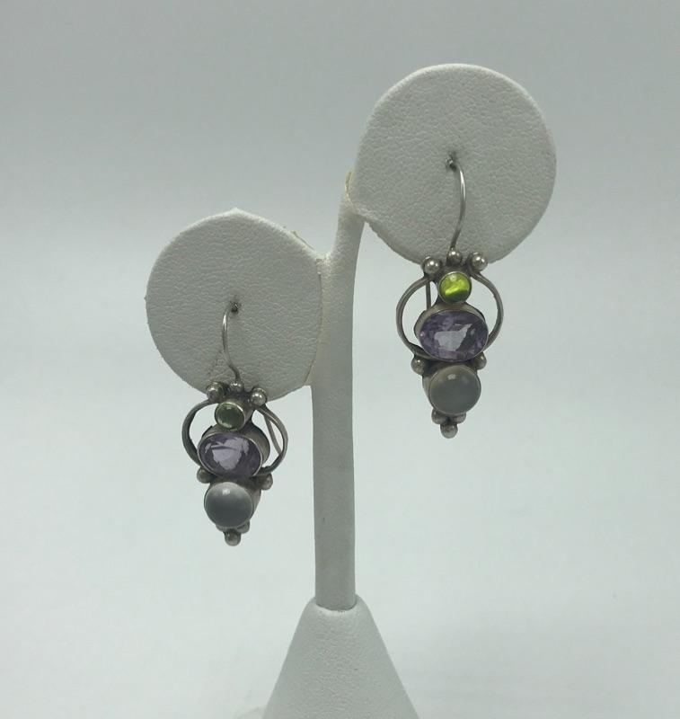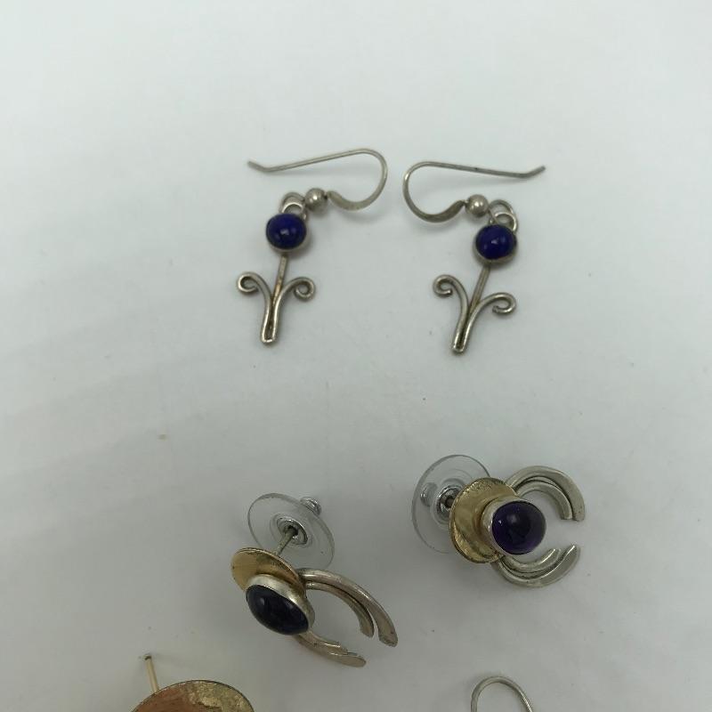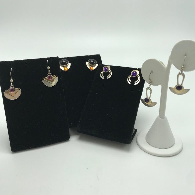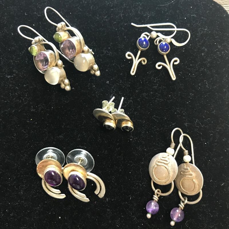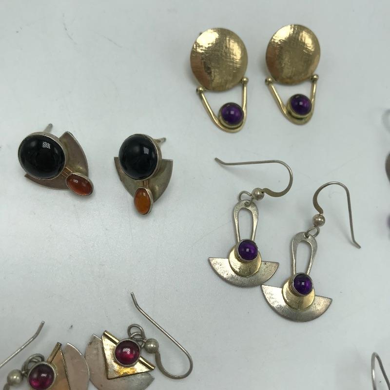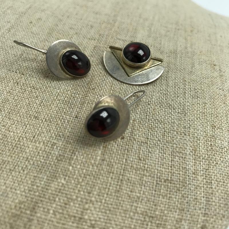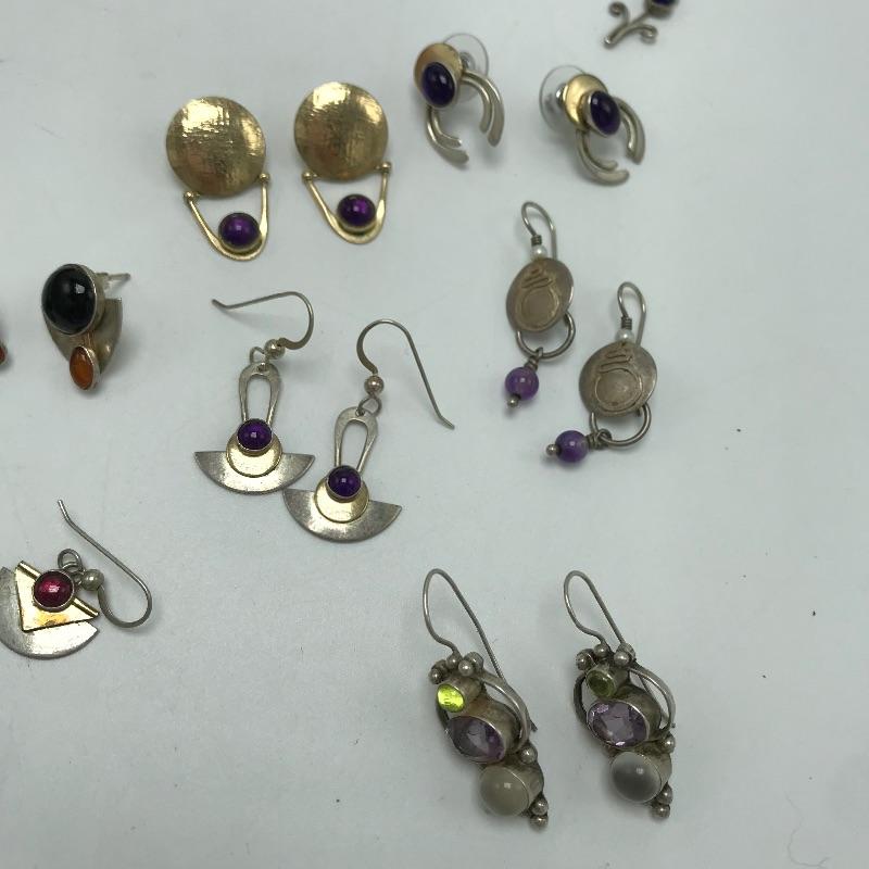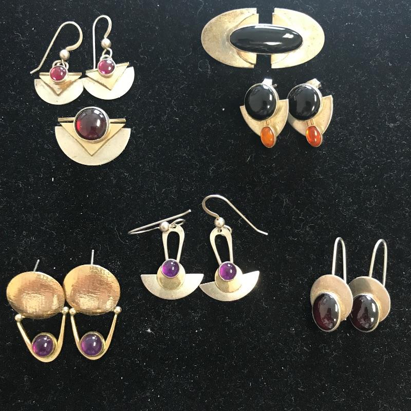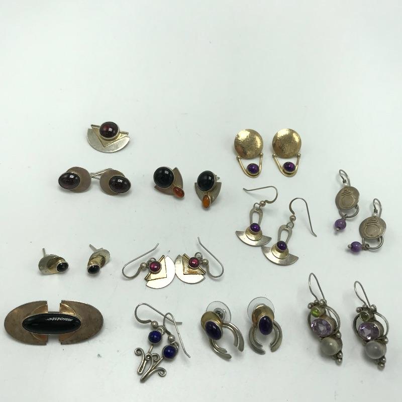 Large lot for pierced ears. One pin with an Onyx like stone can be matched to a couple different sets of earrings. Another pin/earring combo has a deep dark red stone. Lots of shapes with black, purple and red stones. No known markings found. Ten earrings and one pin and one pendant in all.