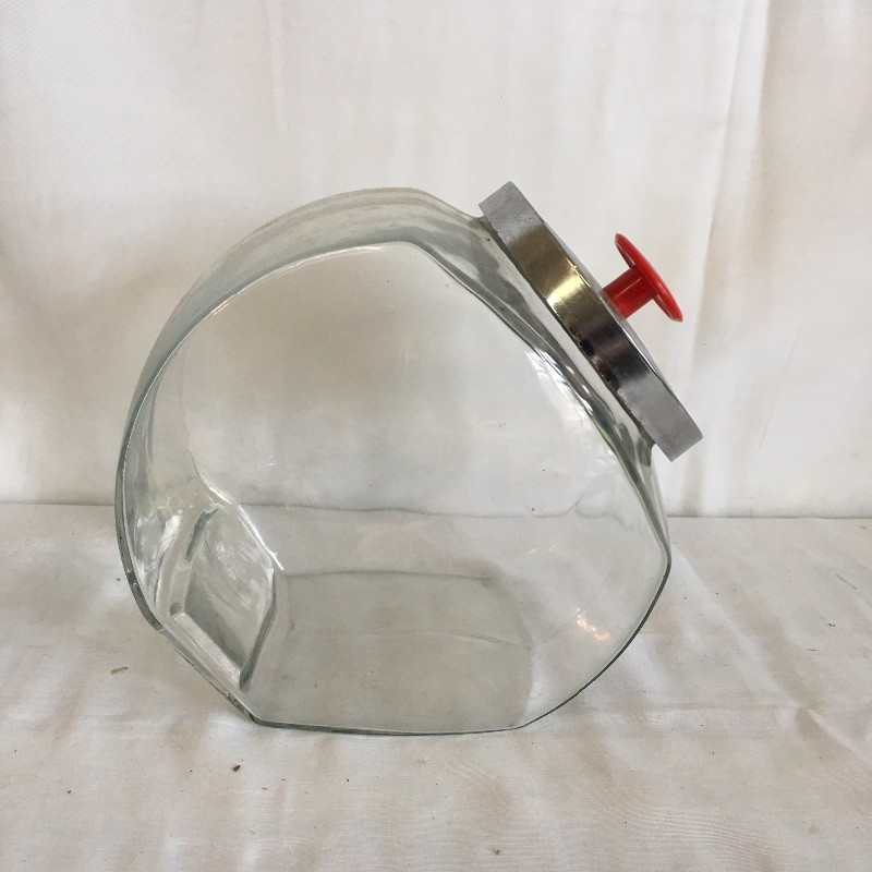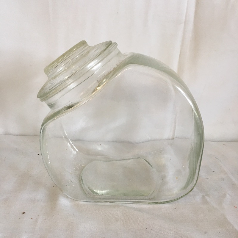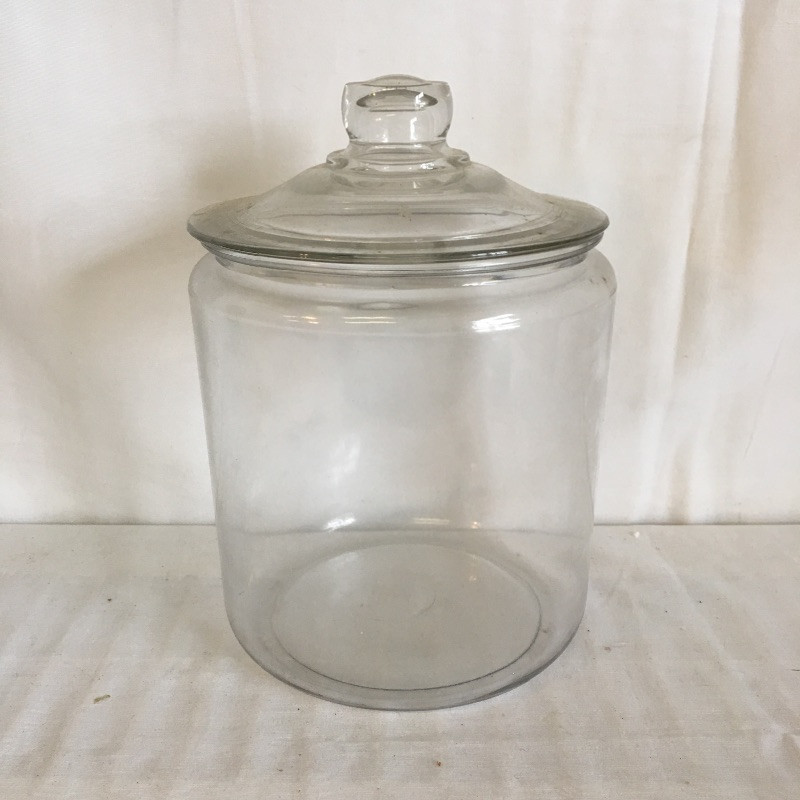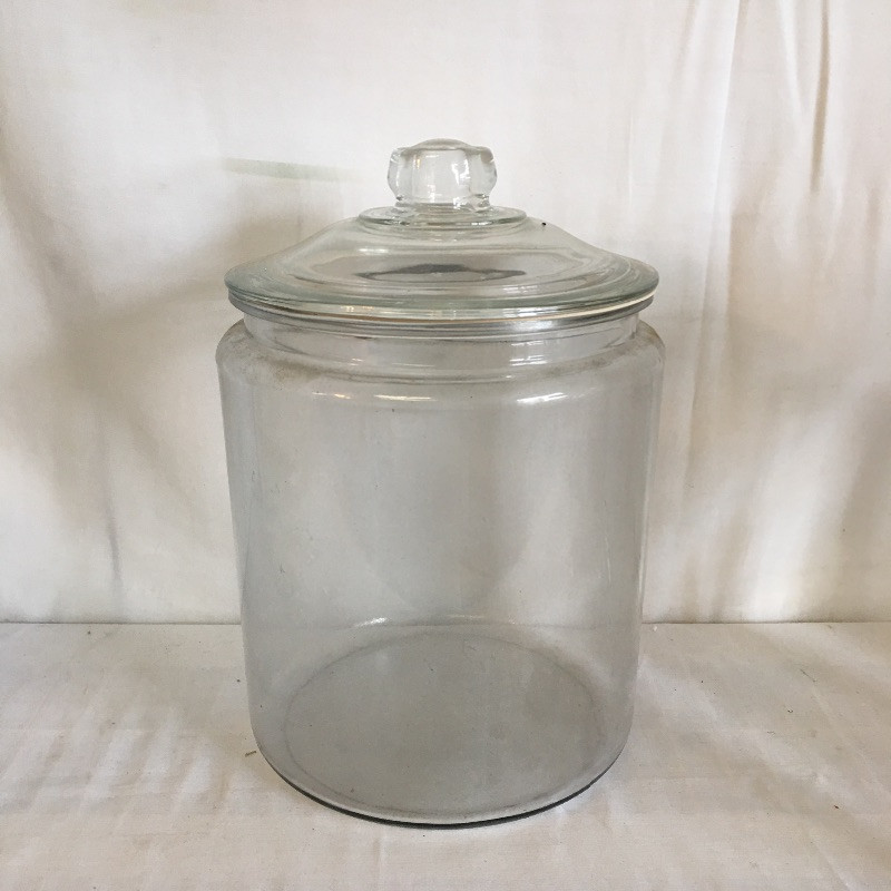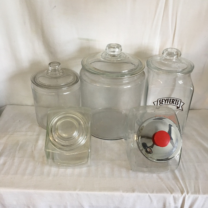 Great storage collection of five glass canisters with lids. Four of the lids are glass one is metal.