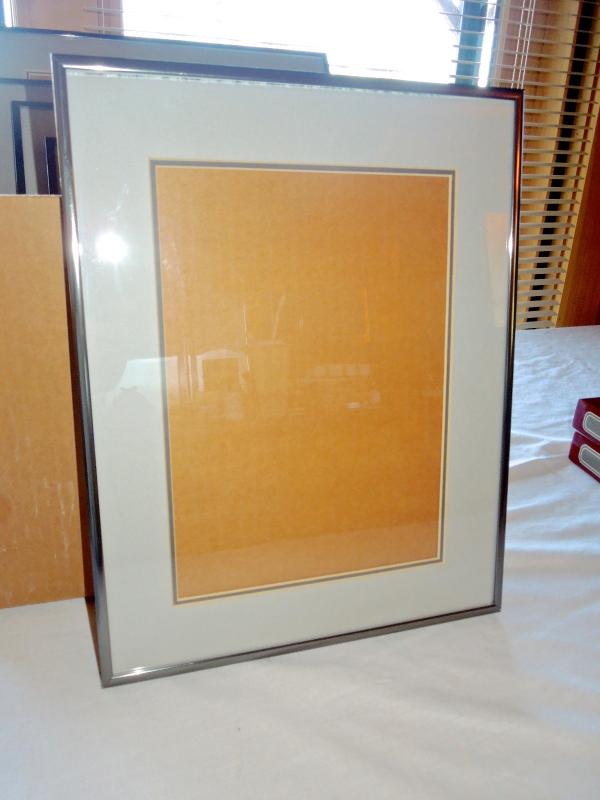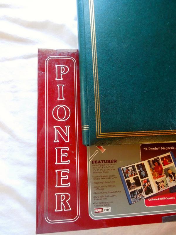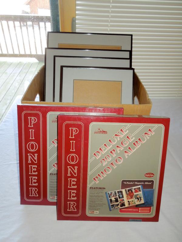 The color of frames is gunmetal. Sizes vary. Two are 14" x 12"; one is 16" x 13" and one is 15" x 17" masuring from edge of frame. Clear glass. also included are two unused leather Pioneer photo albums with 20 page inserts each. In original boxes.