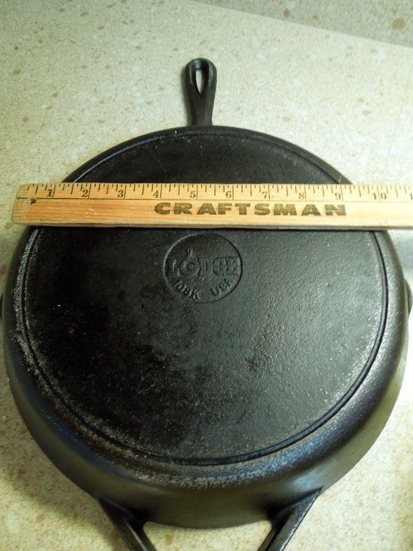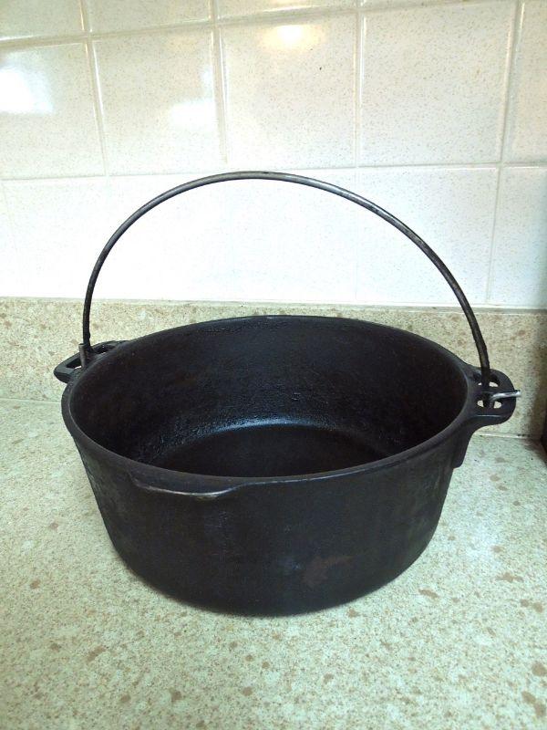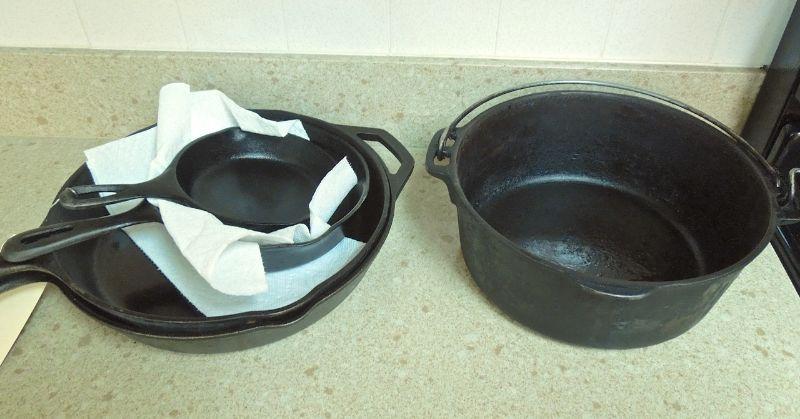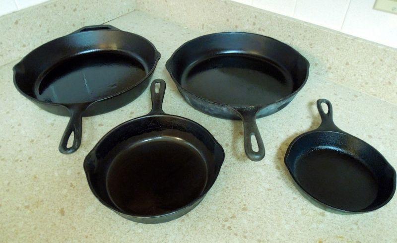 These cast iron skillets have been well seasoned and cared for. 12" and 6" Lodge; an 11" and 8" no brand; and a 5qt dutch oven with no lid.