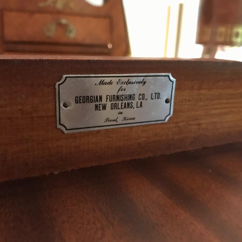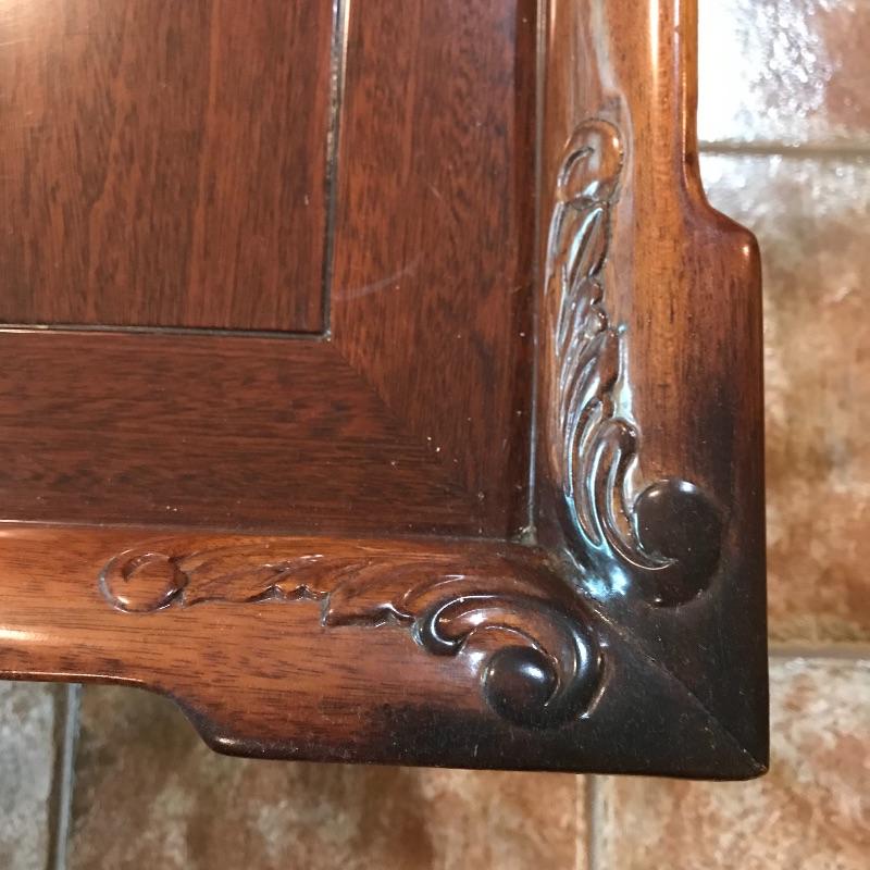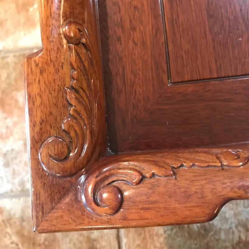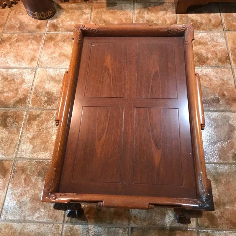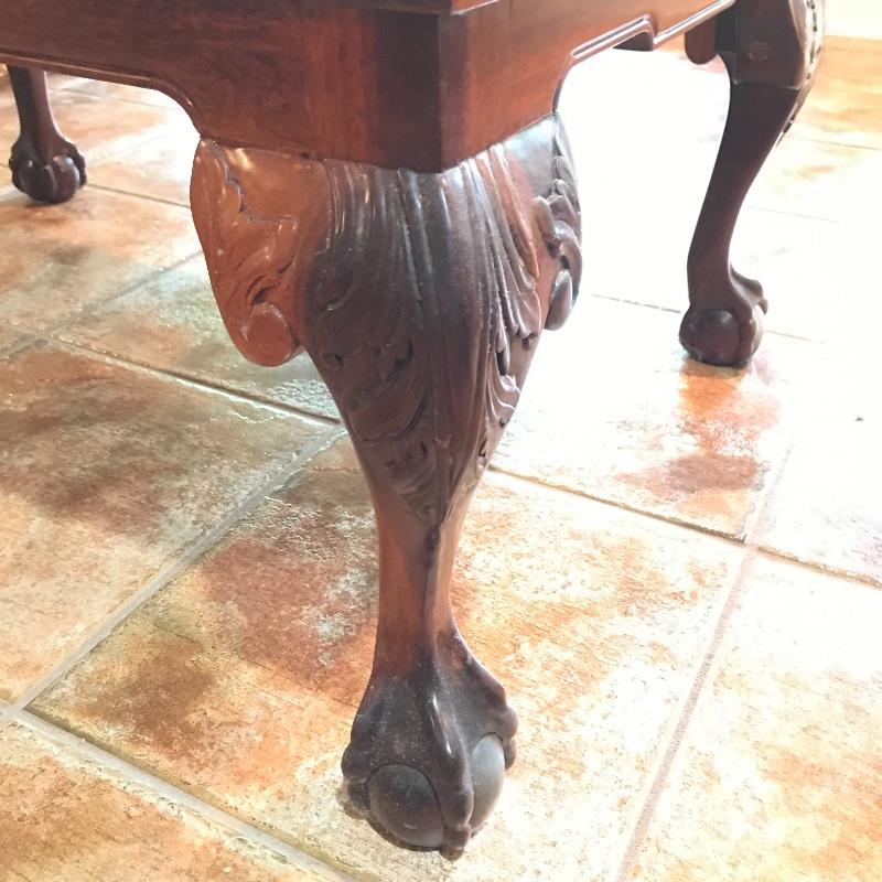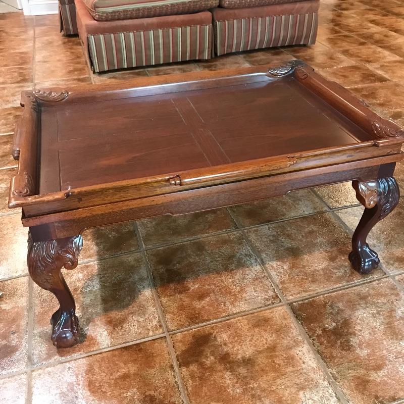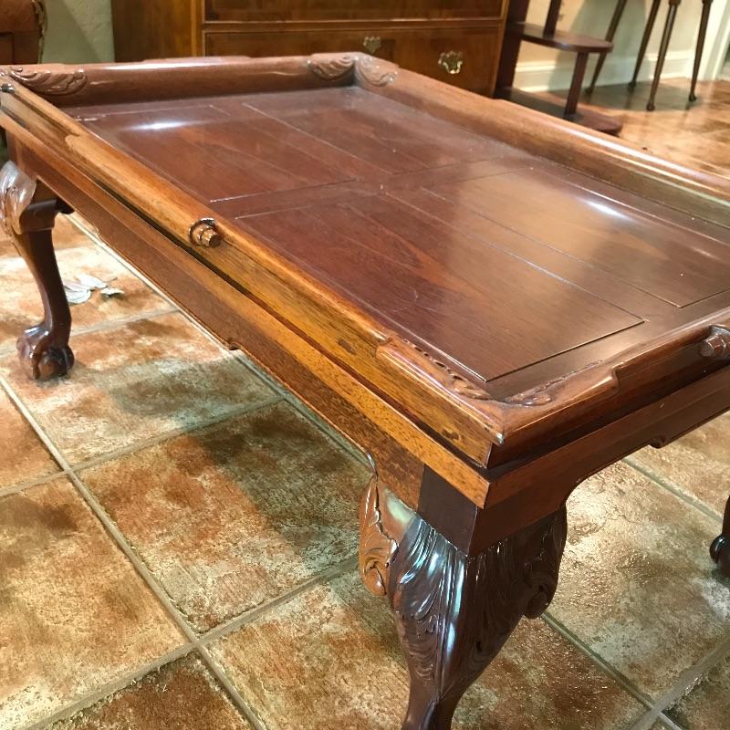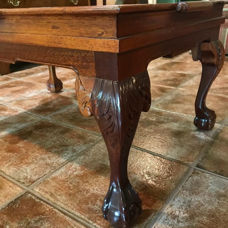 Charming Georgian Furniture Co. coffee table with recessed top. Table has claw feet and ornate designs. Table measures 37” x 25.5” x 18” and top is recessed just over 2”. There are some areas of contrasting colors. See photos.