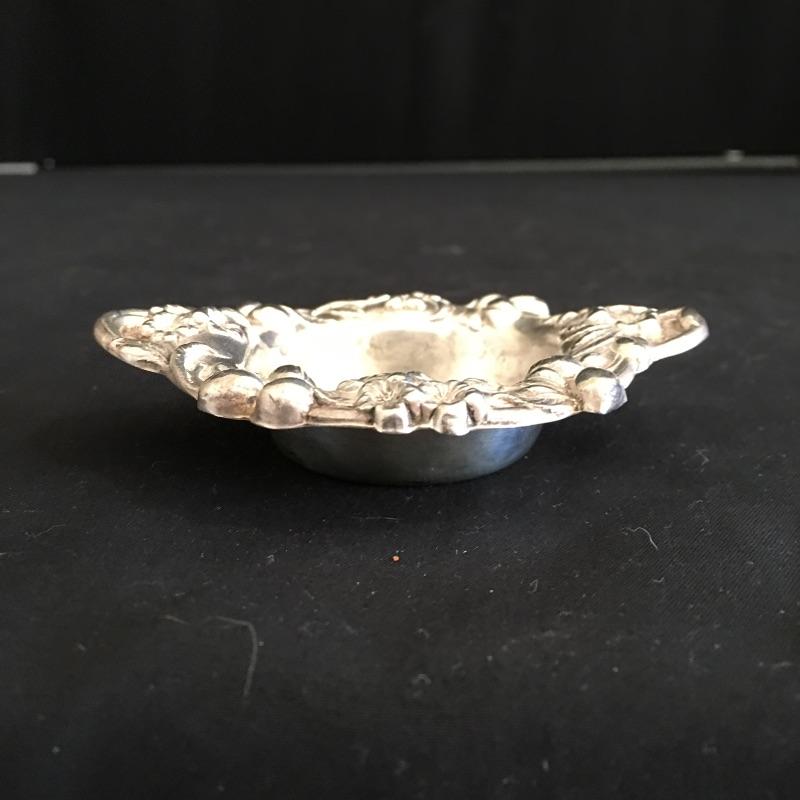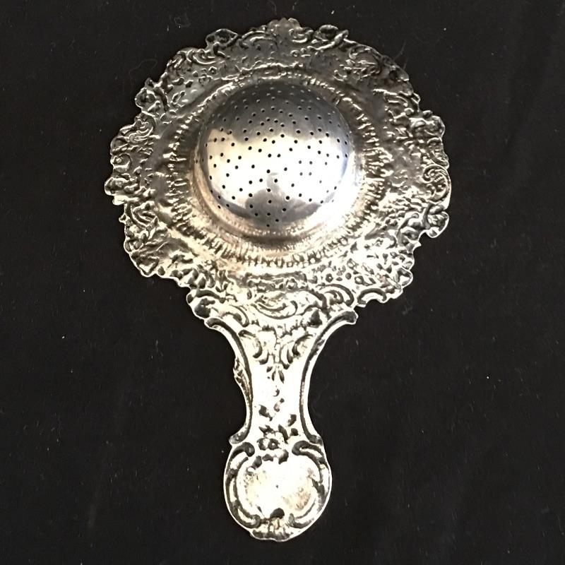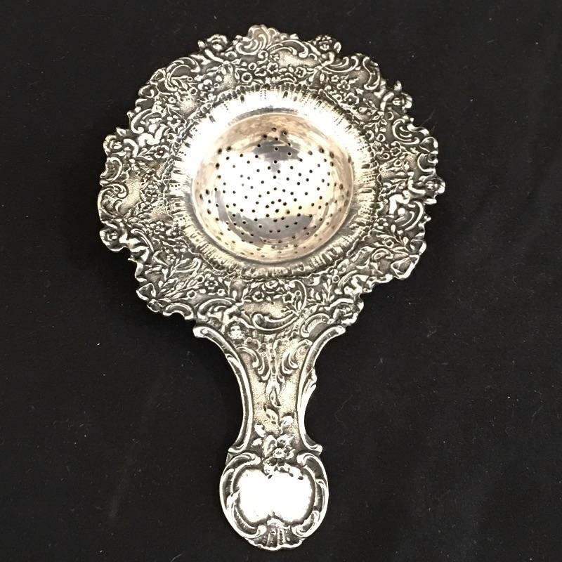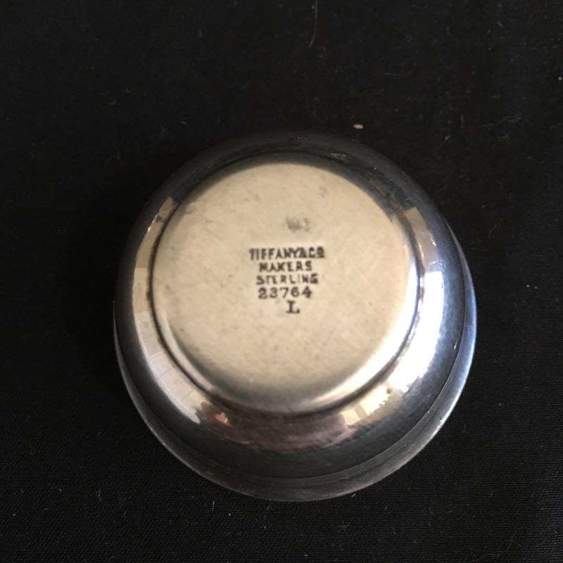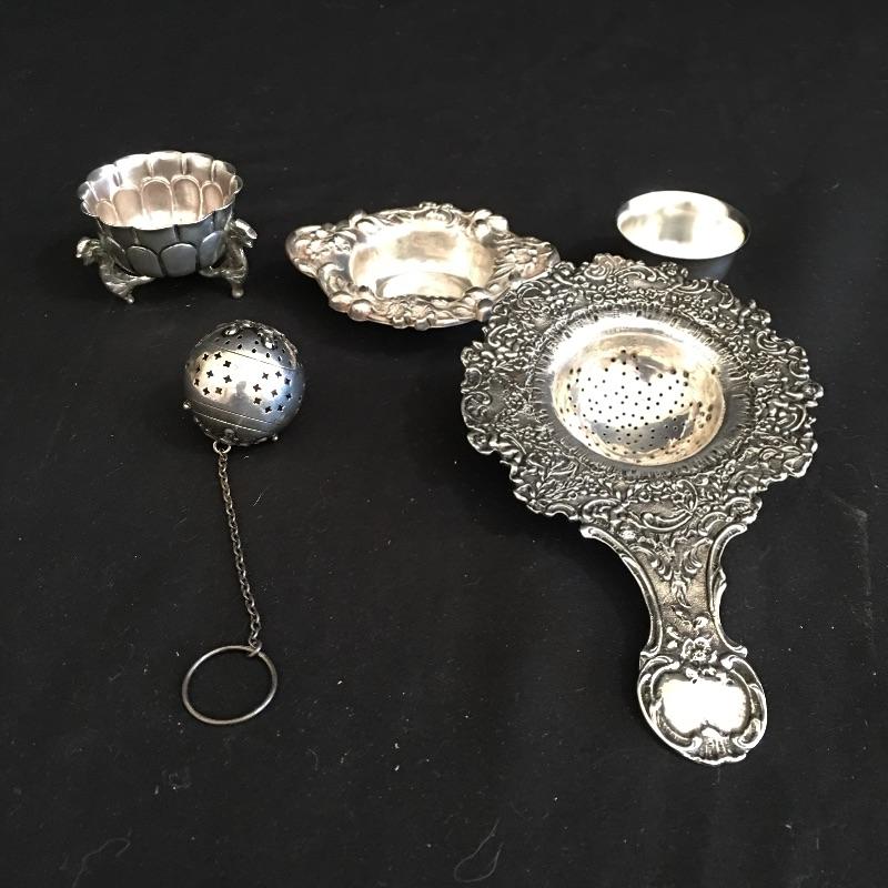 Classic mini Tiffany & Co. sterling bowl, footed sterling bowl, Reed & Barton sterling bowl, Sterling tea strainer ball and tea strainer that has markings, but no sterling mark. Tiffany bowl measures 1.75”D x .875” tall. Starting bid is close to melt value.