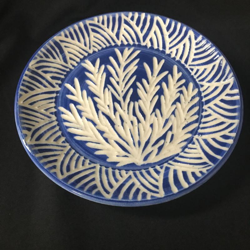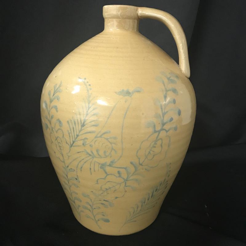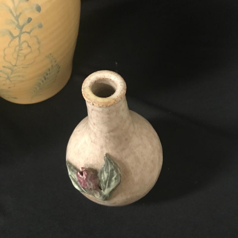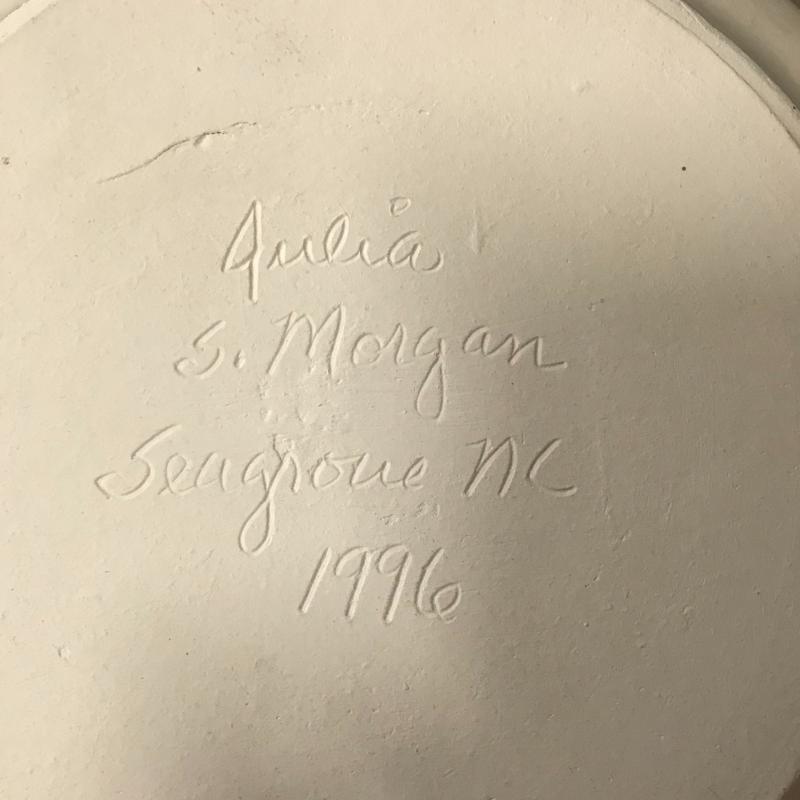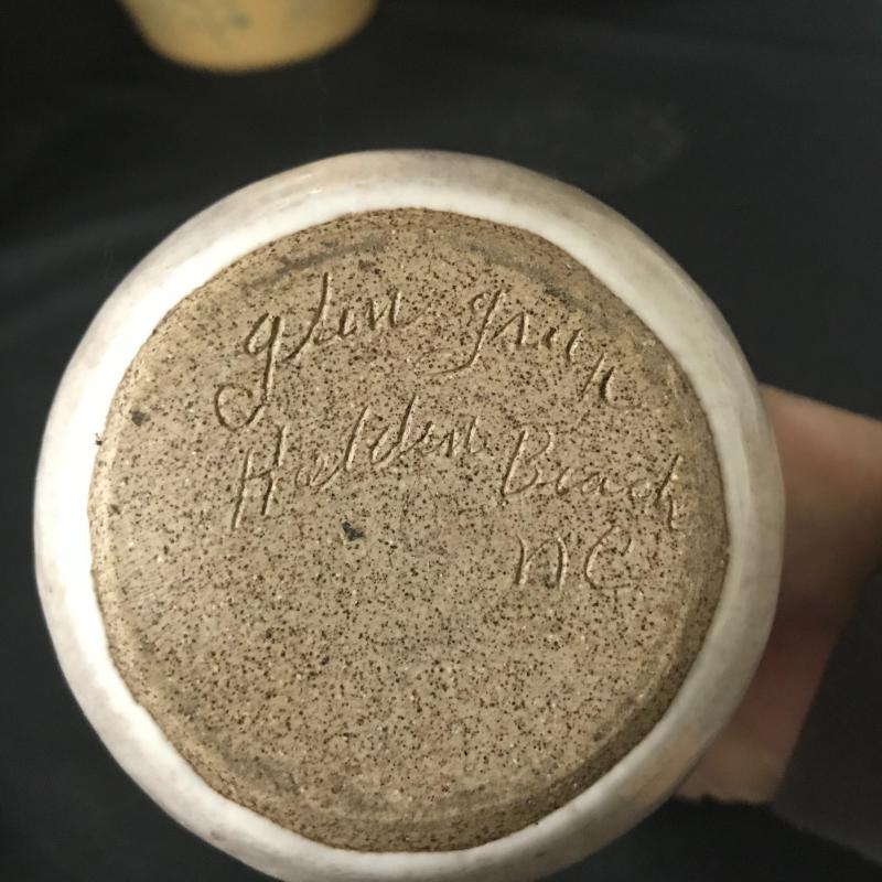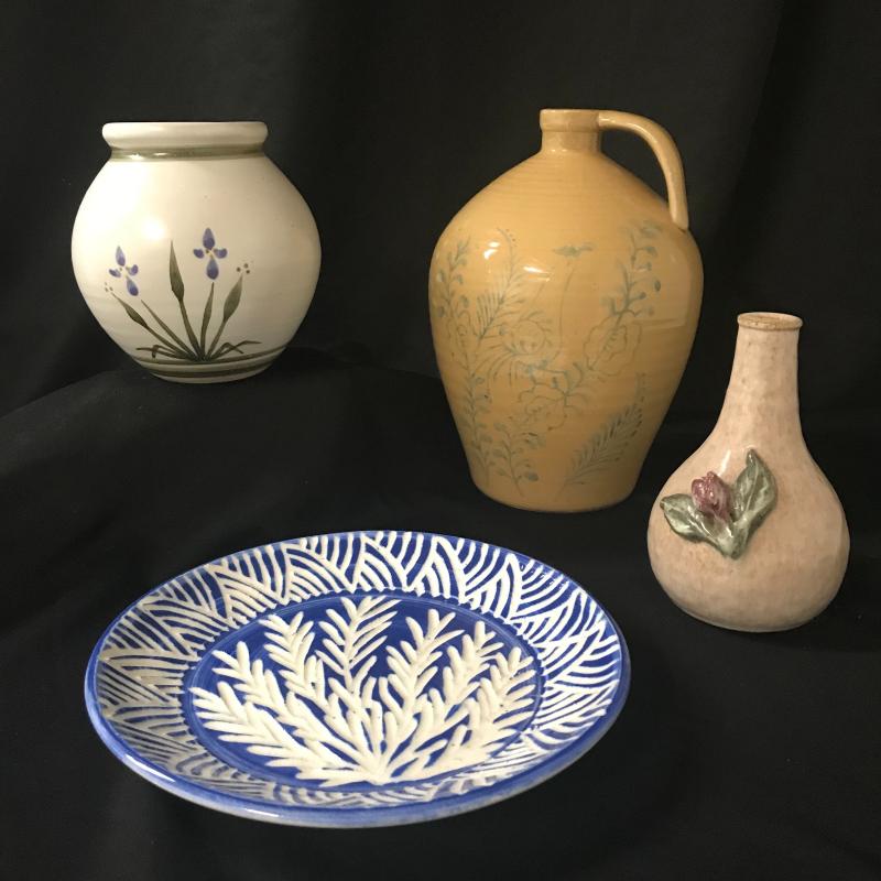 Small stoneware Vase by Whynot Pottery from Whynot, NC stands aprox. 6” tall. Blue and white decorative plate measures 9” dia. and is made by Julia Morgan from Seagrove, NC dated 1996. Small bud vase with flower overlay pottery made in Holden Beach, NC (artist unidentifiable), piece stands 6”. Yellow jug pottery stands 10” tall. This lot is available for shipping or local pick up in Asheville, NC.