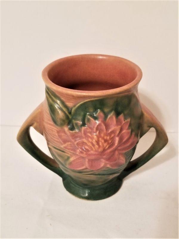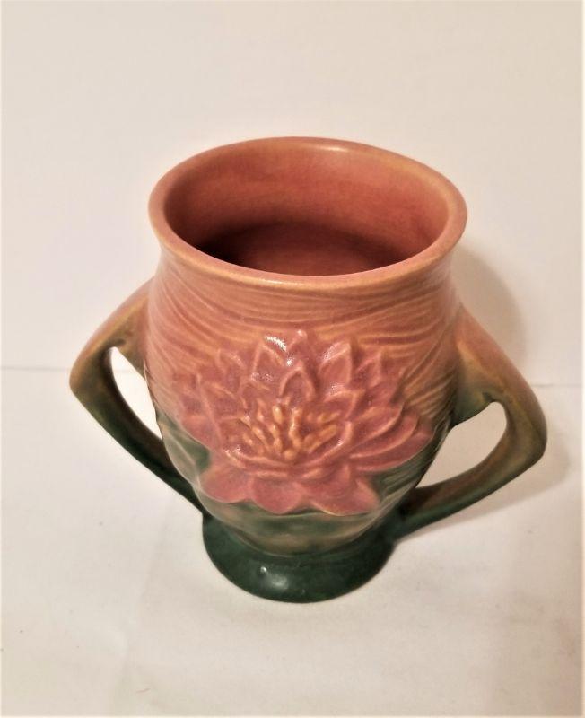 Vintage Roseville pottery vase in the Water Lilly pattern - stands 4" tall. Good condition.