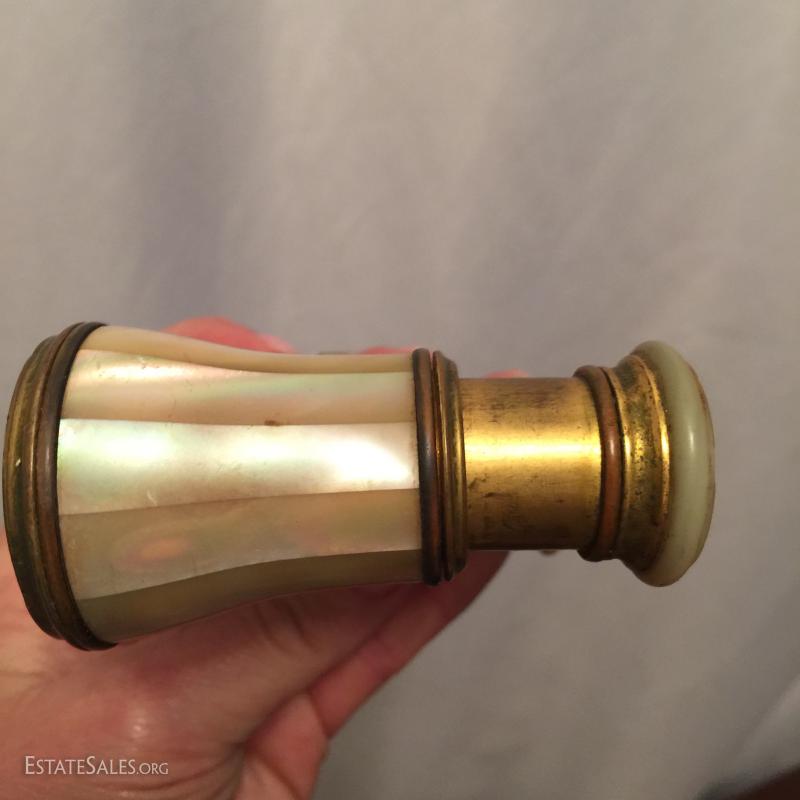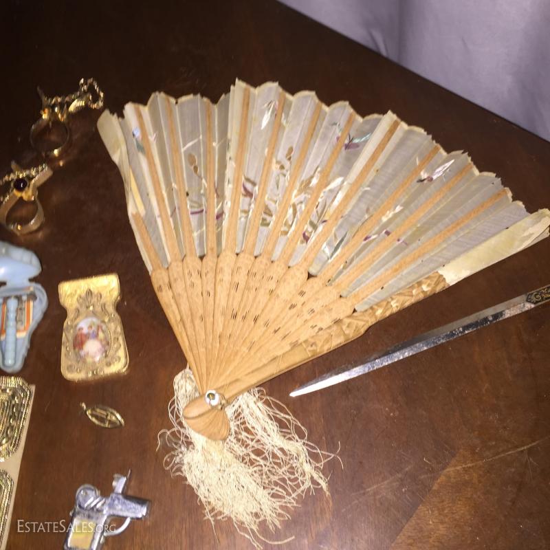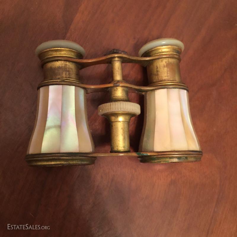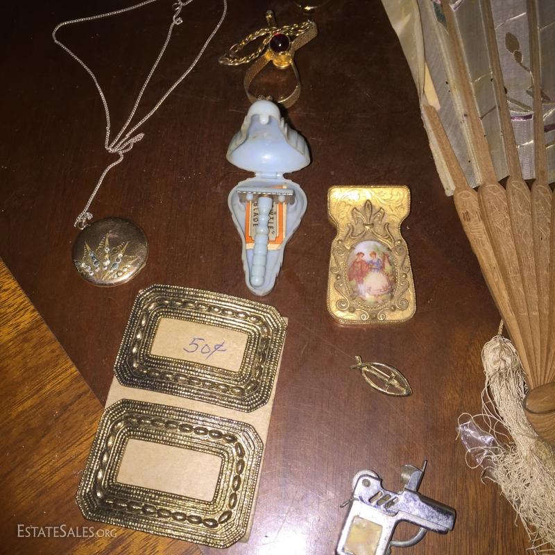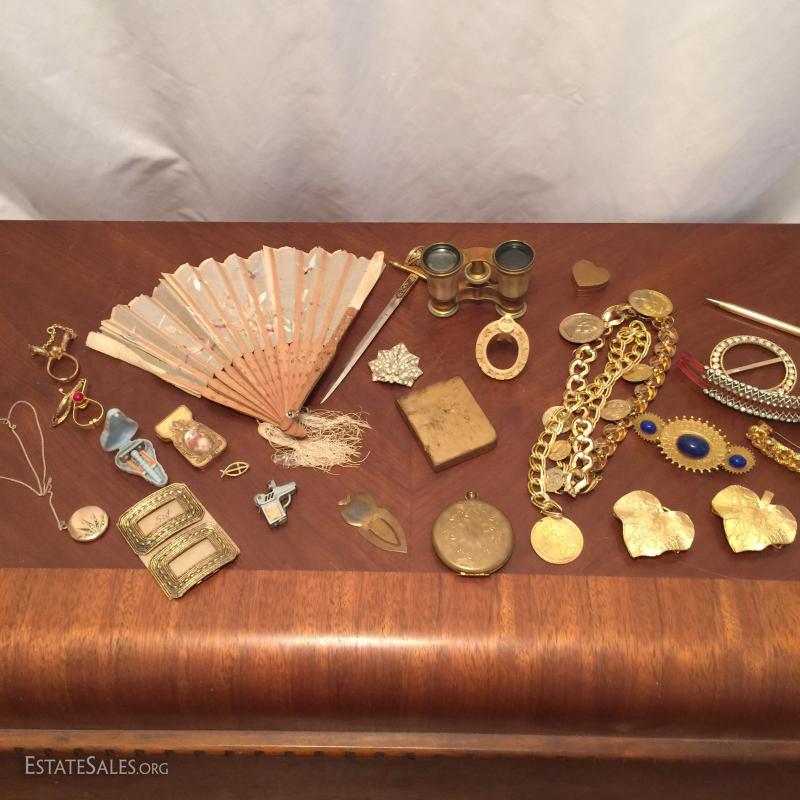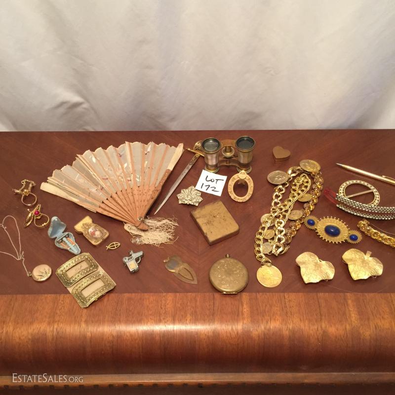 Lot includes mother of pearl opera glasses, delicate fan, hair clips, gold toned compacts, letter opener, and more. See photos. Shipping is available for this item or local pick up in Saluda, NC