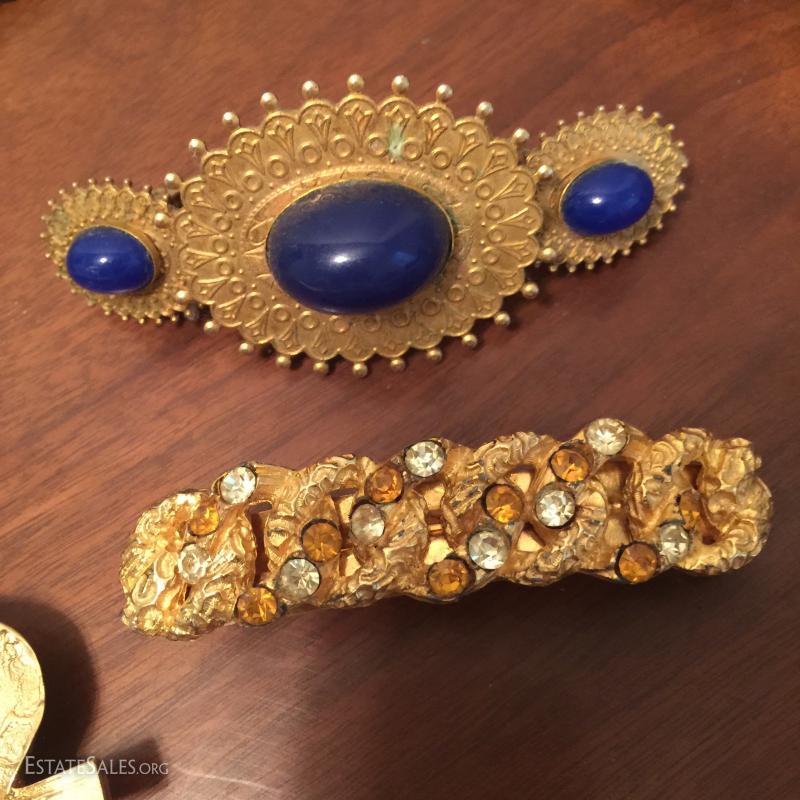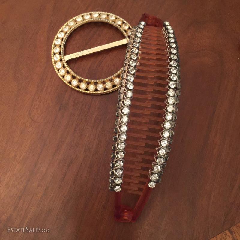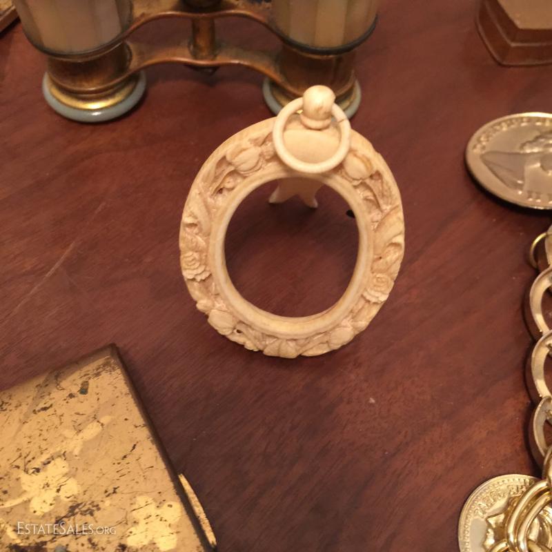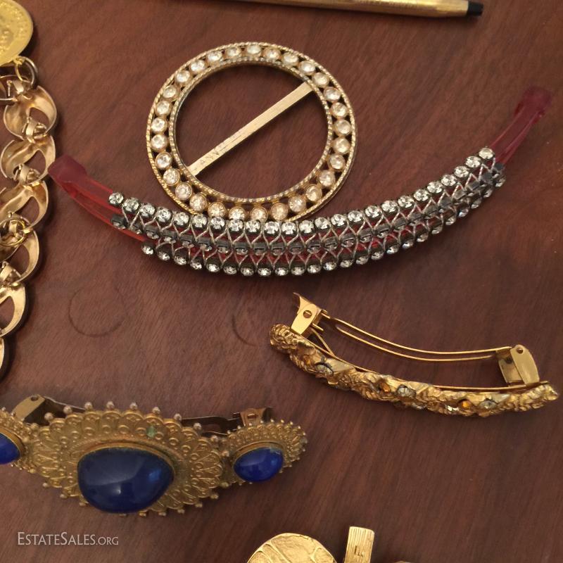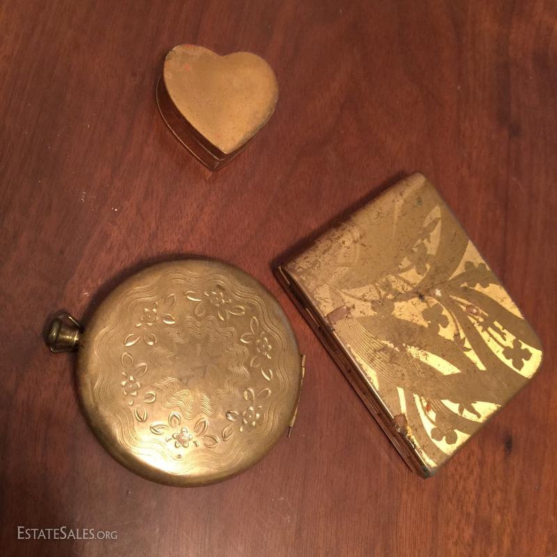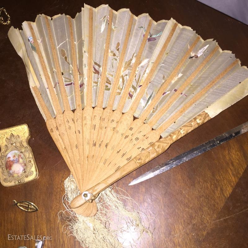 Lot includes mother of pearl opera glasses, delicate fan, hair clips, gold toned compacts, letter opener, and more. See photos. Shipping is available for this item or local pick up in Saluda, NC