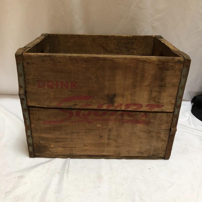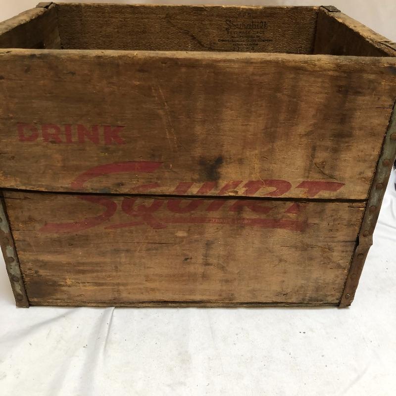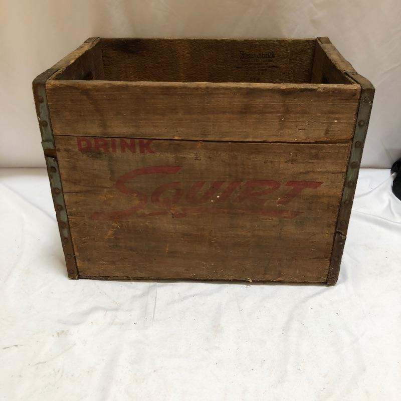 This wooden Squirt soda case is still sturdy after all these years. Case shows wear and tear but is still a solid piece, see pictures.